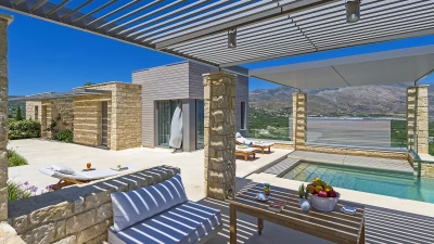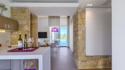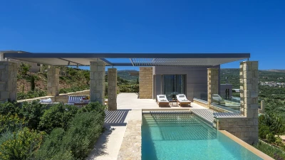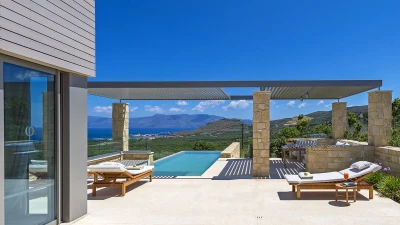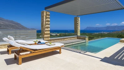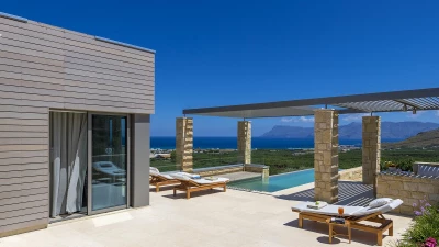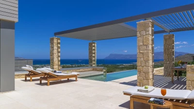 Perched on a serene hillside with panoramic views over Kissamos Bay, Deep Blue Villa combines effortless accessibility with contemporary style and tranquil privacy. This exceptional one-bedroom retreat is designed for ease, with all living spaces and the private infinity pool on a single level, connected by a wheelchair-friendly pathway through lush gardens to the parking area.