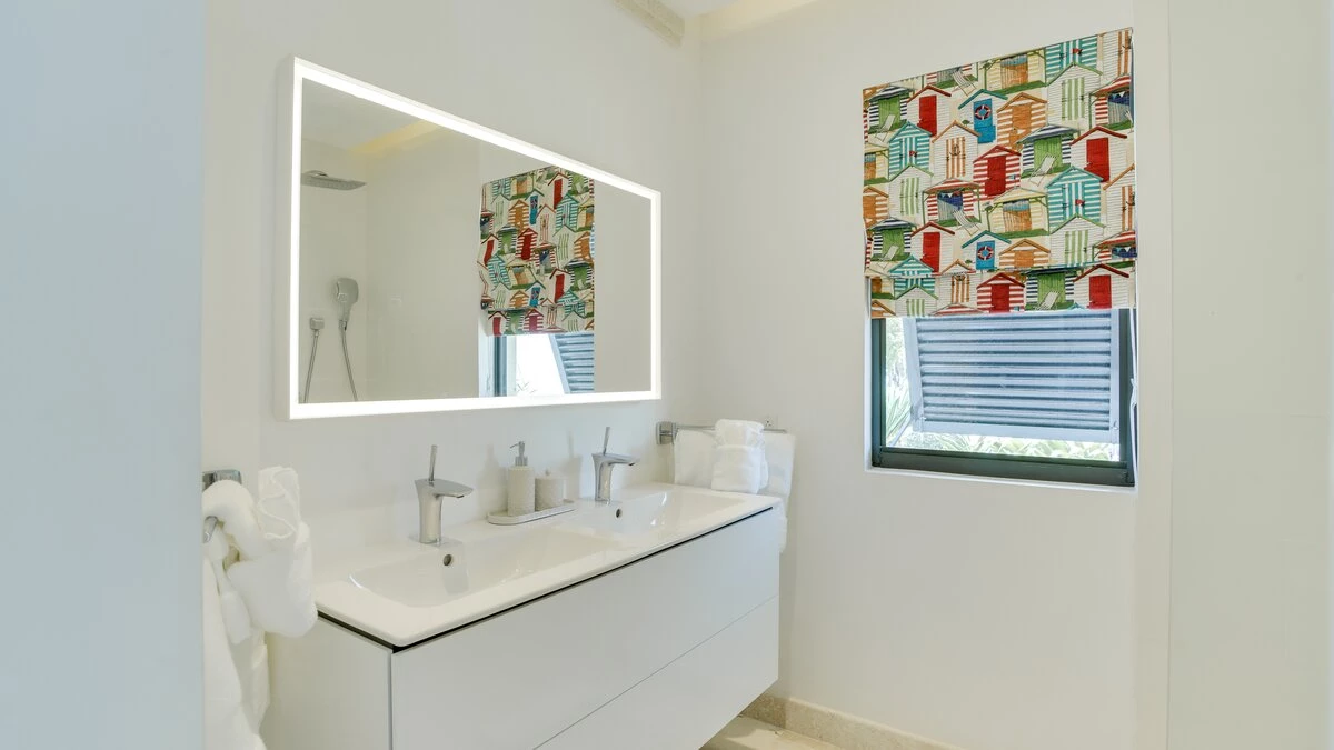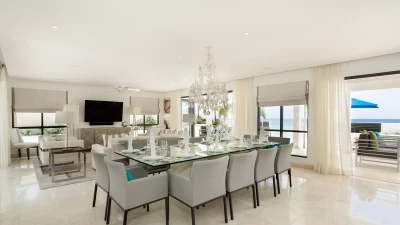 Accommodation is across two spacious floors, with the ground floor ideally designed for open plan living. Decorated in neutral tones to compliment the sea views, a large living area with cool marble tiles and opulent chandeliers has room for indoor relaxation, a large glass dining table and a fully-equipped kitchen with a breakfast bar. Large glass doors open onto the huge terrace. Guests may choose to relax on comfortable seating in the shade, relax by the pool or dine al fresco whilst admiring the stunning sea view.