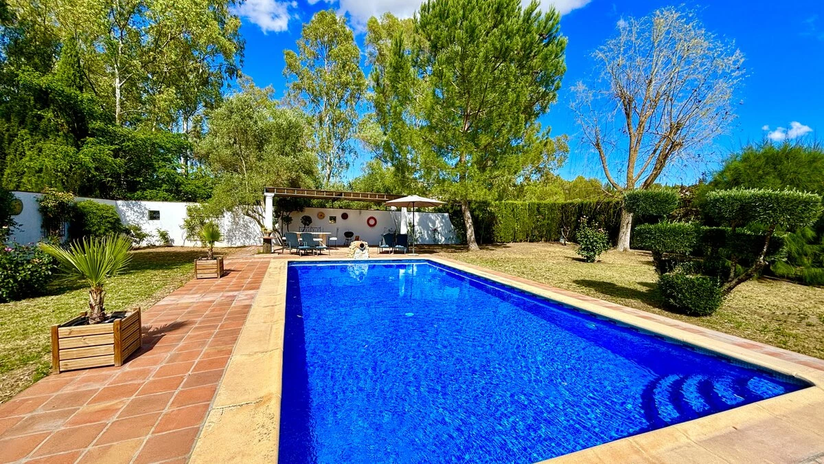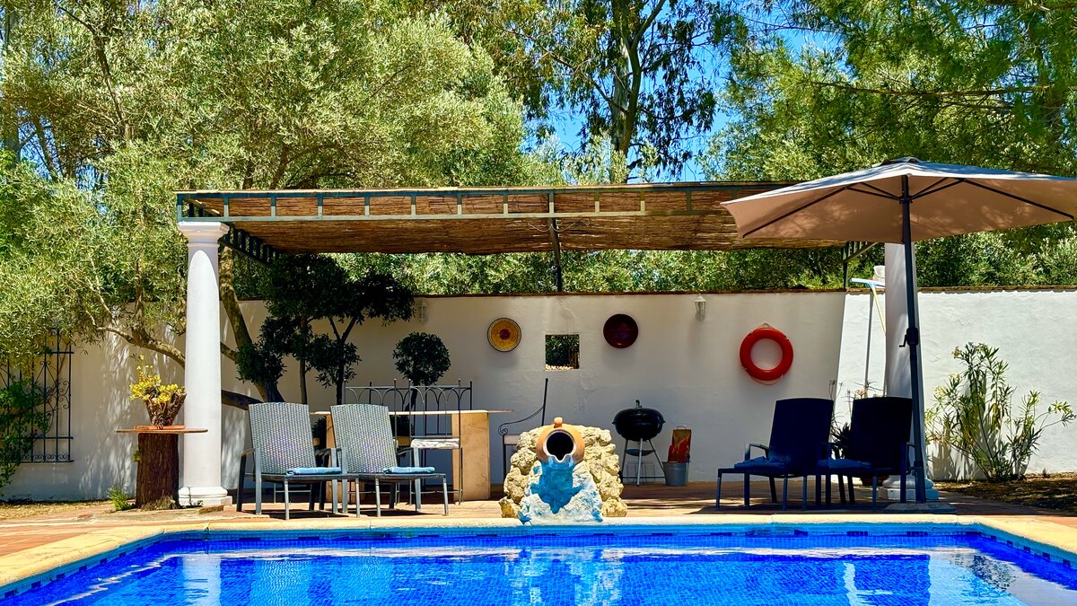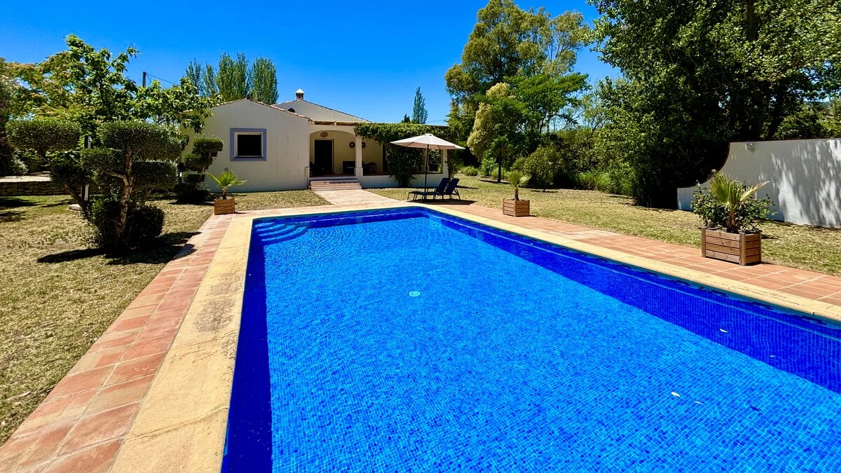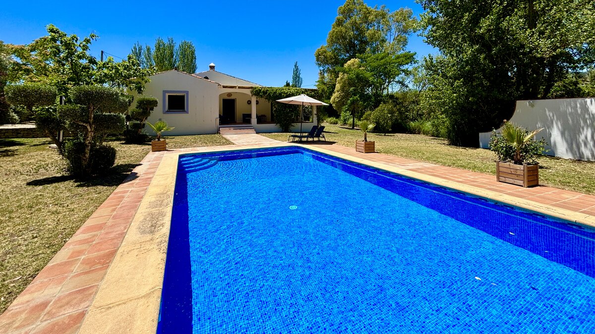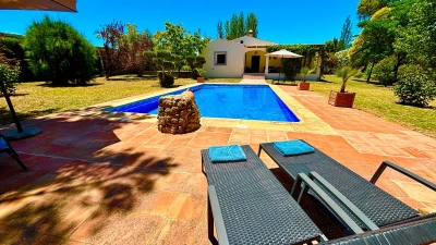 Well-kept lawns and graceful trees surround this cheerful family villa, forming a natural cushion of privacy and framing an inviting ten meter swimming pool. At one end of this, a lovely poolside pergola provides a shady space for long and leisurely al fresco lunches. At the other end is the villa itself, raised a few steps above the garden and opening on to a second dining or sun-downer terrace. Simply furnished, with an open-plan sitting/dining room, and three en suite bedrooms, El Laurel is certainly large enough to comfortably accommodate a family, yet its intimate and informal atmosphere makes it equally attractive as a hideaway just for two. It shares three acre grounds with the smaller villa La Rondita and large Finca la Alameda house if confirmed in conjunction. Booked together with one (or both) of these, it becomes a fine choice for two families or a group of friends holidaying together, and cook service could be the icing on the cake. Rural but not remote, the villa is just 5km from Ronda.