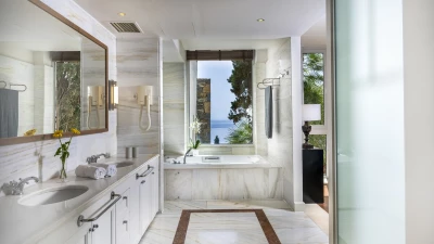 Individually styled, the sophisticated Spa Villas each feature luxurious marble bathrooms with Jacuzzi tubs, a fully equipped kitchen, and an elegant living room with doors to a sea-view furnished terrace. These one bedroom villas also have a private gym room, sauna and steam bath, and an infinity pool with a Jacuzzi and a jet to swim against. Diving lessons in the villa pool, cook service and in-villa massage can all be arranged locally.
