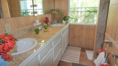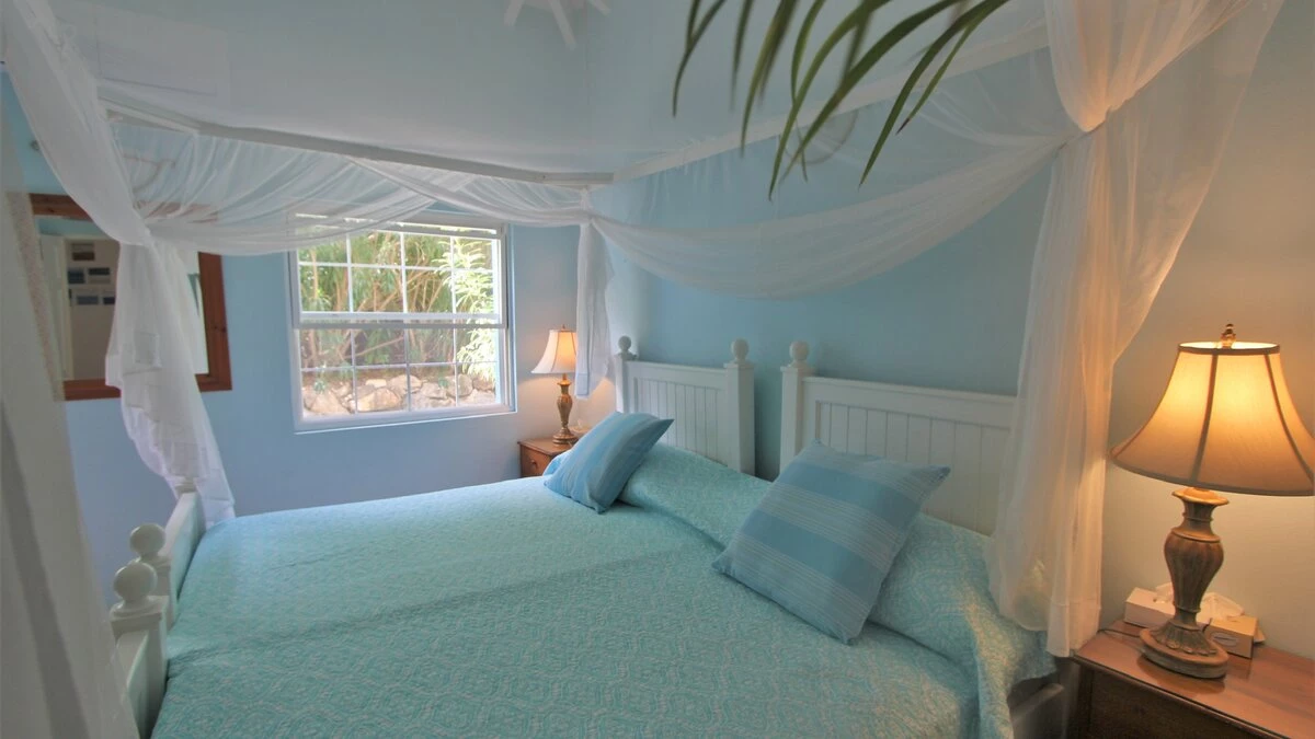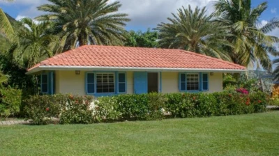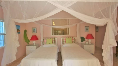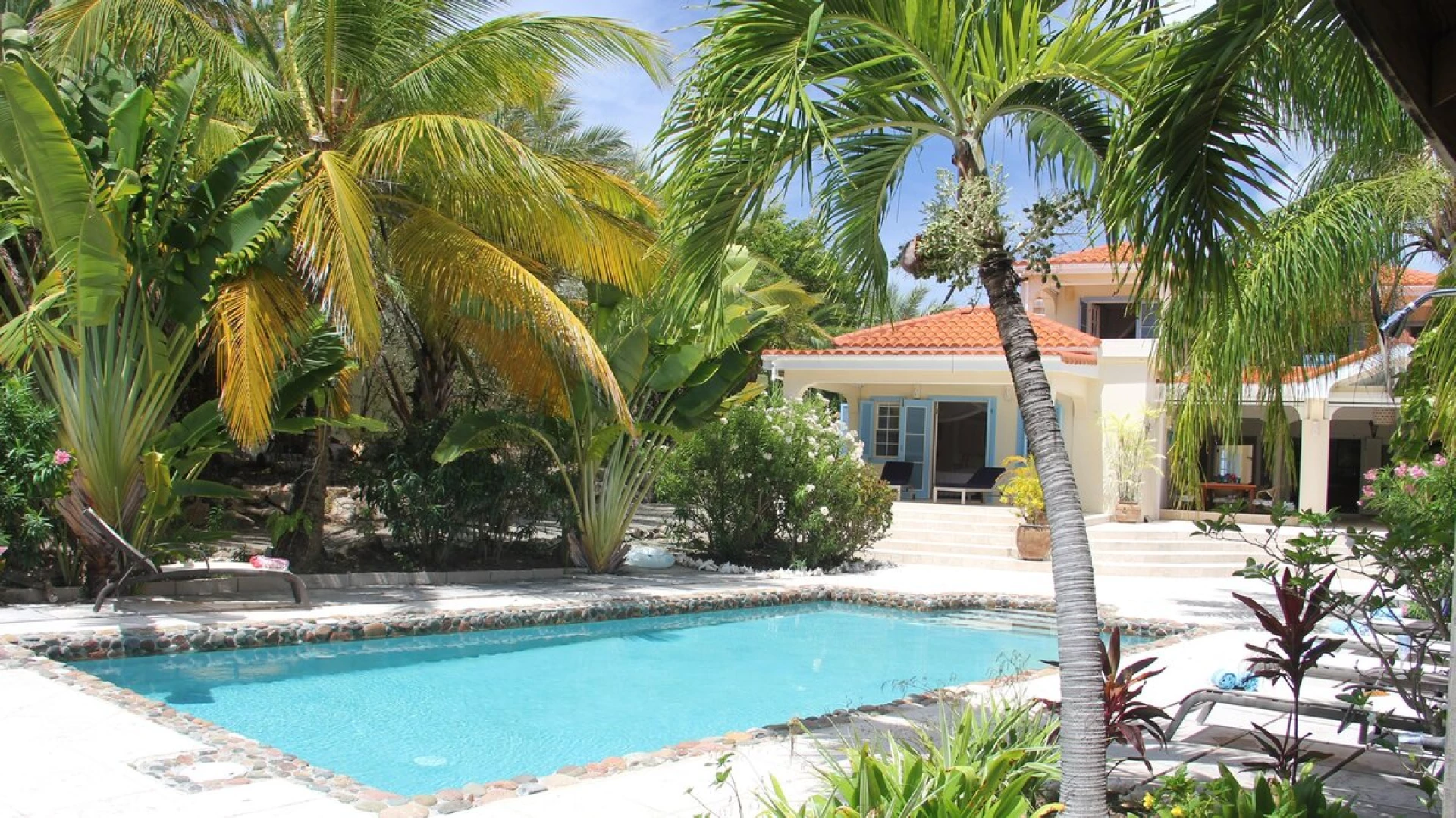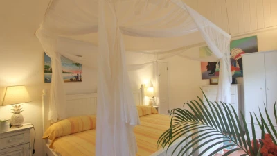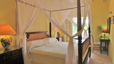 Poised between palm trees, a charming cottage sits in the grounds, painted picture card yellow with blue shutters. One bedroom with bath and shower room en suite is nested away here.