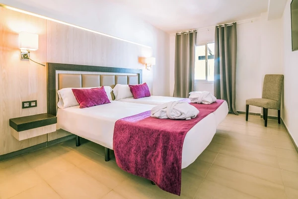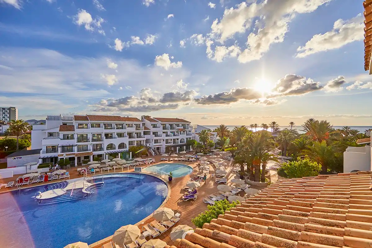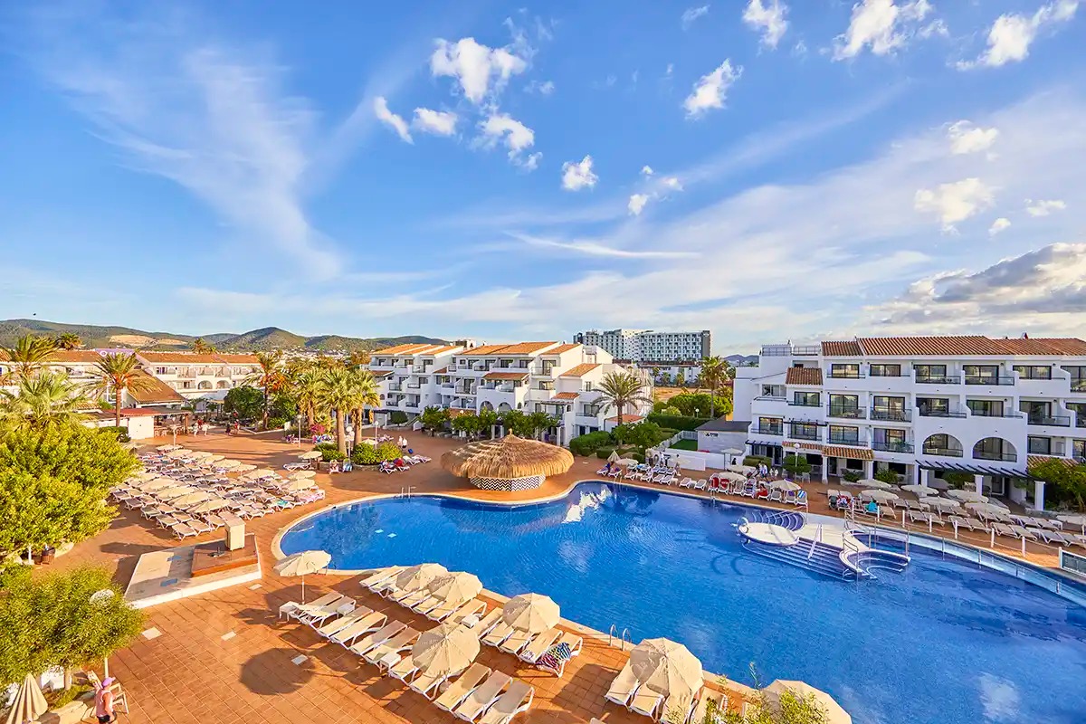 Fergus Style Bahamas sits directly on Playa d‘en Bossa, giving guests immediate beach access alongside landscaped gardens and a spacious outdoor pool.