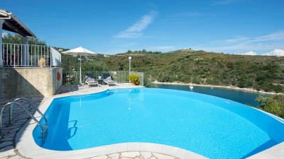 The location is private and peaceful, almost at the tip of an olive grove promontory, with gorgeous views straight out to sea and back down the bay to the village, and with an air of wonderfully undisturbed idleness. Yet this pretty pink villa is just a ten minute stroll from the shops, beach and waterfront restaurants of little St Stephano, and a short drive from tennis in Kassiopi and excellent water sports on Kalami’s broad bay. A fine choice for a family holiday, the single storey villa has one double and two twin bedrooms, each with air conditioning.The open-plan kitchen /living room is a very sociable space, opening on to a shaded veranda which forms an al fresco dining room. And a flight of steps leads down from here to a beautiful, eight metre infinity pool, sunk into a stone paved sun terrace with uninterrupted sea-views.Fotoula shares the headland with two sister-villas, Eftihia and Stephanos, both of which also feature in the CV Villas portfolio.