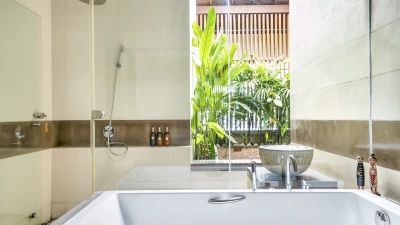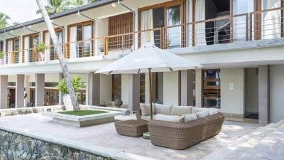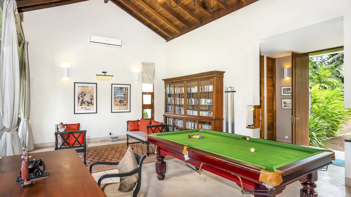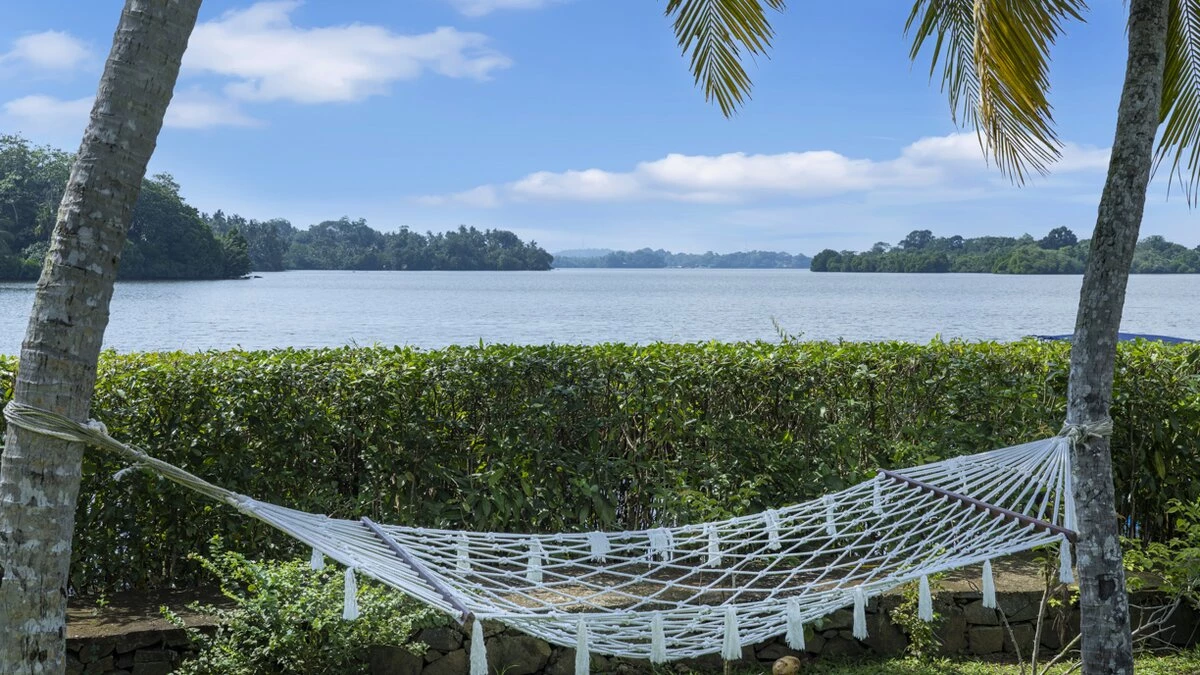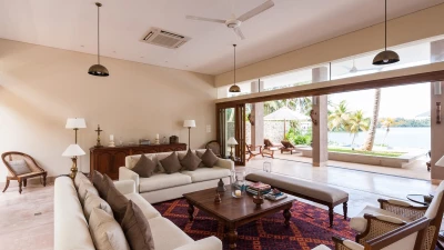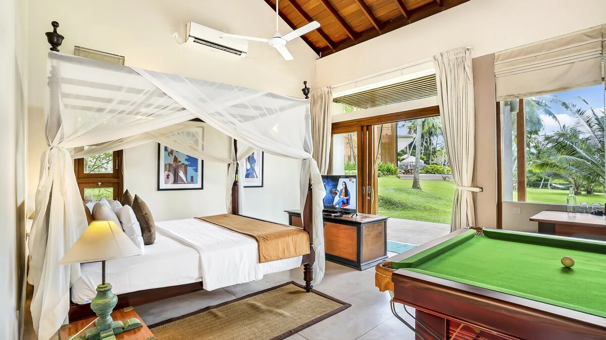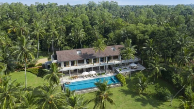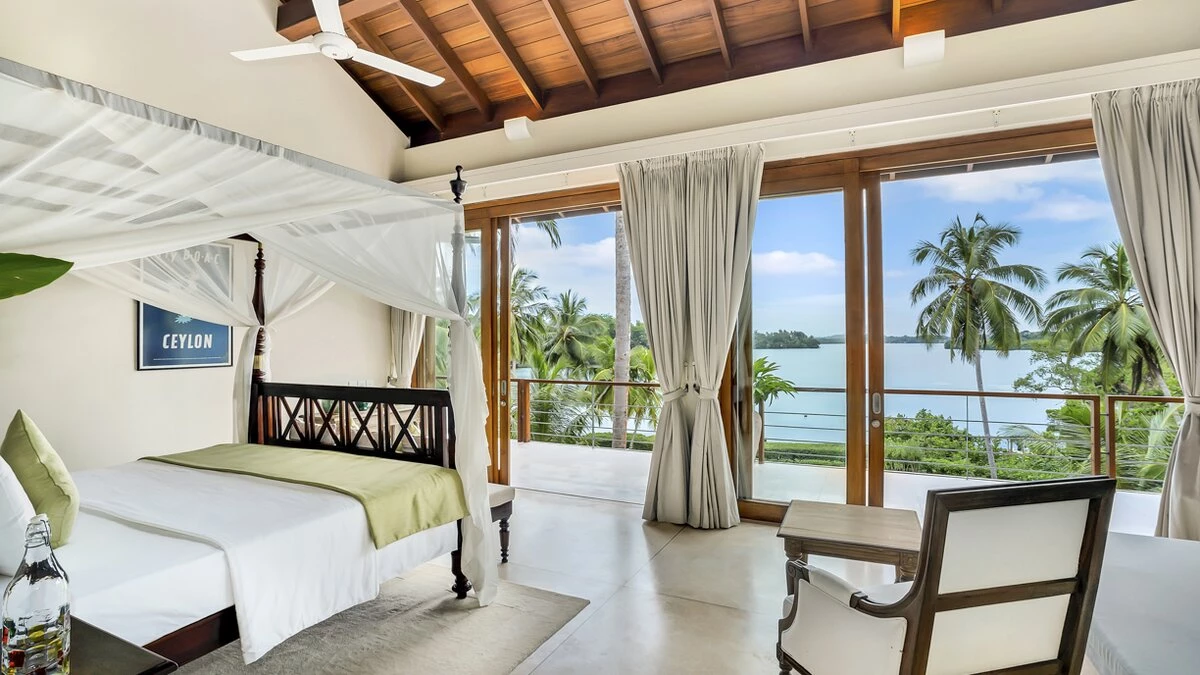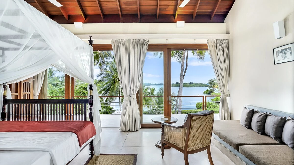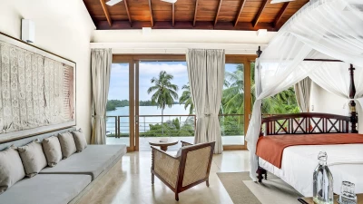 Perfectly poised at the water's edge looking out to breathtaking views over Lake Koggala, Villa Frangipani is in a magical and tranquil setting, perfect for a relaxing getaway near the south coast of Sri Lanka. This contemporary teak-cladded house features elegant interiors, with a consistent neutral colour palette throughout. An open plan ground floor room is home to a bright and airy sitting room and dining area with stunning lake views, which open to the terrace that is furnished for al fresco dining. The kitchen completes the ground floor where the villa’s excellent chef prepares a mixture of traditional Sri Lankan and international dishes . Outside, the inviting infinity pool has three levels so you can sit, swim or paddle, as you please, with sunbeds and parasols for poolside lounging. The vast tropical garden features lush lawns, swaying palms, pink Bougainvillea and Frangipani trees. The lakeside hammock is the perfect place to read or just relax and watch the world go by; in the early hours see fisherman returning to the nearby jetty with their latest catch.Upstairs in the main house there are four beautiful, spacious and near identical en suite bedrooms, all of which are air-conditioned with a four-poster bed and lookout to the lake. The two central rooms are interconnecting, making it ideal for families with children. Each en suite boasts a covered outdoor shower, indoor tub, two sinks and a little private garden, while a shared open viewing terrace runs along the length of the bedrooms, adorned with wicker seating. A separate air-conditioned Garden Suite provides great space and privacy, and houses a four-poster bed, en suite bathroom, walk-in-wardrobe, sitting room with Satellite TV and a pool table. There is also a covered outdoor sofa seat set, which allows for an impressive unspoiled view of the pool and lake.