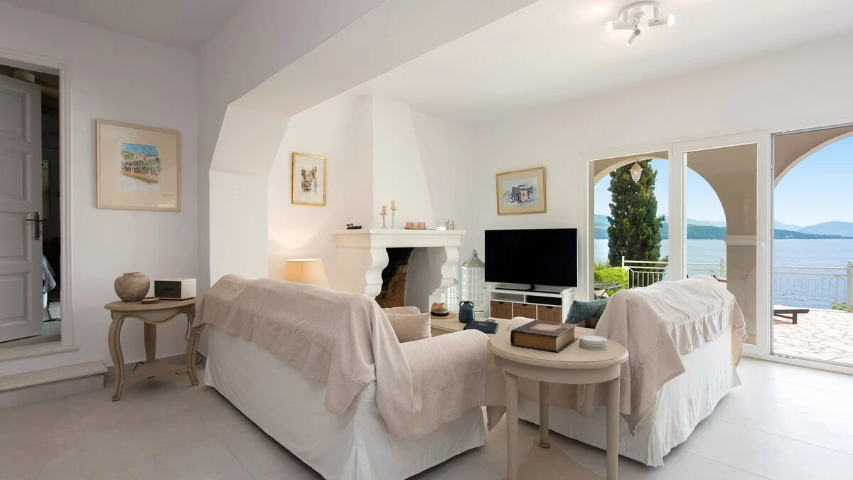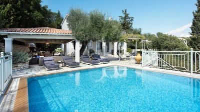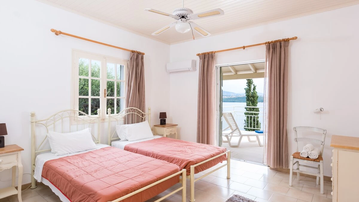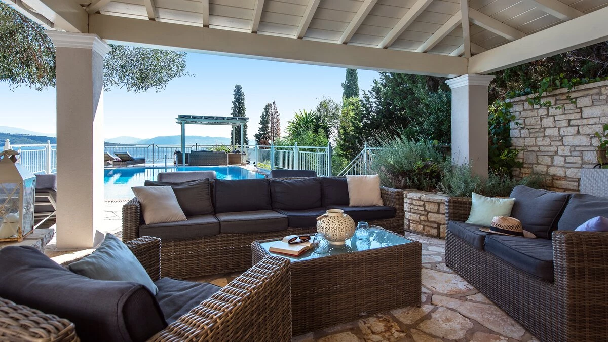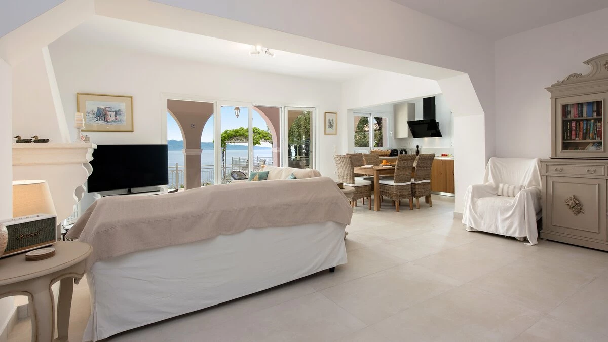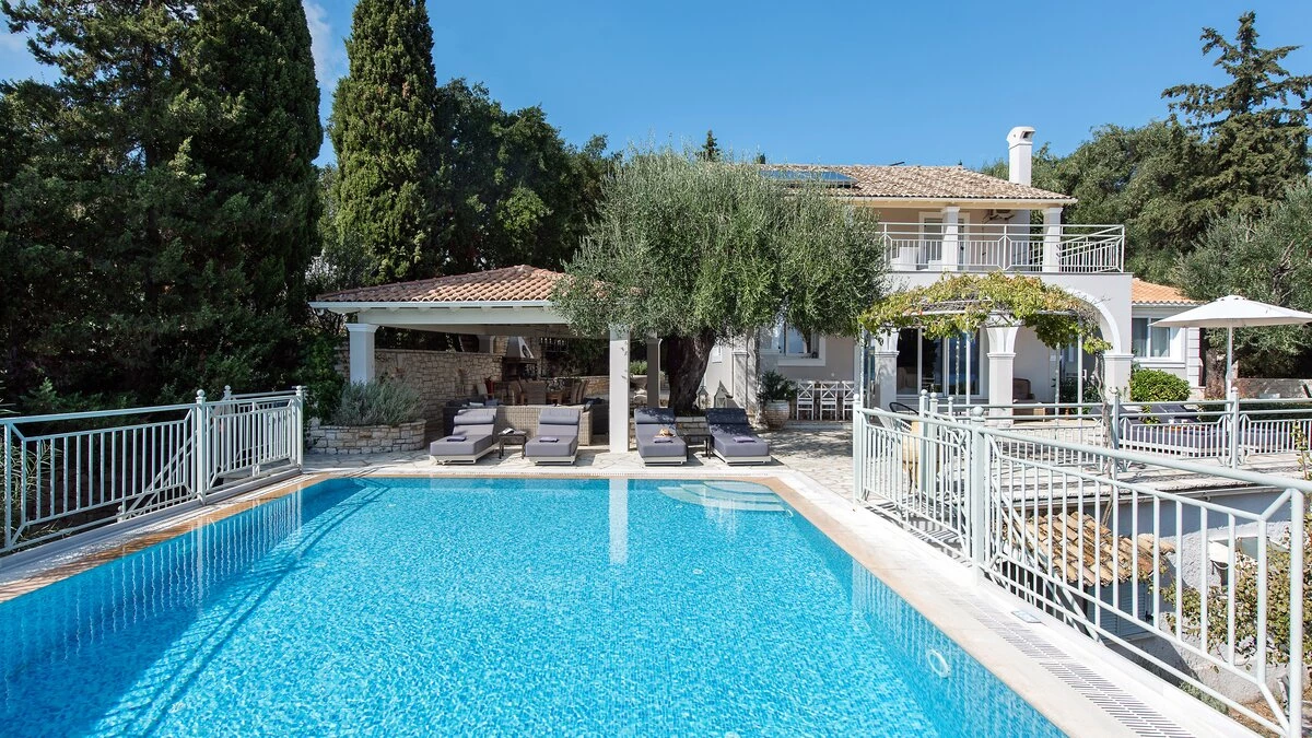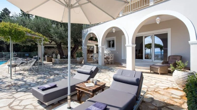 With stunning seascapes framed by rolling headlands and backed by the mountains of the mainland, Gallini basks on low slopes enviably close to the water, its swimming pool jutting out to enjoy the coastal views from three sides. Behind it, a big gazebo houses a built-in barbecue and al fresco sitting and dining areas, and stone paved terraces are punctuated with raised flower beds and colourful shrubs. And overseeing it all, the villa nestles between mature trees, enjoying the views from its furnished veranda and upper floor balcony. Comfortably furnished in country style, the house is relaxed and relaxing. It has an open-plan living/dining room with double doors to the veranda, and each of the four bedrooms open onto outdoor space. A stroll down through the grounds leads to flat-rock bathing and a platform at the water’s edge, and from here it’s a short swim to a beach. On foot, Kerasia beach is about fifteen minutes away, and St Stephano’s harbour restaurants are even nearer.