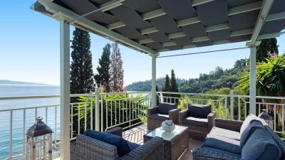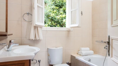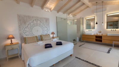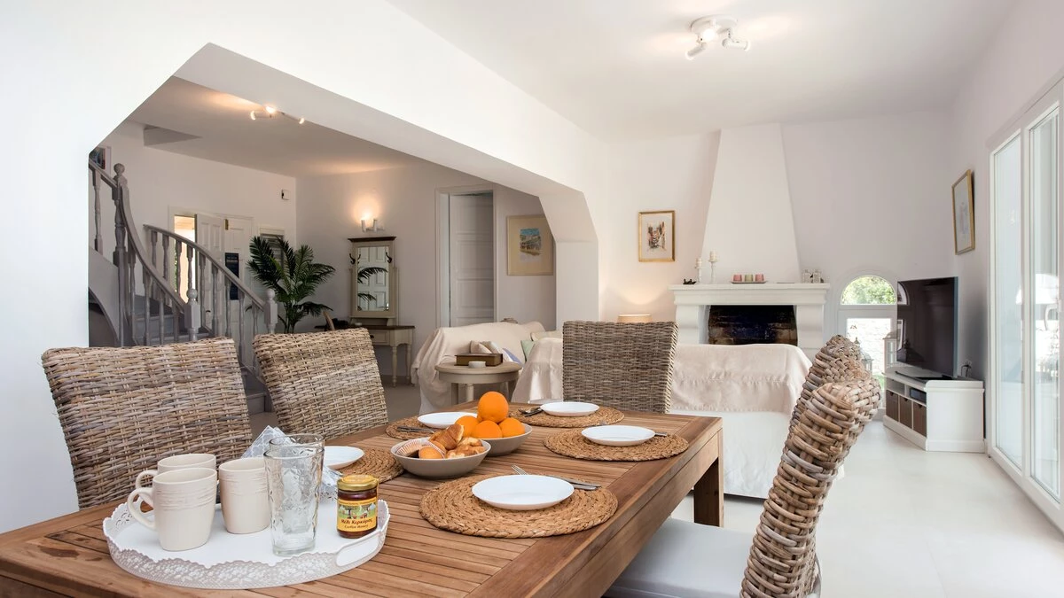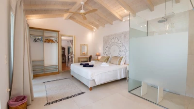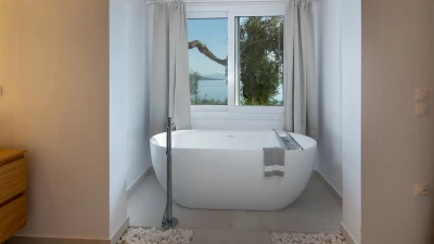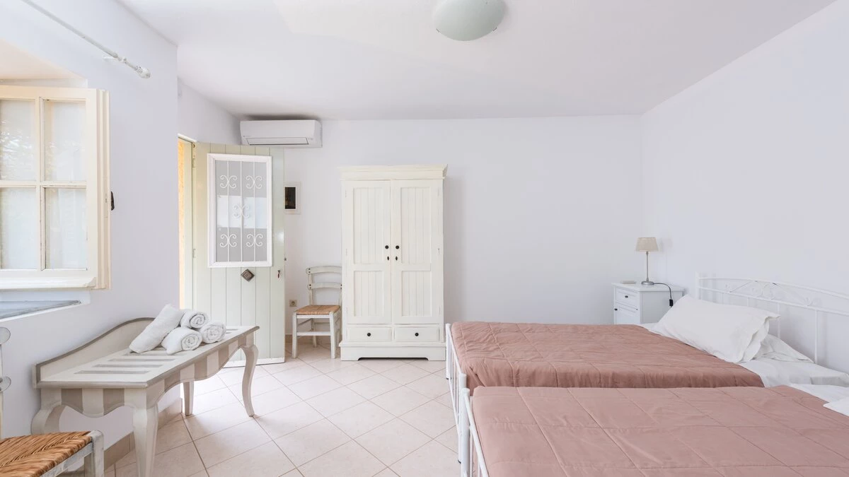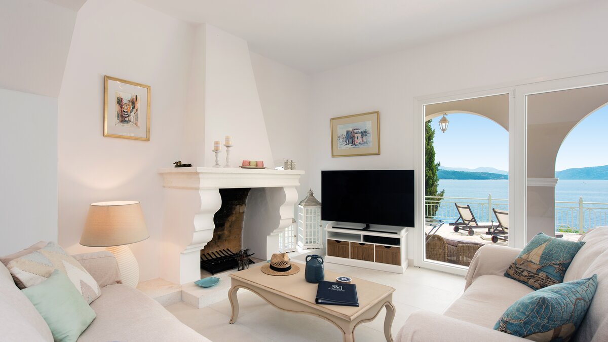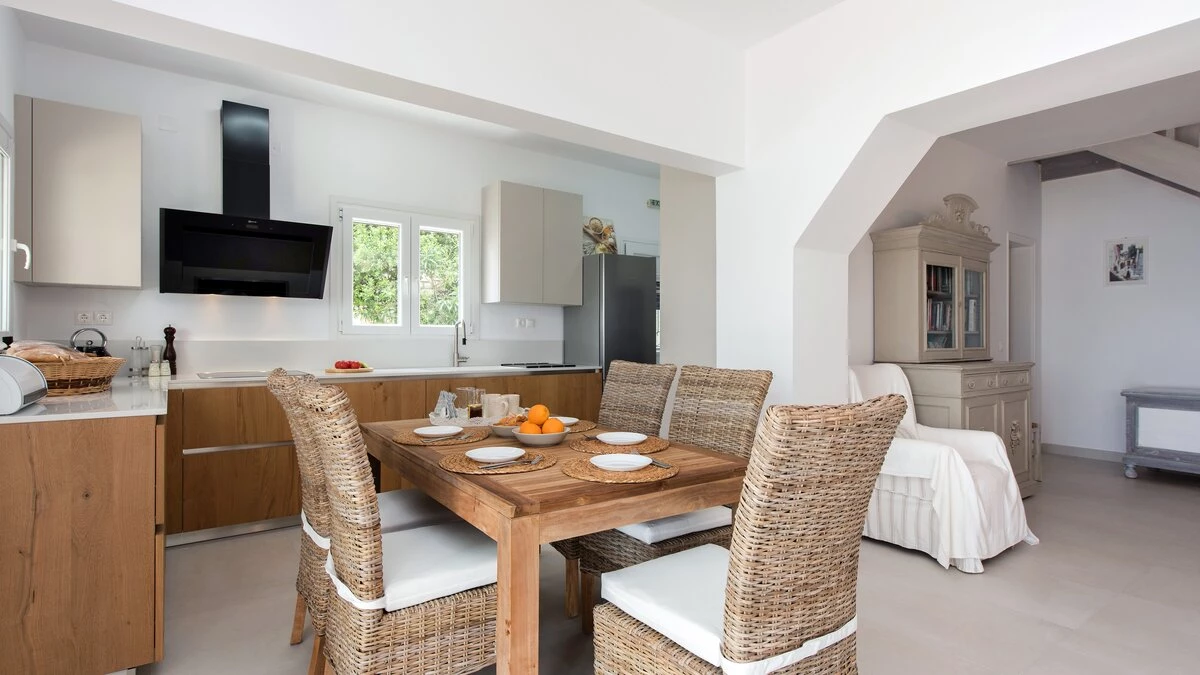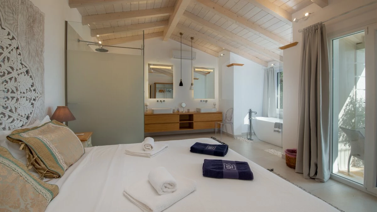With stunning seascapes framed by rolling headlands and backed by the mountains of the mainland, Gallini basks on low slopes enviably close to the water, its swimming pool jutting out to enjoy the coastal views from three sides. Behind it, a big gazebo houses a built-in barbecue and al fresco sitting and dining areas, and stone paved terraces are punctuated with raised flower beds and colourful shrubs. And overseeing it all, the villa nestles between mature trees, enjoying the views from its furnished veranda and upper floor balcony. Comfortably furnished in country style, the house is relaxed and relaxing. It has an open-plan living/dining room with double doors to the veranda, and each of the four bedrooms open onto outdoor space. A stroll down through the grounds leads to flat-rock bathing and a platform at the water’s edge, and from here it’s a short swim to a beach. On foot, Kerasia beach is about fifteen minutes away, and St Stephano’s harbour restaurants are even nearer.