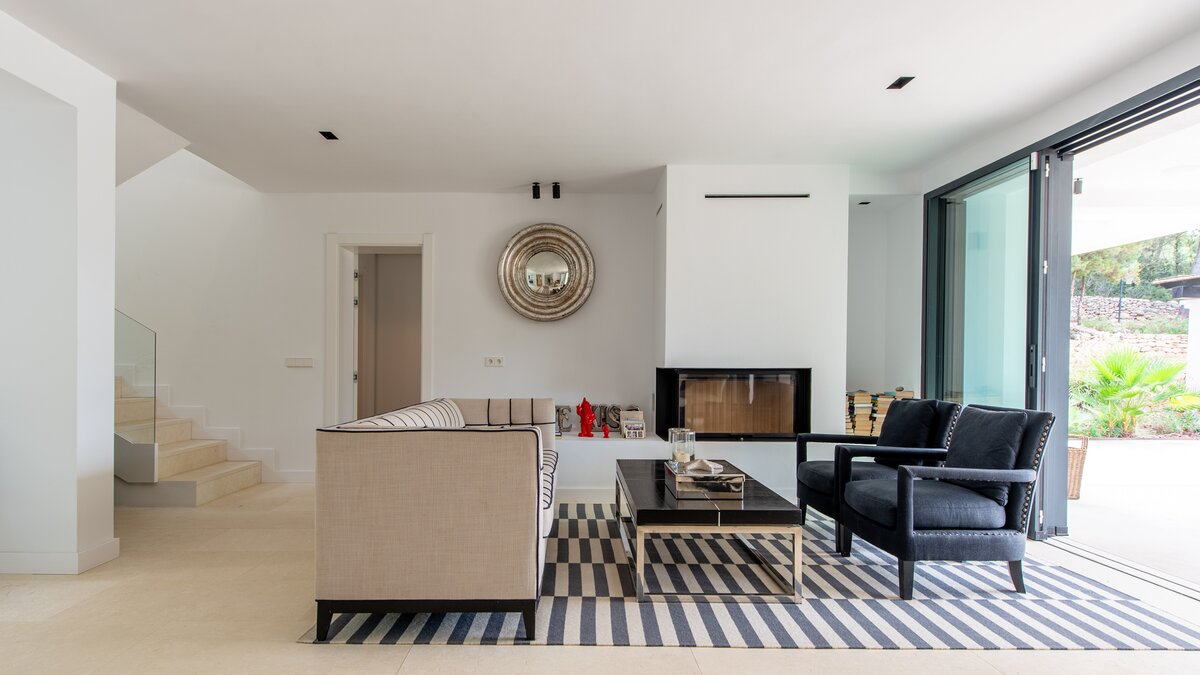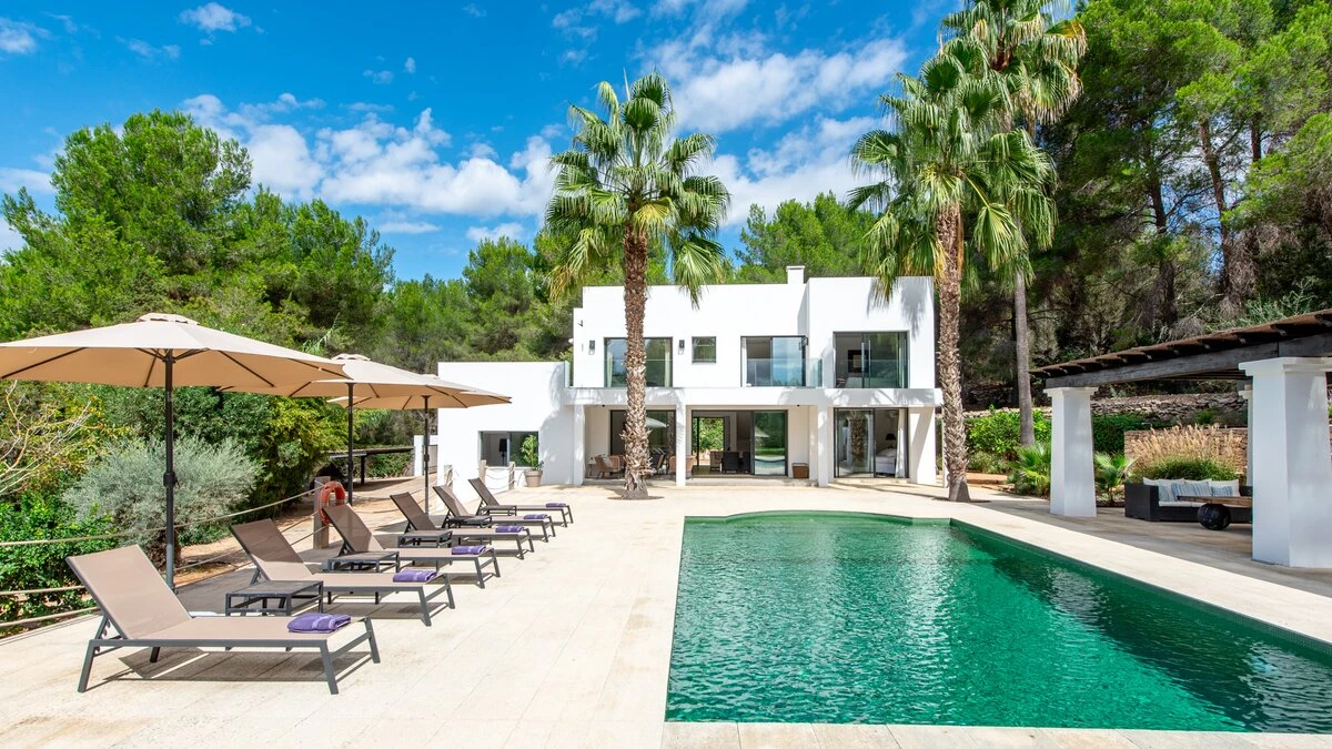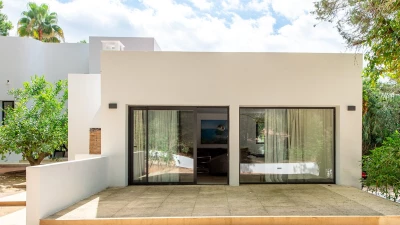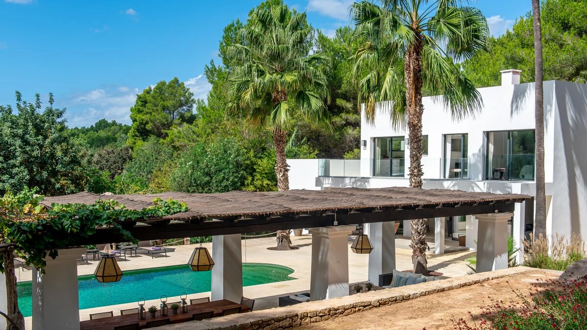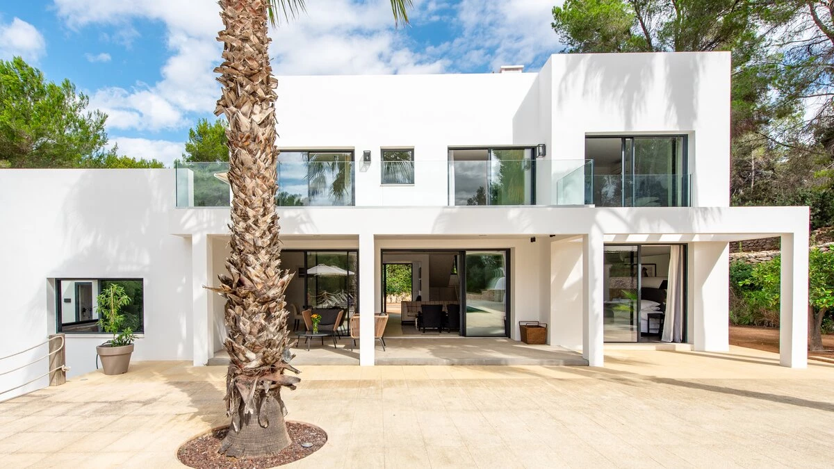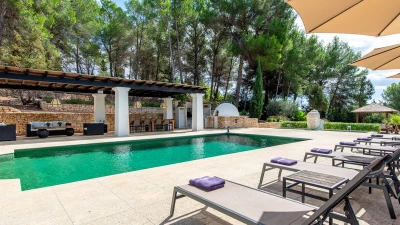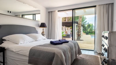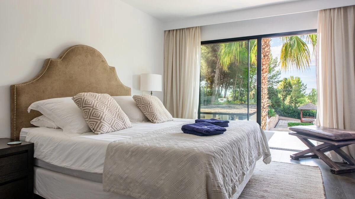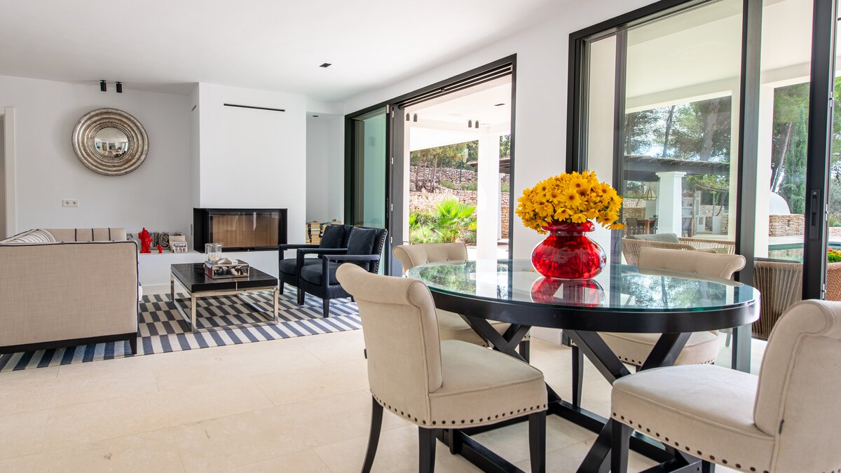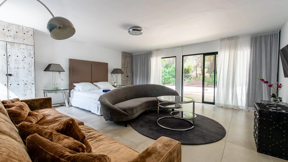 Attention to detail makes this a very pleasant, fully refurbished, home away from home; the bedrooms and bathrooms are all new, and exceptionally large by Ibiza standards. The kitchen, which is also brand new, is equipped with everything to enjoy every day cooking for small and large groups. There are in total 3 living room areas in the house, making it very easy for even large groups to find privacy or spend time together. The main house has two floors. On the very bright ground floor there is the kitchen with a connected large dining area, 2 living rooms with sofas offering sitting space for 10 people at a time. One of them is also equipped with a smart TV. On the other side of the living room there is one large bedroom with its separate bathroom, that offers a bathtub and a walk-in shower.On the first floor you will find another living room – with a wonderful view of the property and Ibiza town with the Ibiza Castle in the background. On a clear day you can even see Formentera. To the left, you will enter into a large bedroom with its own bathroom, with a bathtub and separate shower and a walk-in wardrobe. To the right, there are two additional ensuite bedrooms, each equipped with walk-in showers. Both of these bedrooms share a large terrace that can be covered with a motorized sunroof. From there you can also see Ibiza town and get a glimpse of the sea. The guest house, internally connected via a separate entrance consists of a very large room that includes a double bed and a sitting area, a bathroom with shower, and has direct access to the garden.