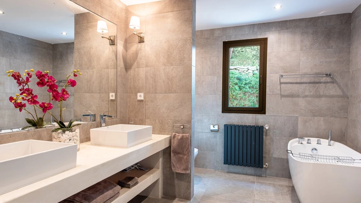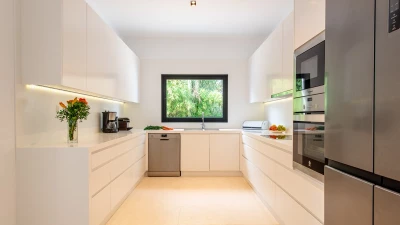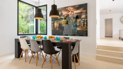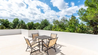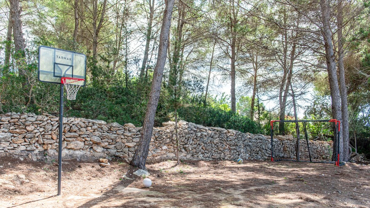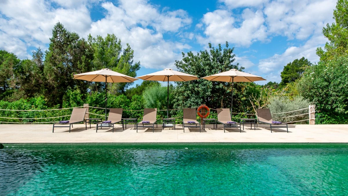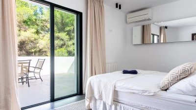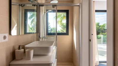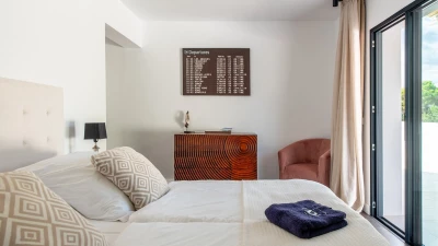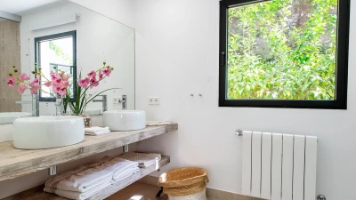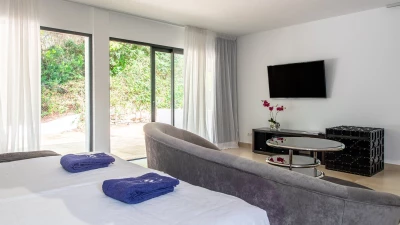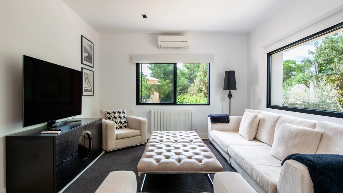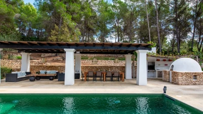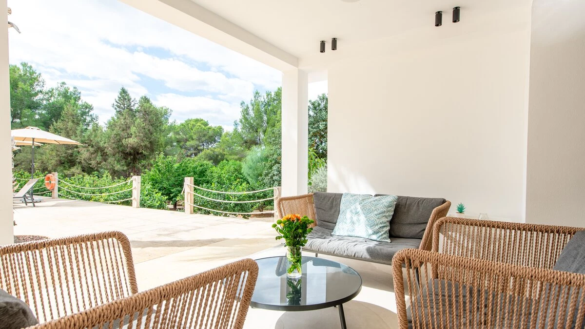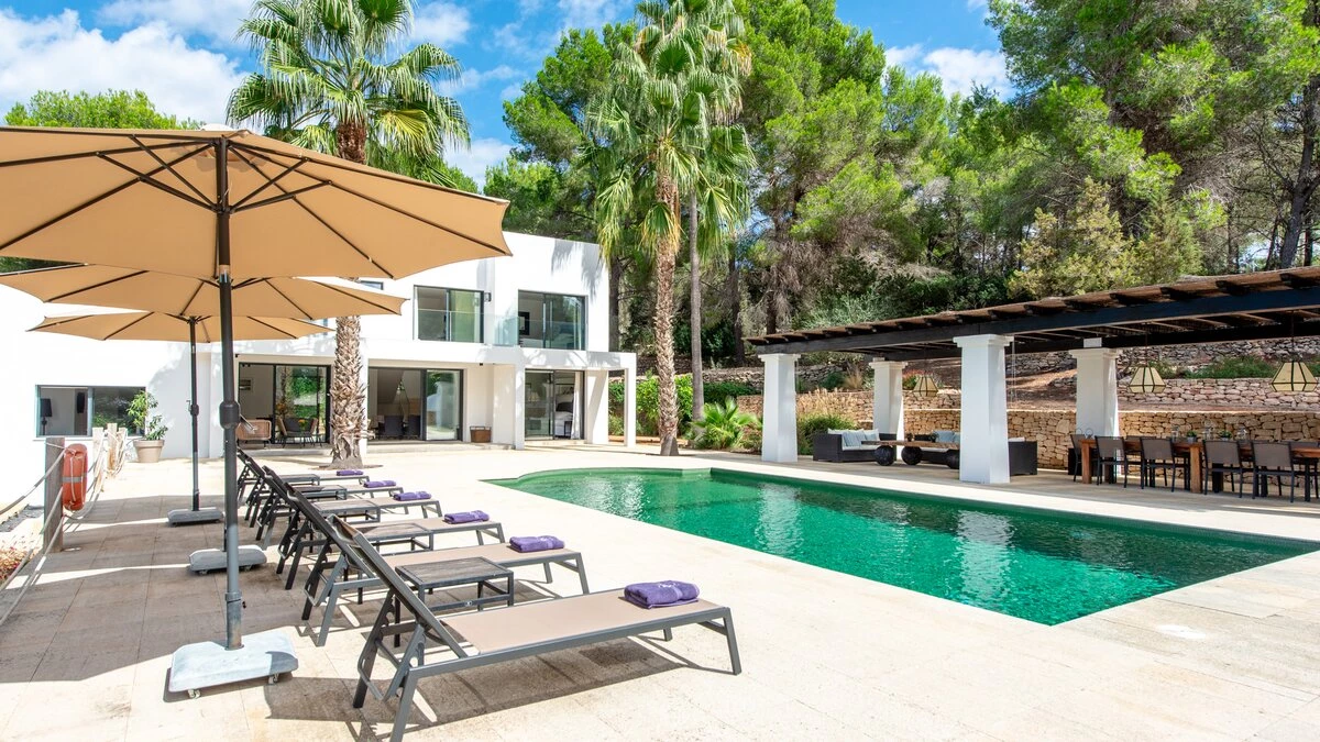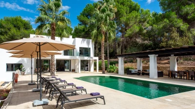 Attention to detail makes this a very pleasant, fully refurbished, home away from home; the bedrooms and bathrooms are all new, and exceptionally large by Ibiza standards. The kitchen, which is also brand new, is equipped with everything to enjoy every day cooking for small and large groups. There are in total 3 living room areas in the house, making it very easy for even large groups to find privacy or spend time together. The main house has two floors. On the very bright ground floor there is the kitchen with a connected large dining area, 2 living rooms with sofas offering sitting space for 10 people at a time. One of them is also equipped with a smart TV. On the other side of the living room there is one large bedroom with its separate bathroom, that offers a bathtub and a walk-in shower.On the first floor you will find another living room – with a wonderful view of the property and Ibiza town with the Ibiza Castle in the background. On a clear day you can even see Formentera. To the left, you will enter into a large bedroom with its own bathroom, with a bathtub and separate shower and a walk-in wardrobe. To the right, there are two additional ensuite bedrooms, each equipped with walk-in showers. Both of these bedrooms share a large terrace that can be covered with a motorized sunroof. From there you can also see Ibiza town and get a glimpse of the sea. The guest house, internally connected via a separate entrance consists of a very large room that includes a double bed and a sitting area, a bathroom with shower, and has direct access to the garden.