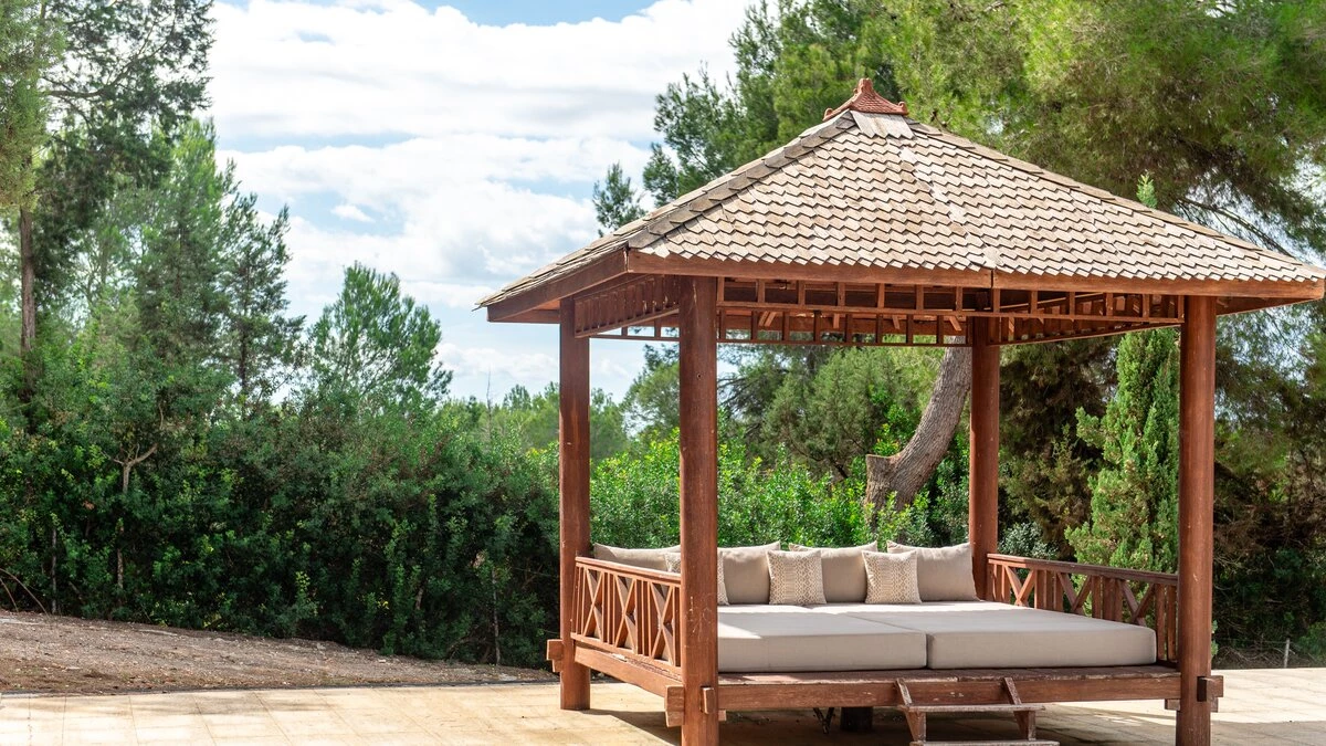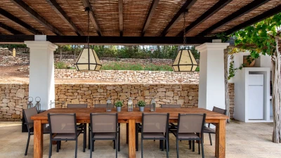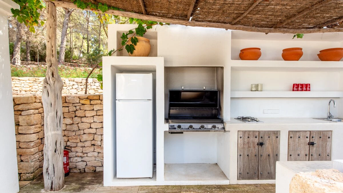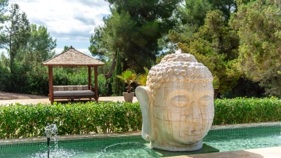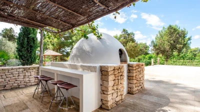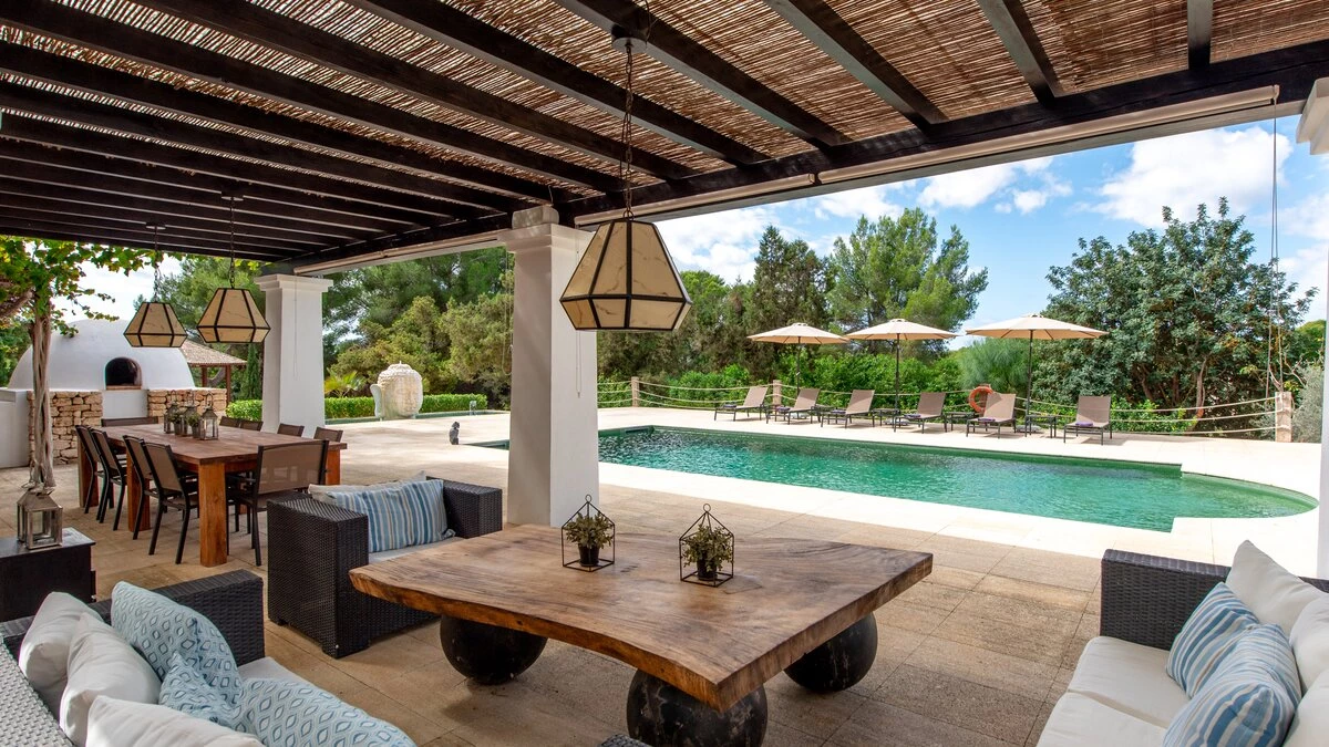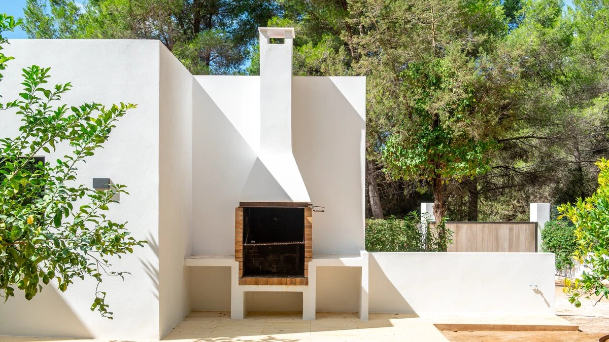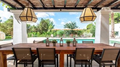Villa Gertrudis is ideally located very close to Santa Gertrudis, a charming little village with lovely restaurants, shops and bars. The villa’s central location makes it a perfect spot from where one can explore the island in all four directions. The house is a perfect combination of typical Ibizan architecture, combined with modern comfort and design. The focal point of the house for enjoying long summer days is the stunning pool area. The poolside pergola hosts a comfortable outdoor seating area, as well as an al-fresco dining table, seating up to 10 people; the outdoor kitchen with the BBQ, stove and fridge completes this space, making it the perfect place for all day lounging and dining. There is an Andalusian style backyard, with orange trees and a water fountain, ideal for an aperitif while listening to the birds. A stunning Balinese house on the other side of the property invites guests to have a “siesta” in the shade. There is also a beautiful orchard, with different kinds of fruit trees providing fresh fruit that guests are welcome to enjoy, when in season.