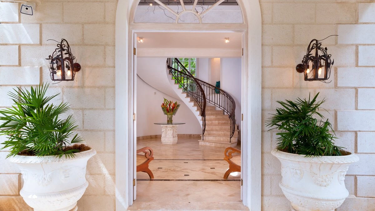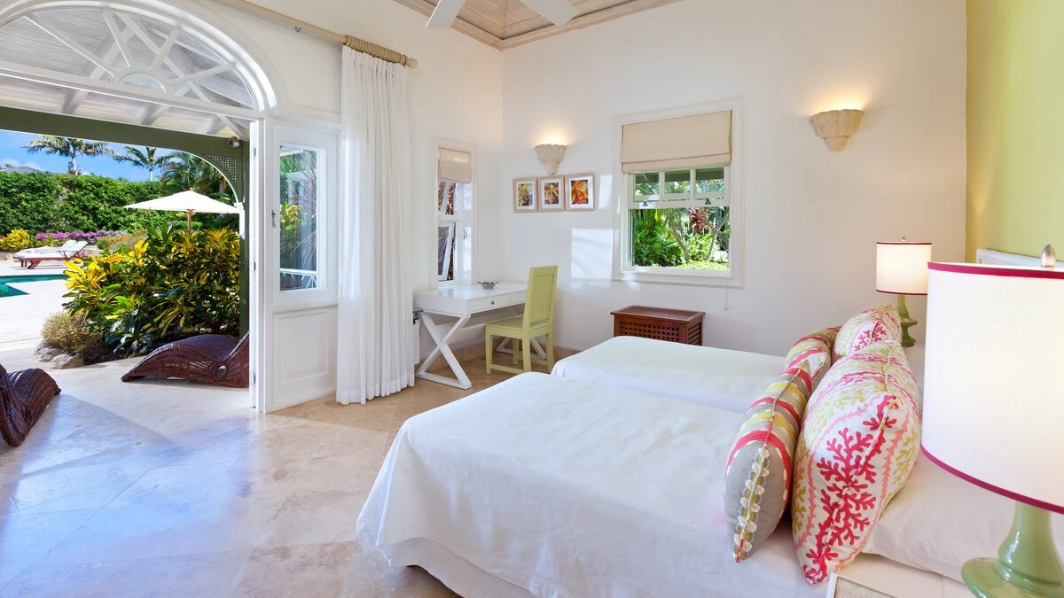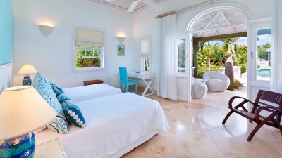This charming, white-bricked property stands out amongst lush greenery and swaying palms in beautiful St James. Guests can head through the large, arched doorway to discover a bright and elegant living space, complete with cosy sofas, marble tiles and a grand piano. The family room offers the perfect spot to relax after a day of activities, furnished with a TV and comfortable seating for the whole family. The fully equipped kitchen is the perfect spot for your private cook service to prepare a delightful meal, designed with an opening that leads directly to the wonderful terrace overlooking the pool. The ground floor is also home to a spacious double bedroom with a bathroom en suite. Following up the spiral staircase, the first floor offers access to two more lovely bedrooms with windows that showcase the incredible panoramic views beyond. The guest cottage is the perfect spot for guests seeking a bit of privacy, designed with two twin rooms which can both be converted into a king size bed.