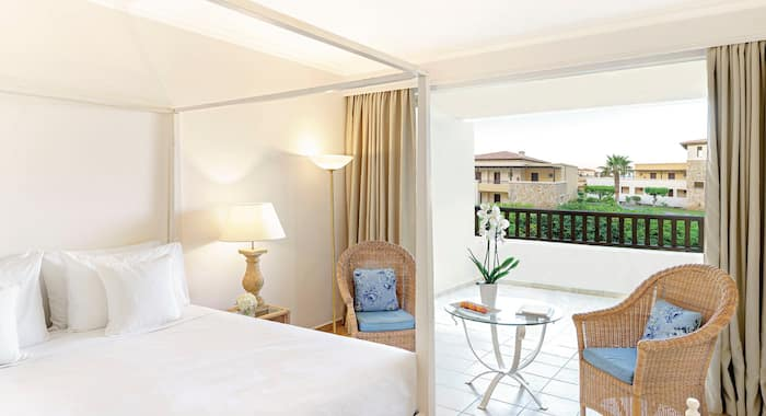 All accommodations feature airy fabrics, bright summer hues, marble bathrooms, and furnished verandas for serene outdoor living.