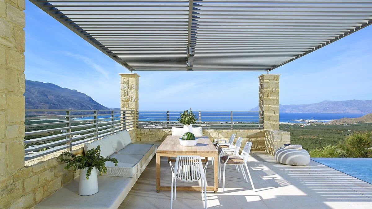 Harmonic Bliss is a beautifully designed retreat where panoramic vistas of Gramvousa and Spatha unfold in uninterrupted splendour. Thoughtfully crafted to merge indoor and outdoor living, its contemporary architecture, pale Cretan stone and expansive glass create a seamless connection with the wild, unspoilt coastline below.