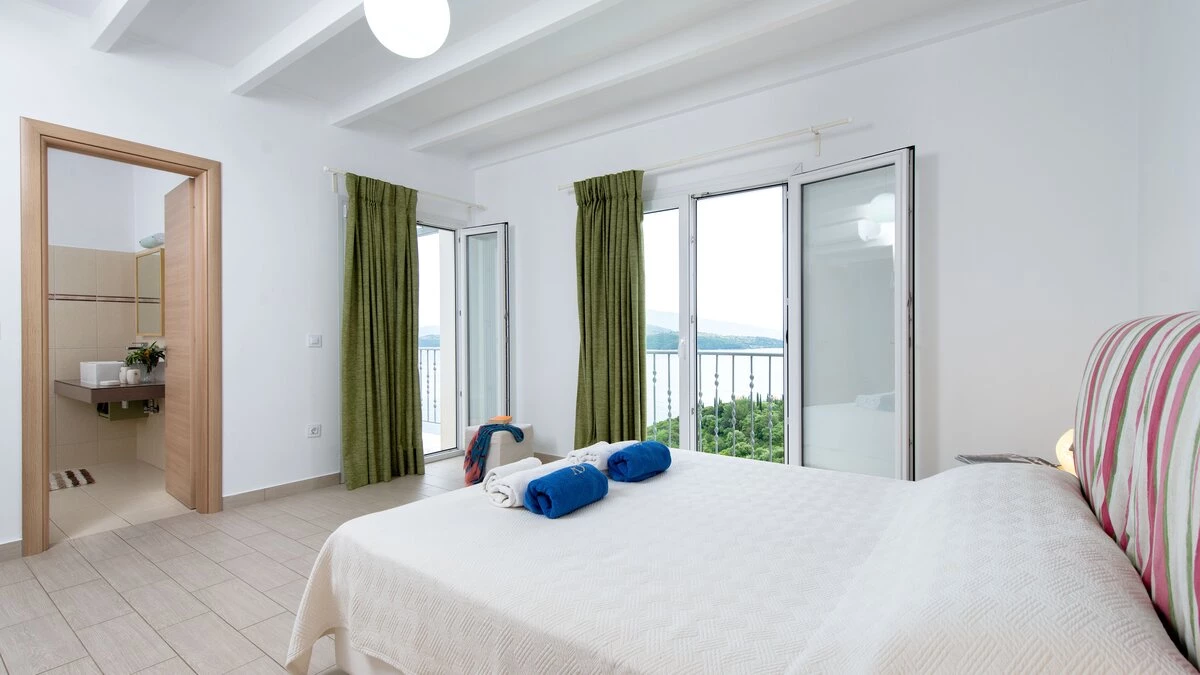 Pleasurably private but not isolated, this is a modern house with a magical view, where comfort is not compromised by its smart, uncluttered design. Furnished in a natural colour palette, with brilliant blue and soft green highlights to echo the sea and the cypress-cloaked headland, Helidoni has a spacious sitting room with 42” satellite TV, open through an archway to the sleek, matt black, kitchen diner. Both open out to shaded terraces, stylishly furnished for lounging and dining, while enjoying bewitching panoramas of the channel and heat-hazed coastal hills. One of the bedrooms shares this level, with two more occupying the upper floor, each with en suite facilities, air conditioning, and sea views from the terrace or Juliet balcony. A terrace below the villa is filled with a generously sized infinity pool and pergola-shaded area, and there is a built-in barbecue for al fresco meals that could last for hours. For similarly leisurely lunches at the water’s edge, it’s a walkable 1km to Kerasia’s beach and taverna, St Stephano’s shops and eateries are 2km from the villa, and Kalami and Kassiopi are just a short drive away.