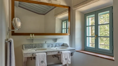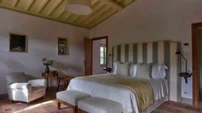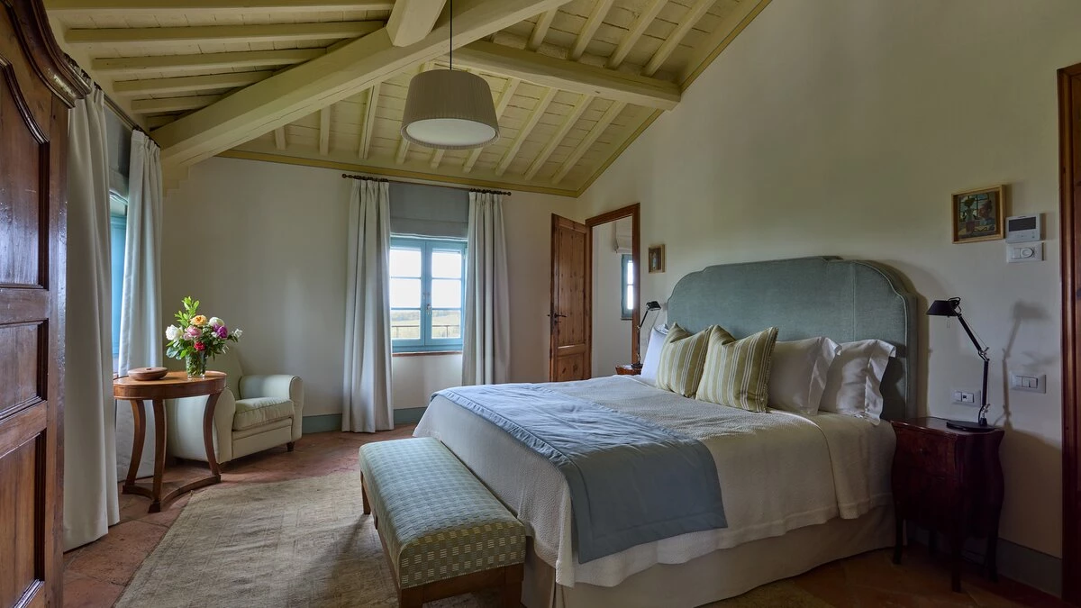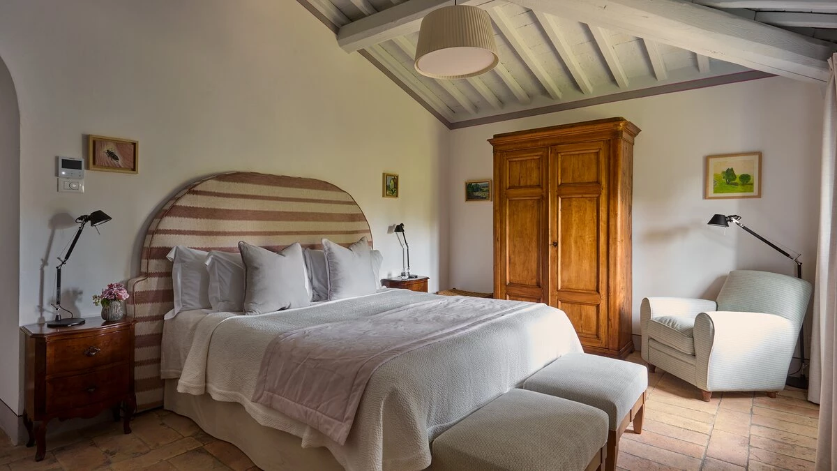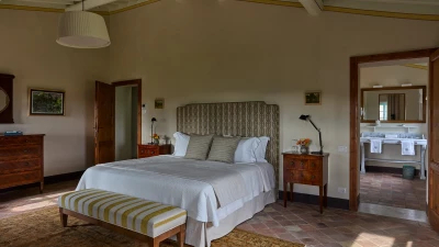Upon entering the living room, you’ll notice how well the villa’s architecture has been built for purpose, allowing natural light to flow freely throughout every corner of the property. The open plan dining and living area continue this trend, crafting spaces that are perfect for entertaining guests and enjoying quality time with loved ones. The seamless transition between comfortable indoor spaces and covered outdoor spaces makes this villa ideal for creating cherished memories in a blissful setting. The kitchen is fully equipped with a wood-burning oven, for relaxed and authentic home-cooked meals with the family. Upstairs, the first floor is home to all four of the villa’s spacious bedrooms, each with their own en suite and offering elevated views of Tuscany’s elegant, rolling hills from a new perspective.