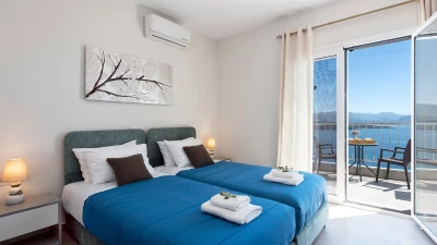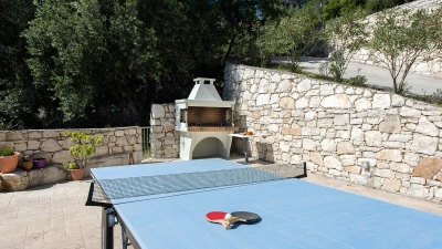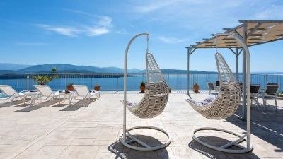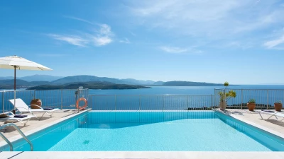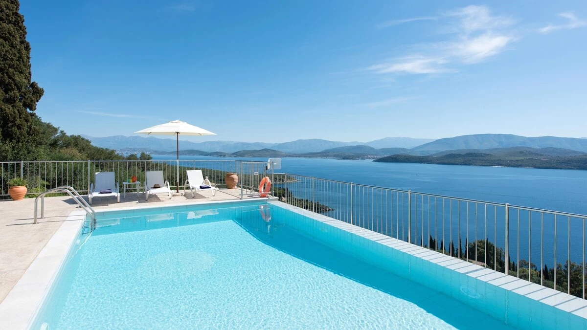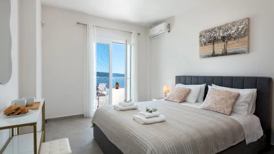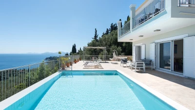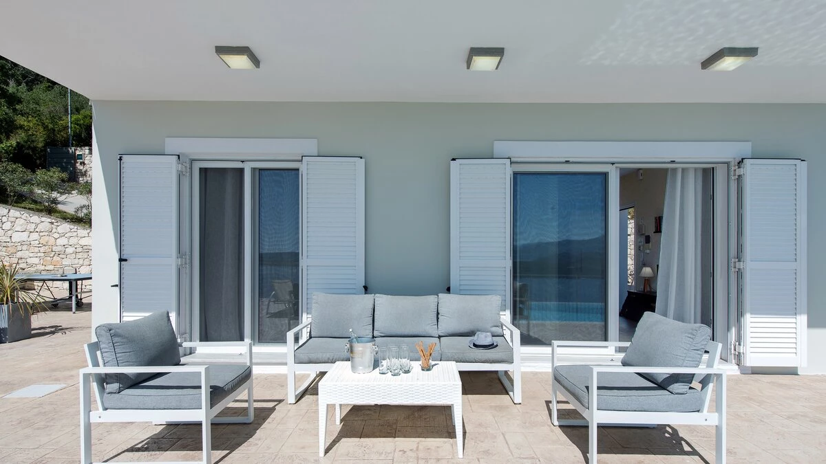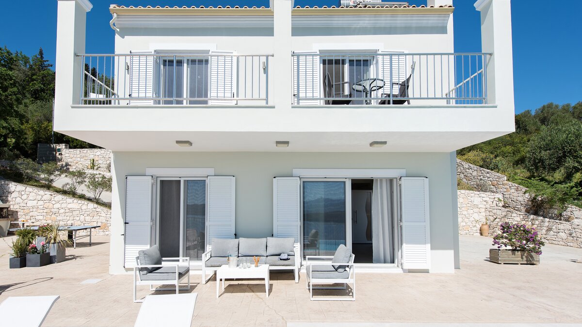Irida is all about the view, blissfully located overlooking the sea in north east Corfu. An expansive terrace wraps around the outside of the villa, and beside the pool with loungers and soft seating, there’s a shaded dining terrace and a built-in BBQ for eating al fresco, plus table tennis.