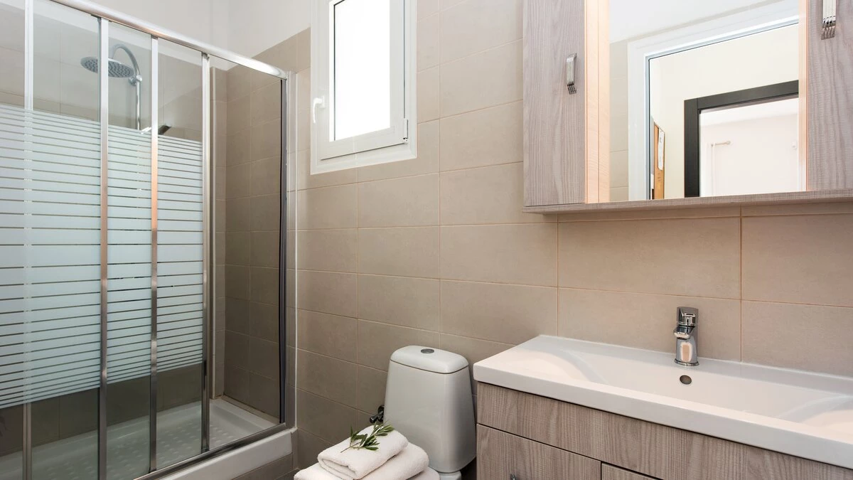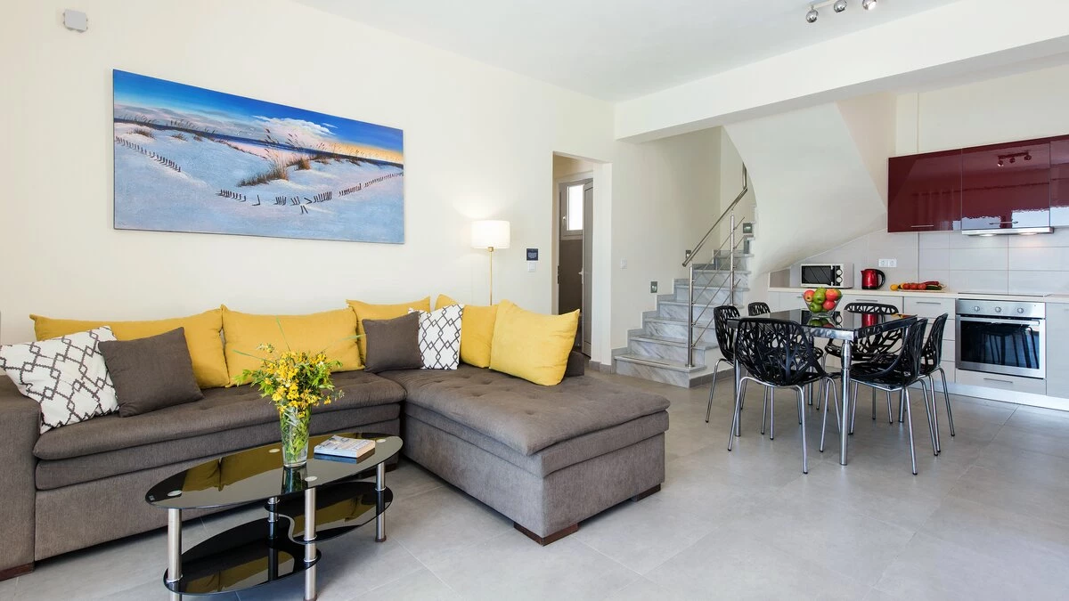 Indoors the villa’s style is simple, decorated in a neutral colour palette with pops of colour in the soft furnishings. The ground floor is home to an open plan living and dining area, with a breakfast table and kitchen area as well as a comfortable corner sofa and flat screen television; a double bedroom with a shower room adjacent completes this floor. Upstairs are a further two bedrooms, both of which are twin rooms one with shower room en suite and the other with bathroom en suite opening to a shared balcony.
