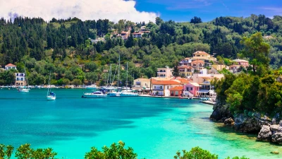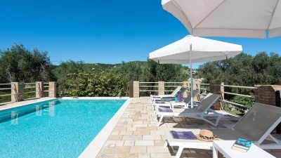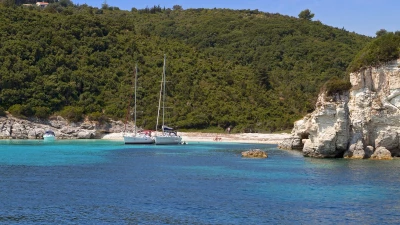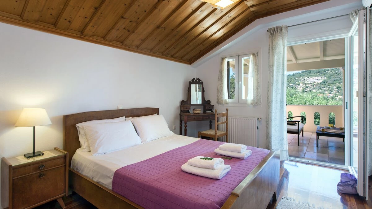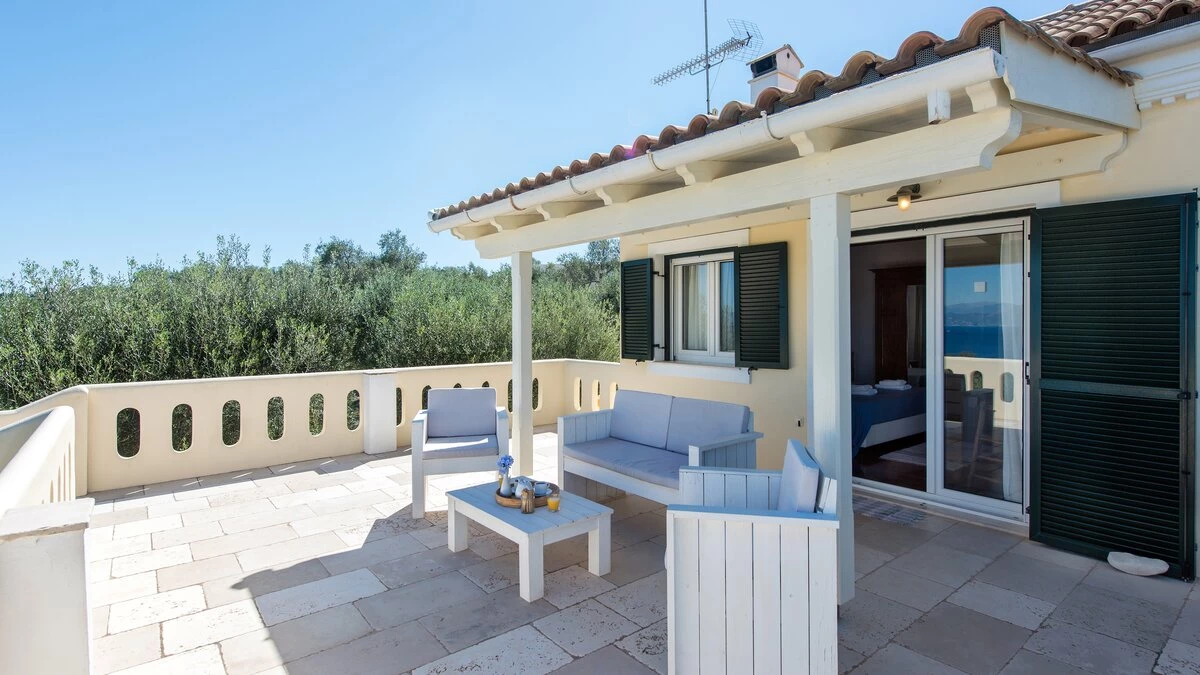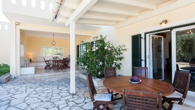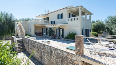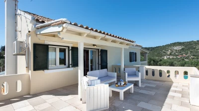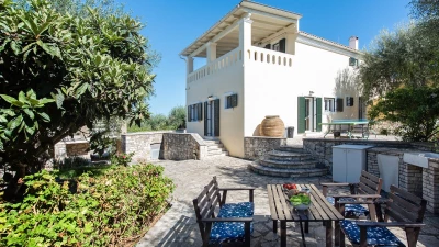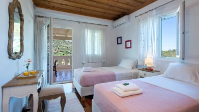 Completely in harmony with the island’s easy tempo, this spacious villa matches contemporary facilities with a pleasing blend of modern and traditional furniture. Flag-stoned floors, chalk white décor and earth-toned furnishings run throughout the ground floor, where an open-plan kitchen/ dining room has doors out to the tiered garden; a spacious sitting room is complete with fireplace and large-screen satellite TV, and opens on to a covered terrace; and there is a twin room with en suite shower. The other three bedrooms share the upper floor, with polished wood floors, timbered ceilings and access to a balcony. And air conditioning is installed in all four guest rooms and the living room. Outdoor living is catered for with furnished verandas for al fresco dining and relaxing, a built-in barbecue for lunch in the sun, loungers by the villa’s private pool, and views from the upper floor balconies over a sea of silvery olive trees to the blue of the bay beyond. Iviscus is also well placed for holiday essentials, about 400m from Yanna Beach and 200m from Gaios, where restaurants around the main square are in prime position for people-watching and yacht-spotting.