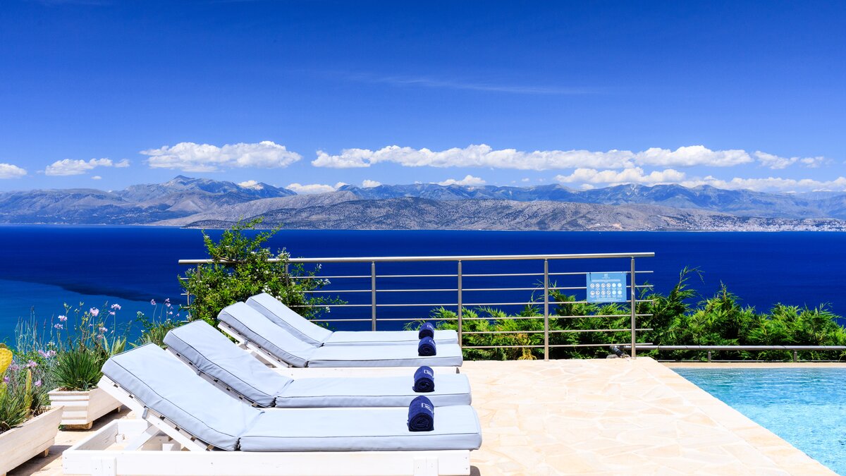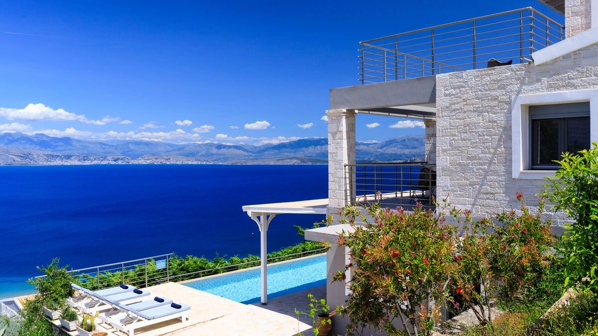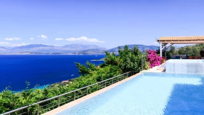 With a perfect position perched in the hills allowing views in every direction of citrus and olive groves, sea and shore, Jasmine is a calm, contemporary and uncluttered villa, where spacious interiors are matched by a generous terrace for outdoor living. Only 1km from the sandy beach at Kalamaki Bay, just 2.8km from shops and tavernas in Perithia and less than 5km from Kassiopi harbour to hire a boat or enjoy watersports, Jasmine is perfectly placed for families and friends alike. This well-equipped villa has WiFi and air conditioning throughout, a cool white breakfast kitchen, and an airy open-plan sitting/dining room with large screen satellite TV and a full window wall opening out to the terrace. Thoughtfully designed for families or friends, its two first floor bedrooms can each be made-up for twin or double use, both complete with en suite shower room and access to a broad balcony; while the master suite occupies the whole top floor, with high raftered ceilings, a full bathroom, and glorious views along the coast from its large private terrace. Outside, an infinity pool is sunk into the sea view terrace, adjoined by a dining area and barbecue, and a shaded gazebo, stylishly furnished with cushioned rattan.