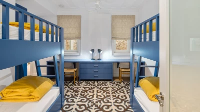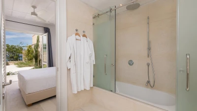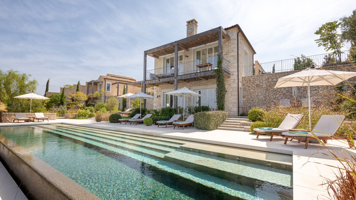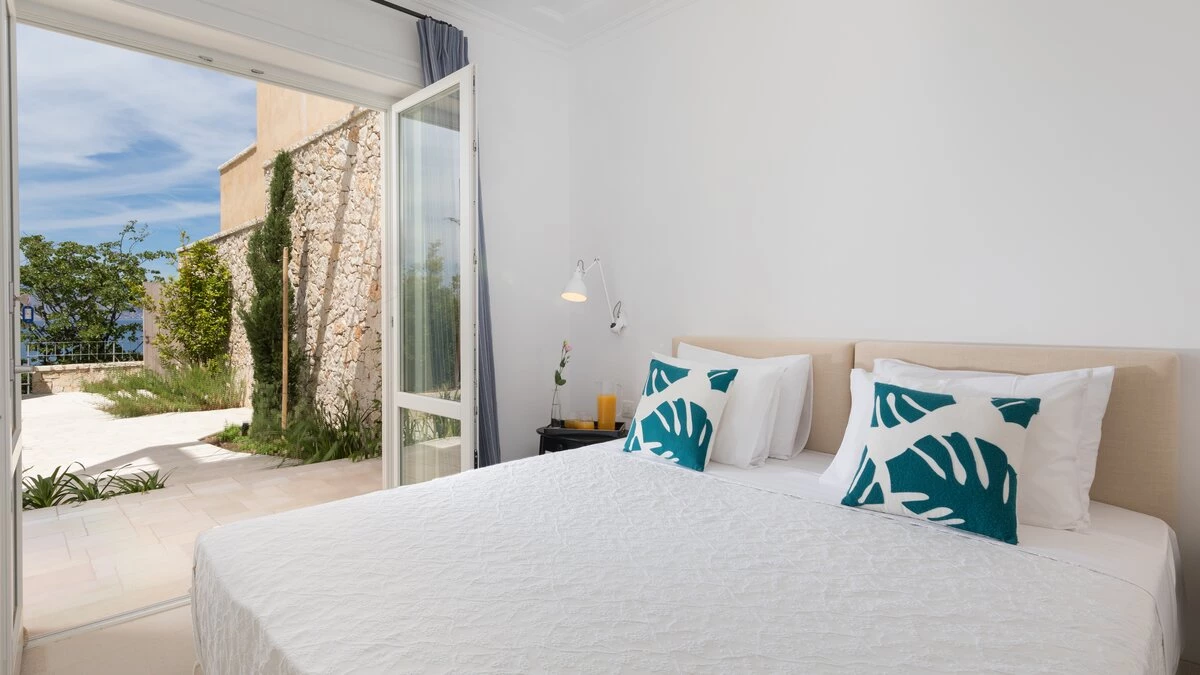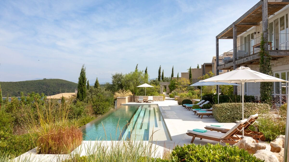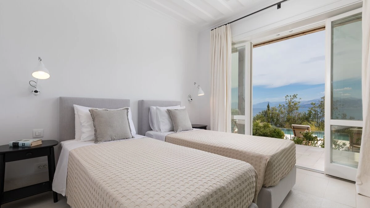 Chic, modern and sophisticated, Kalliopi is a welcome addition to our ABOVE collection in Corfu. Inside, the villa is cool and contemporary with clean white walls and floor to ceiling windows welcoming in the sunlight and the surrounding views. The ground floor is light and spacious with an open plan living and dining space and a fully-equipped chef kitchen; A TV room allows guests to relax and unwind indoors. There are four bedrooms on the ground floor, all of which are en suite and three of four open to the pool terrace; a bunk bedroom is ideal for youngsters. The first floor is dedicated to the master bedroom, with a bathroom en suite and a private courtyard with an al fresco free standing bath.