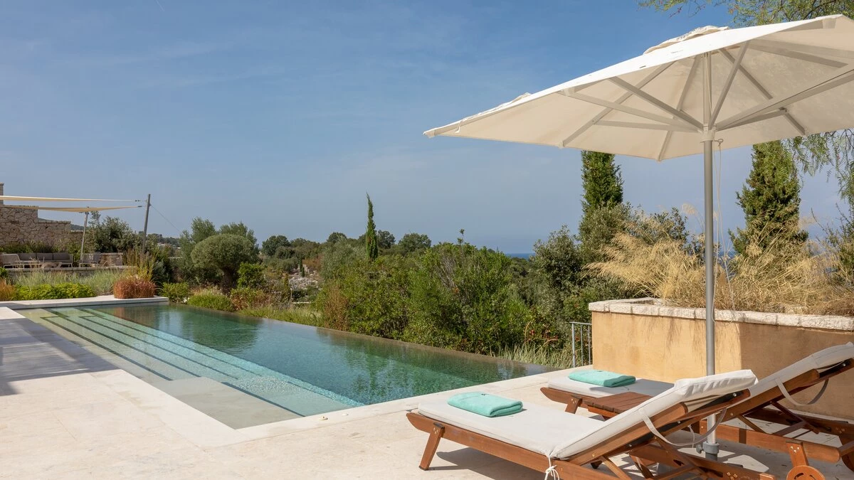 The split level terrace is perfect for al fresco living. A 17m infinity pool takes pride of place with wooden poolside loungers enjoying far-reaching sea views. Beside the pool there is an outdoor dining space covered by a canopy for dining in the shade, served by a built-in BBQ and a pizza oven, plus a boules court.