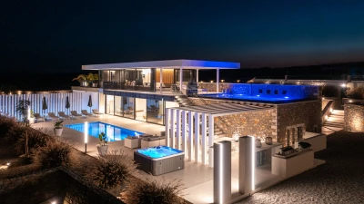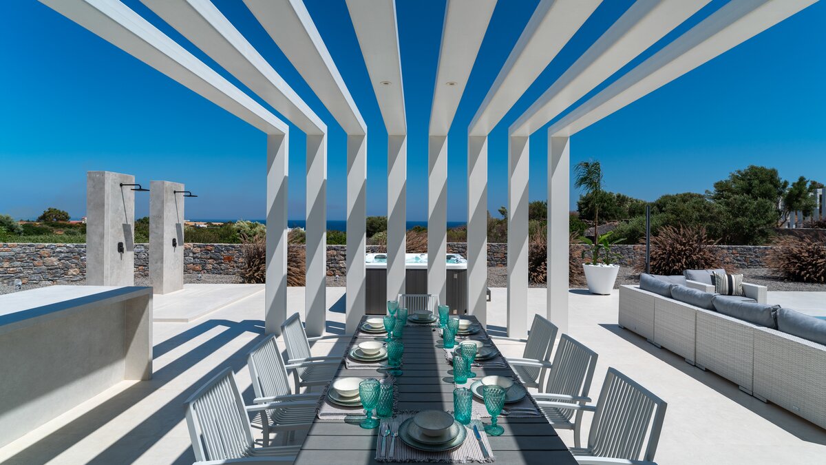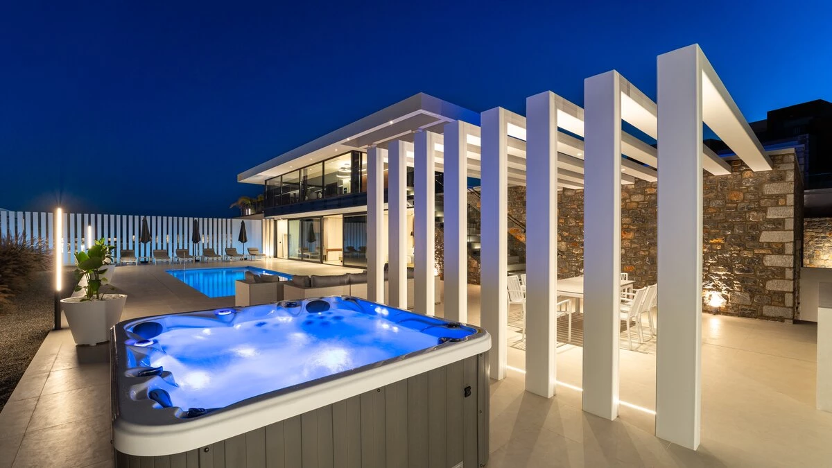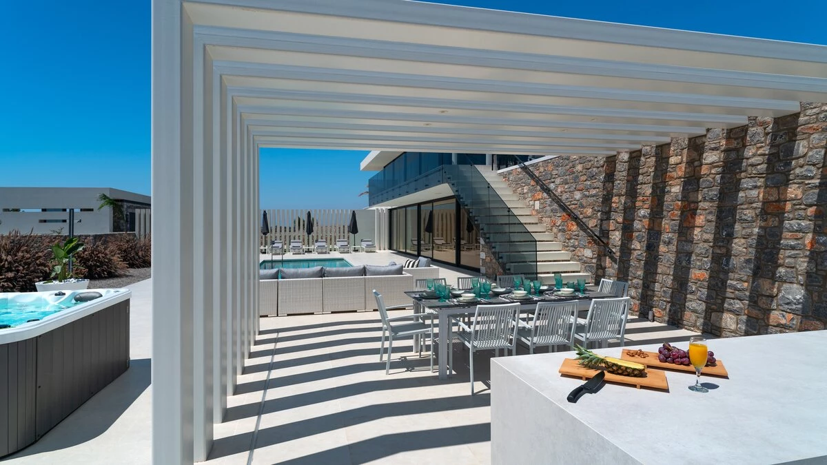 This villa features two terraces, one on either side. On one side, guests can relax at the pool area, with a heated Jacuzzi and dining area with a double-island barbecue space. On the other side is a large sitting area with an external fireplace. A separate, full-size kitchen is situated on the basement floor, with and individual shower and bathroom, ideal for party preparations and external catering services.