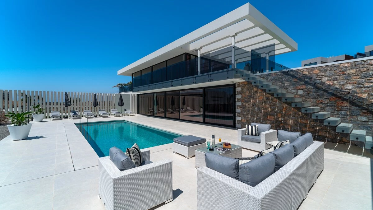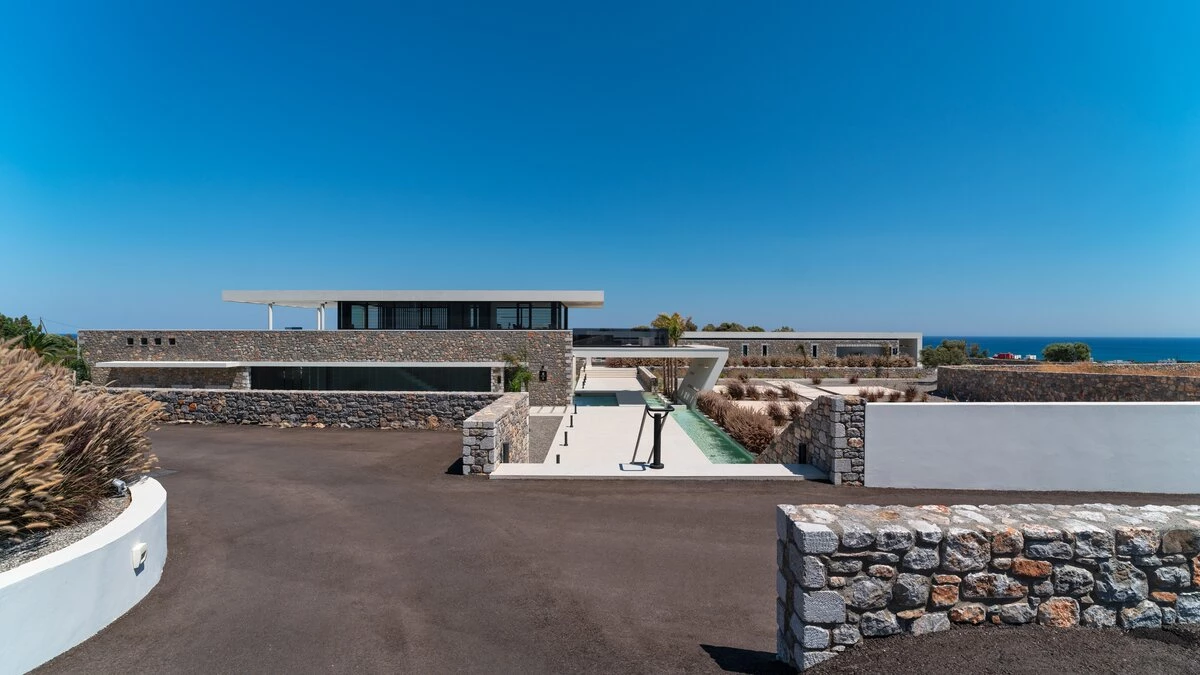 Kastro Blu is a magnificent two-floor villa in Rhodes, uniquely designed with some amazing facilities and extraordinary views. On the ground floor, guests will discover three large bedrooms, each with a king size bed, large floor to ceiling panels overlooking the ground pool, and views of the Aegean Sea. The master bedroom has its own private bathroom with a walk-in shower. Upstairs, a little minimalist kitchen, dining area and cosy lounge sofas complete the layout.