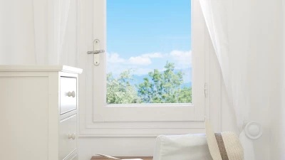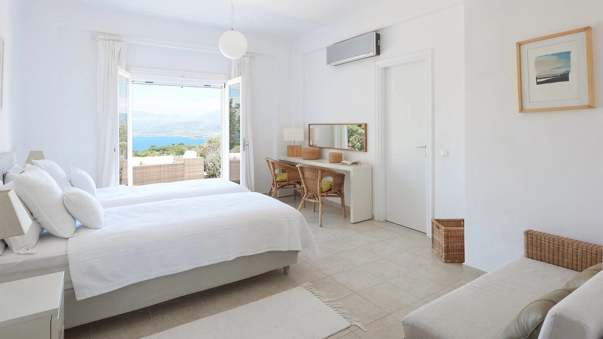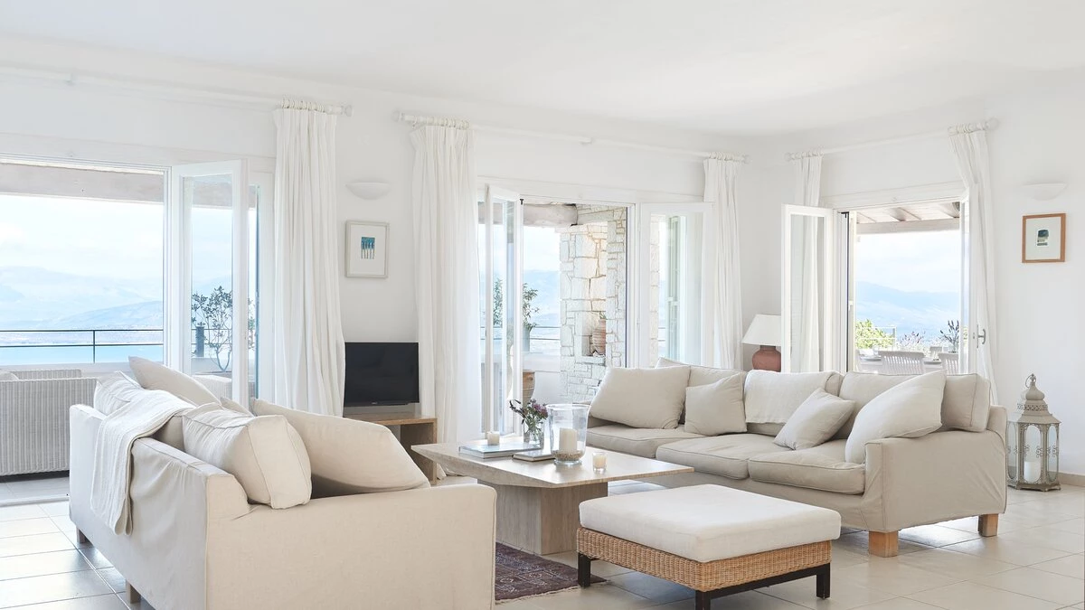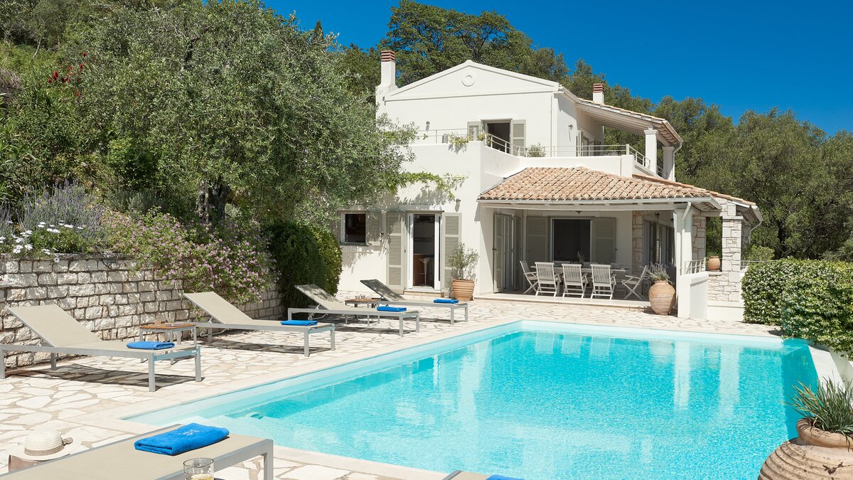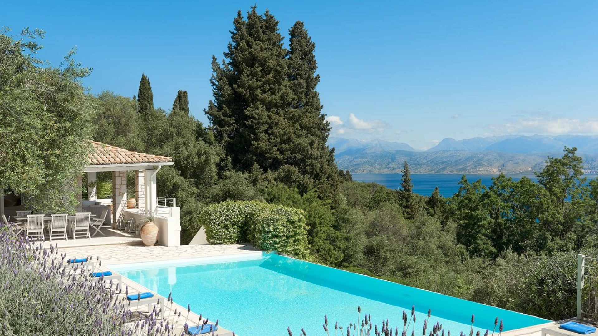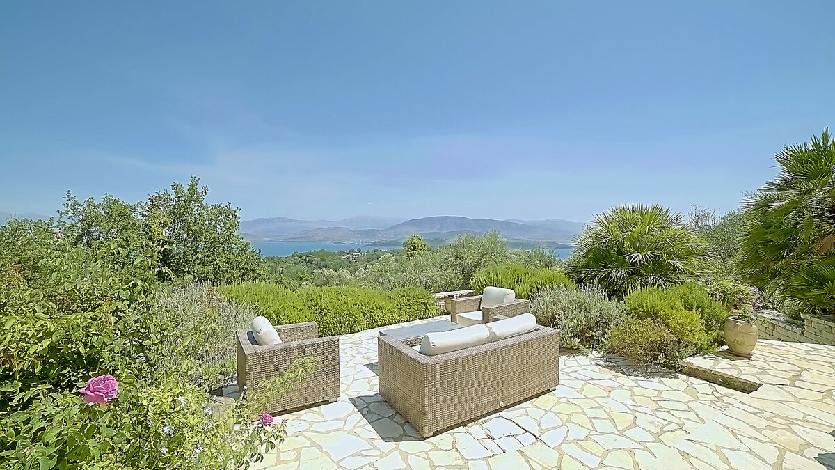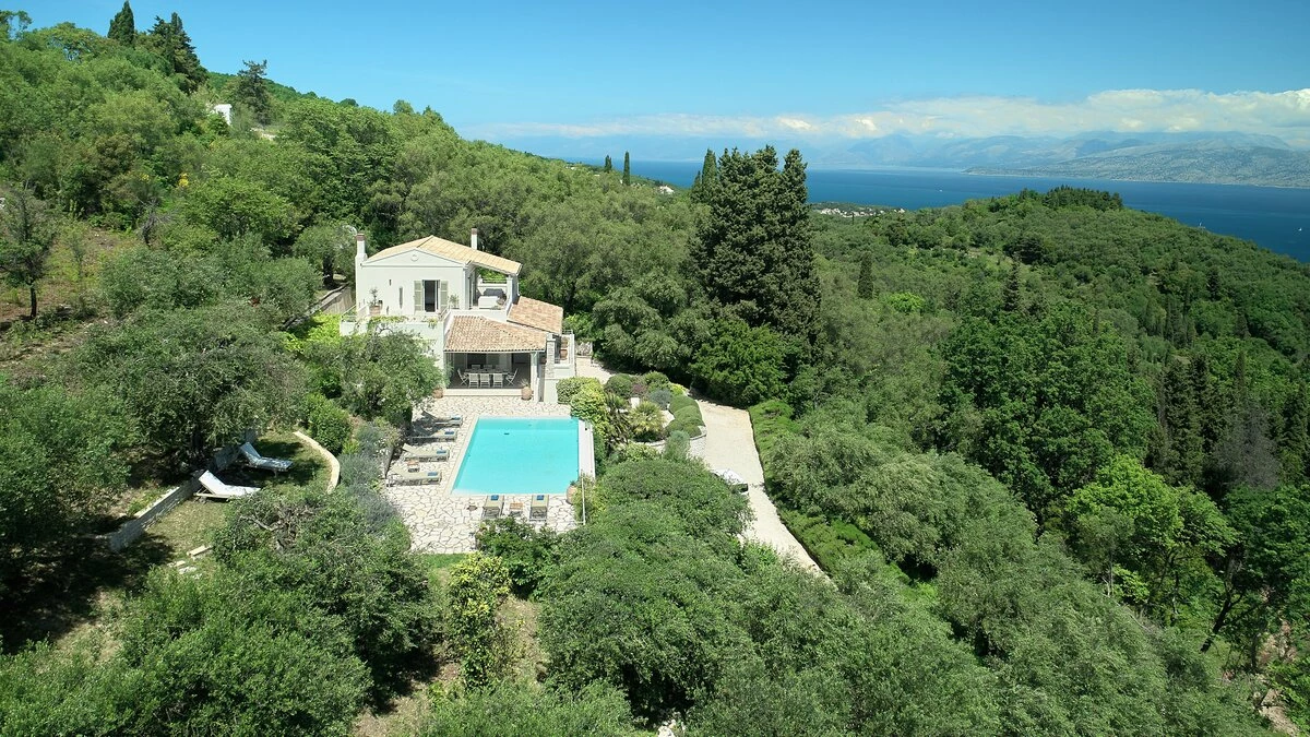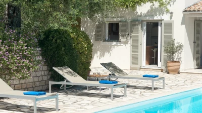 With comfortably furnished terraces forming al fresco sitting and dining rooms, and chic interiors with décor and fabrics in soft creamy tones, this is a spacious family villa in a stunningly scenic setting. Stepped into the hillside on three levels, the villa’s ground floor has a stylish kitchen, and the large and lovely living room, from which doors lead out to the terraces and poolside. Each of the bedrooms has air conditioning and three have an en suite bath or shower room, the first floor master double opening on to a private wrap-around balcony, while the lower ground floor rooms have French doors to a peaceful garden terrace below the villa’s infinity pool. Table tennis provides competitive entertainment; pre-bookable cook service could encourage effortless idling; and walks through the surrounding olive groves are often in the company of little birds and lizards, fearless in their undisturbed environment. Sinies, 800m from the house, has an excellent village shop, bakery and fish shop. The beaches and tavernas of Avlaki and Kassiopi are just 3km away.