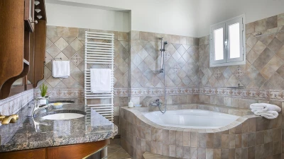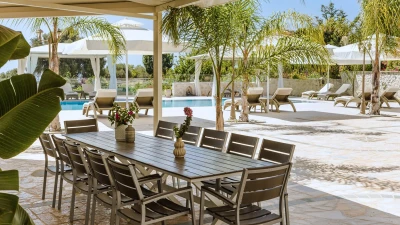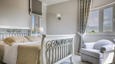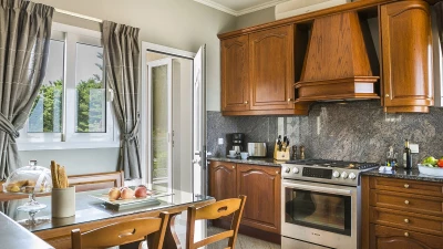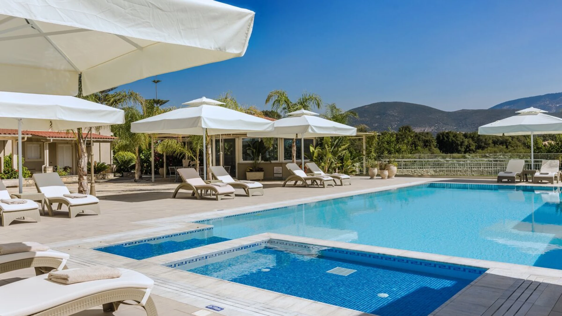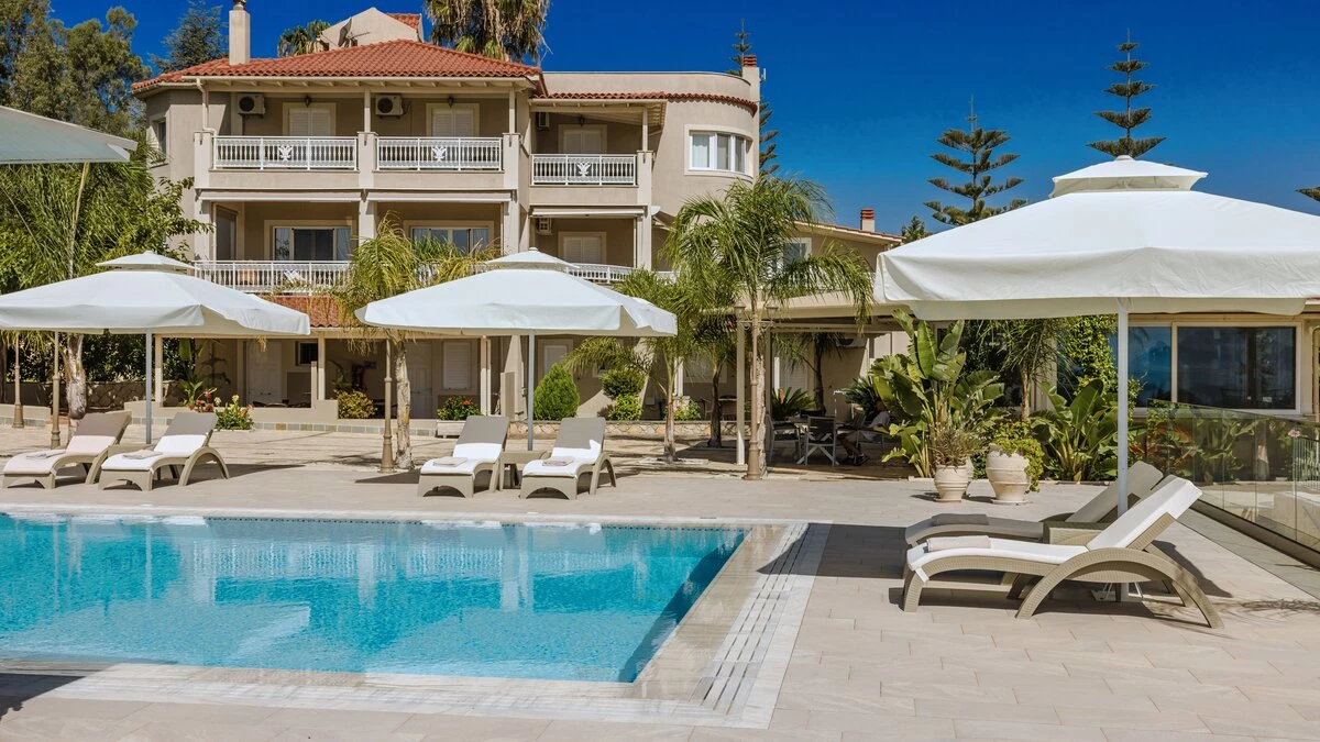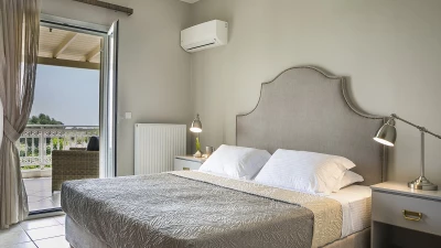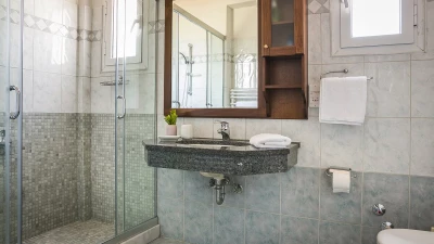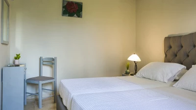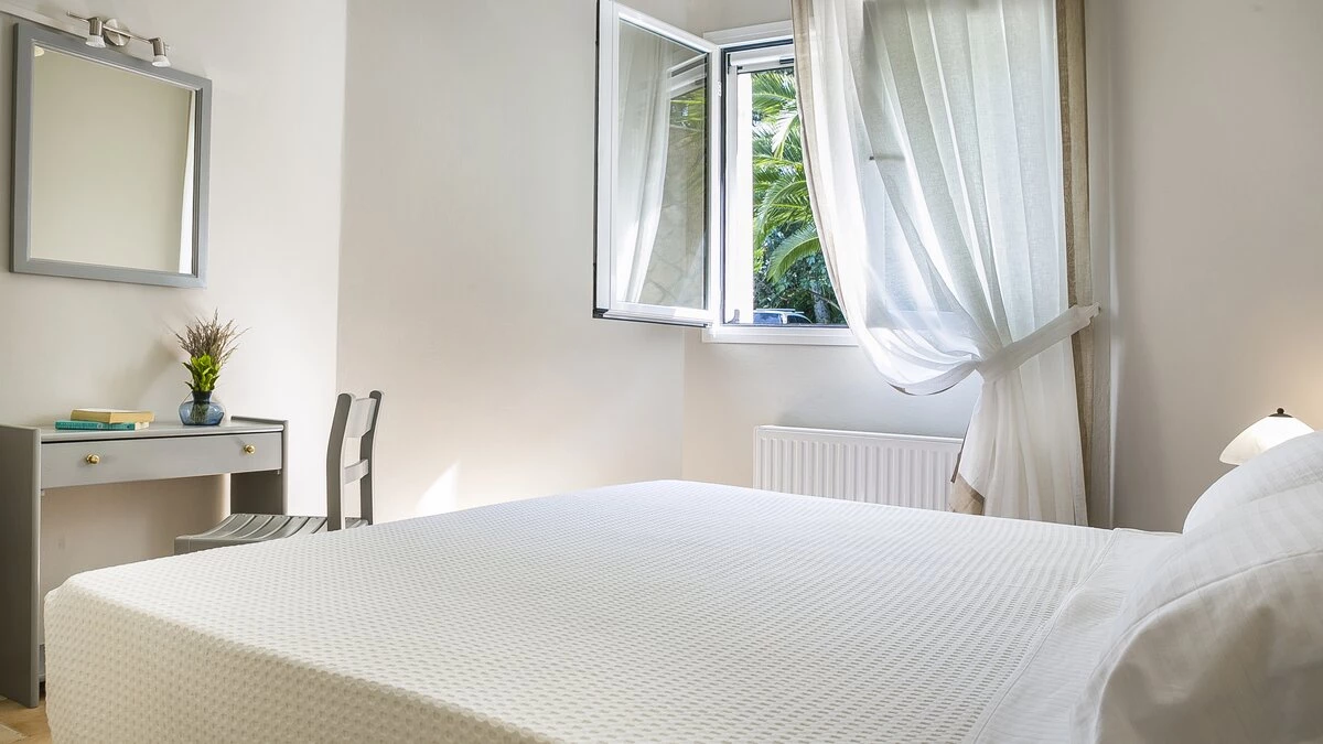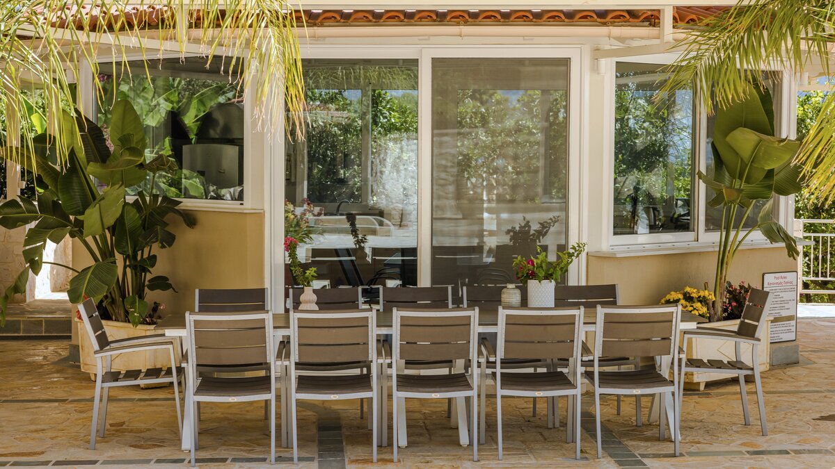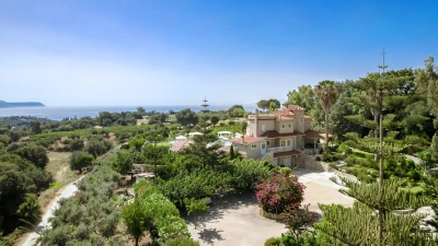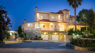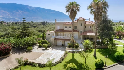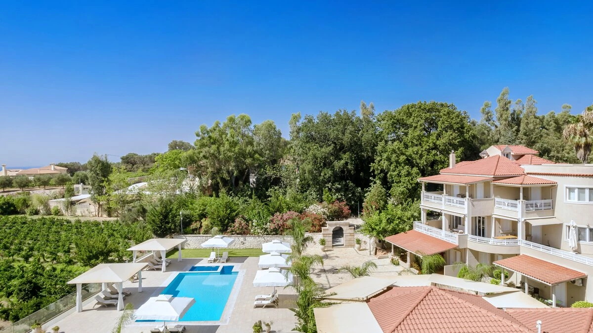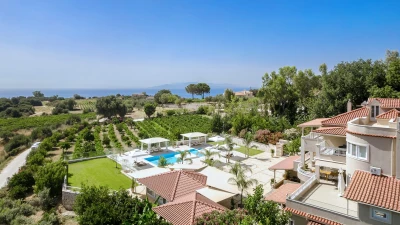 Set in very large grounds near to the village of Spartia, with gorgeous gardens and a sizeable pool, Kosmima is the perfect property for large groups and celebrations with plenty of space for outdoor living and relaxing poolside. Outside, the 5 acres of gardens stretch around the house providing peace and tranquillity and the pool looks out to the sea beyond. A large poolside gazebo provides an outdoor kitchen and large shaded seating area and Kosmima is very well equipped for outdoor weddings and events. Inside the house, the ground floor opens to a large open plan living and dining room opening to a large terrace with views toward the sea and a very well equipped kitchen. Also on the ground floor is a charming double bedroom with adjacent shower room. On the first floor the master double bedroom with en suite bathroom opens to a balcony. Three more double bedrooms (one can be a twin) share two shower rooms opposite and two open to balconies. On the lower ground floor are three independently accessed apartments, each with a small kitchenette and shower room, which open to the pool terrace. Kosmima is walking distance (850m) from tavernas in Spartia, and just 1km from Spartia’s lovely sandy beach.