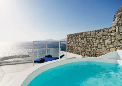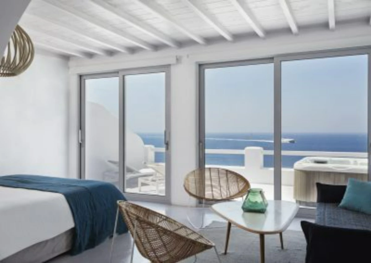 The hotel blends Cycladic charm with elegant contemporary design, creating a relaxed, luxurious atmosphere from the moment you arrive. Suites and rooms are bright, minimalist and beautifully finished, each featuring a private balcony or terrace with sweeping sea views. Some suites offer added indulgence with outdoor jacuzzis or private pools, ideal for sunrise coffees or champagne sunsets.