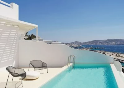 Kouros Hotel Mykonos is a beautifully elevated five-star hideaway overlooking the deep blue Aegean, the marina and the famous Mykonos sunsets. Its privileged position just moments from Mykonos Town makes it the perfect choice for travellers who want tranquillity, style and effortless access to the island’s boutiques, seafront restaurants and vibrant nightlife.
