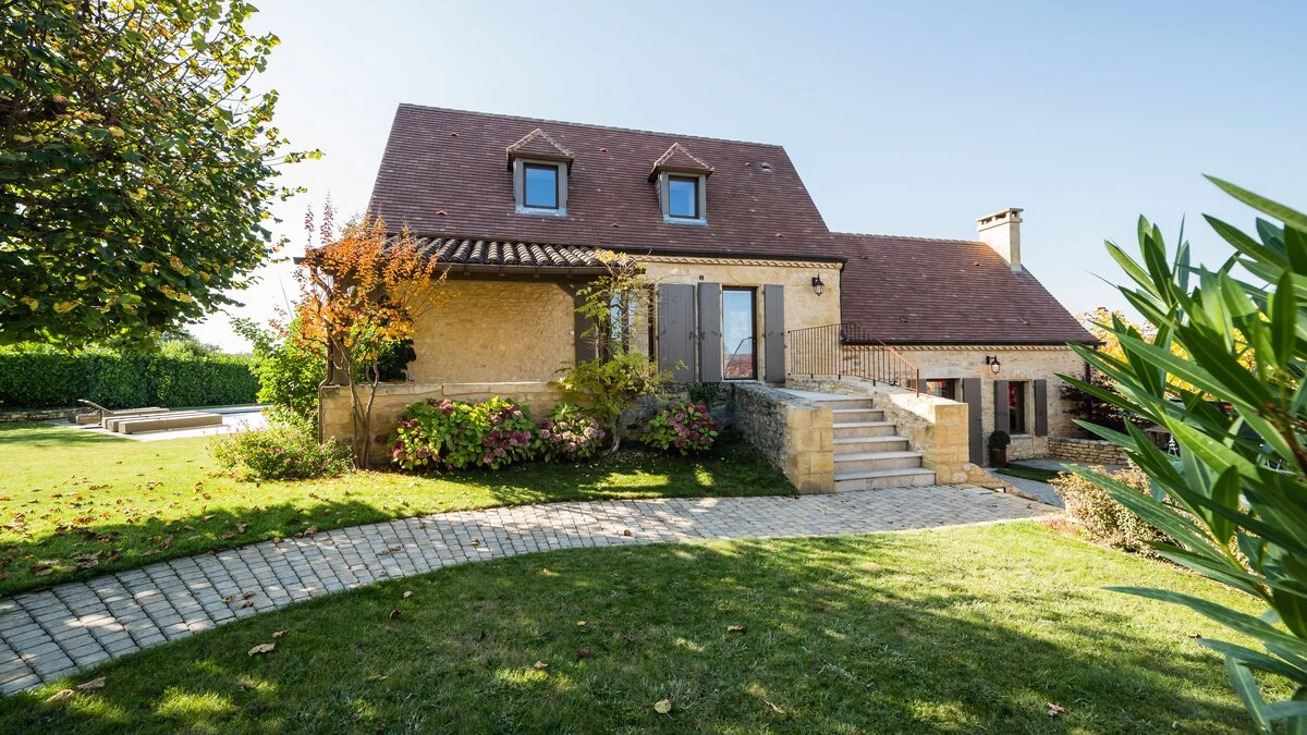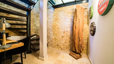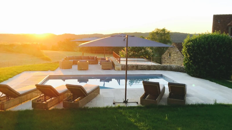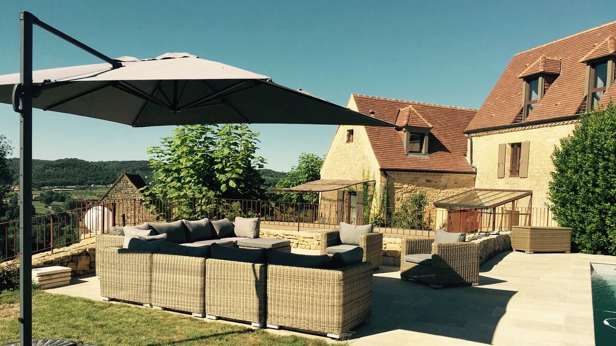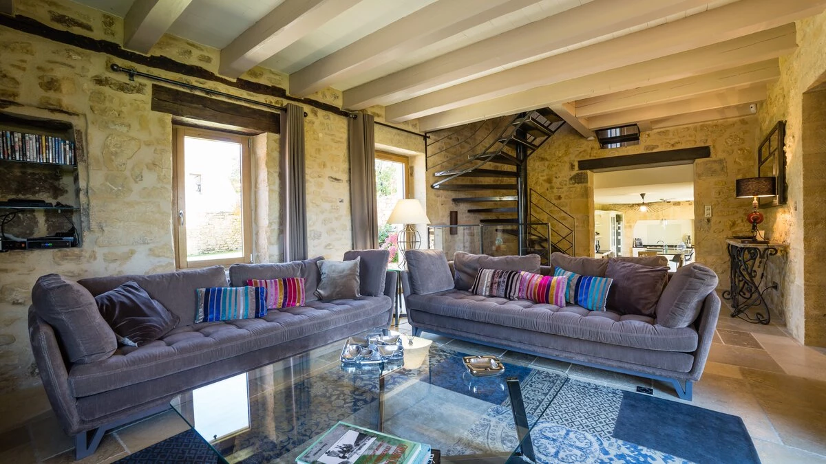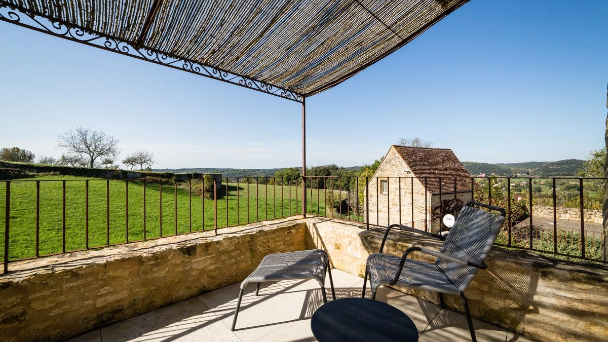 Set over three floors, this spacious stone house has plenty of room for a big family or group of friends. The hub of the house is on the ground floor where there is a large, well-equipped kitchen/dining room and a comfortable sitting room with fireplace. Both rooms feature exposed stone walls offset by stylish modern interiors. Through the French doors in the kitchen you’ll find a pretty garden with shaded dining terrace, perfect for al fresco meals, with a few steps leading up to the pool patio furnished with soft seating and sun loungers. One of five double bedrooms is also found on the ground floor, with en suite shower room and doors opening to a private terrace. The second double bedroom, with bathroom en suite, is found on the lower ground floor along with a study area and utility room, while the first floor is comprised of three double bedrooms all with shower rooms en suite. La Balade is part of a collection of four properties and can be rented alone or as part of Le Village along with La Cour, La Loge and La Maisonette.