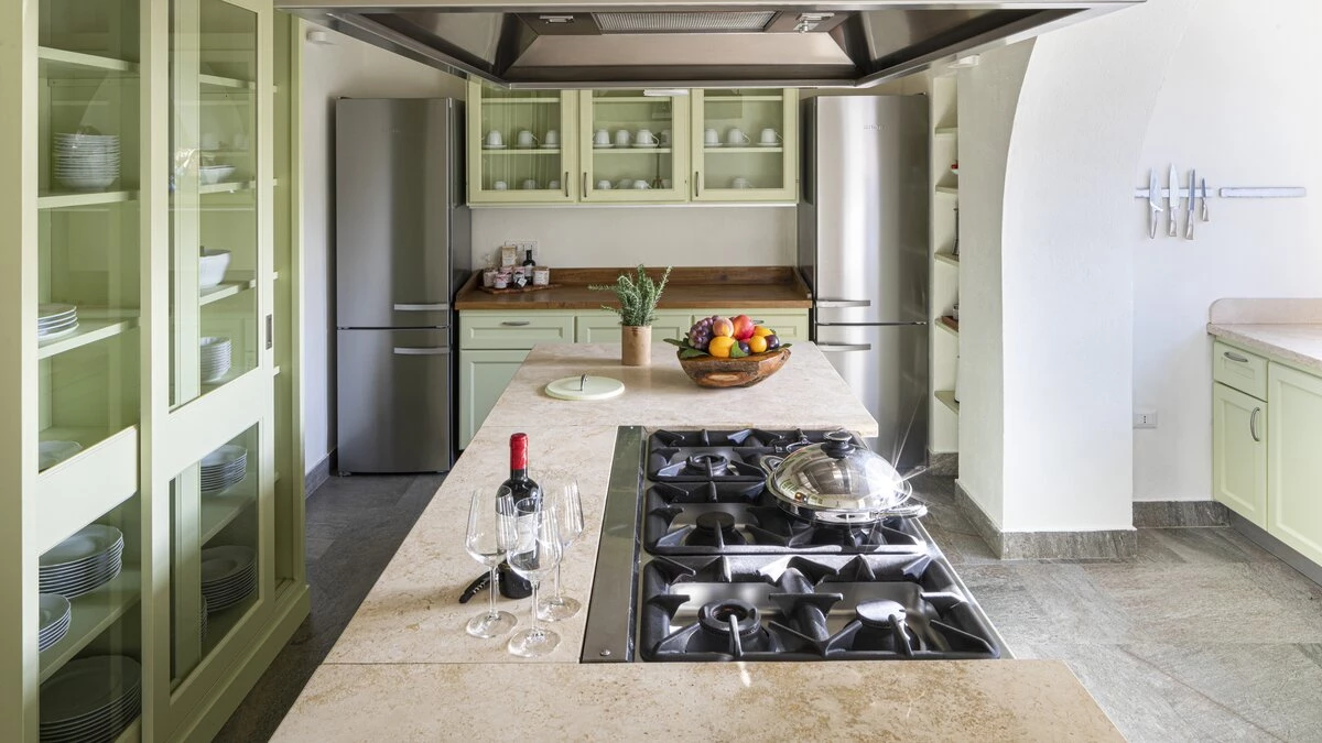 Inside the villa, the spacious open plan living room warmly welcomes guests into the property, elegantly blending into the adjacent dining area, perfect for families or large groups of friends. The kitchen has a beautiful, contemporary design, rich in colour, and fully equipped with professional equipment for all your culinary needs. The five large bedrooms around the villa continue this trend, adopting vibrant hues that contrast with the exterior landscape, bringing light to the villa’s many interior comforts. Outside, the large, covered loggia offers an area to enjoy meals from the shade whilst enjoying breathtaking views of the surrounding region and nearby lake.