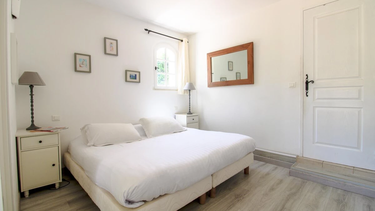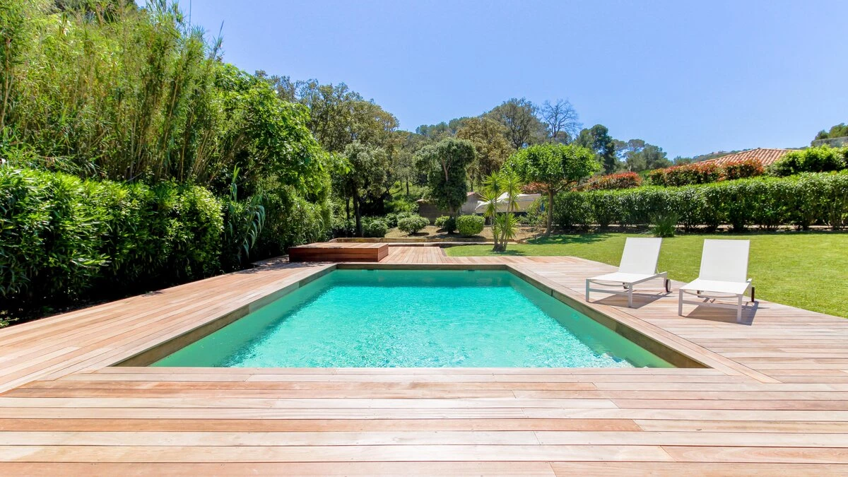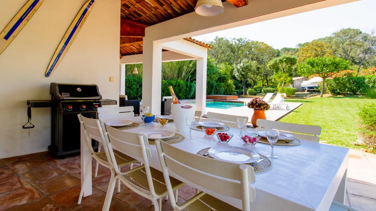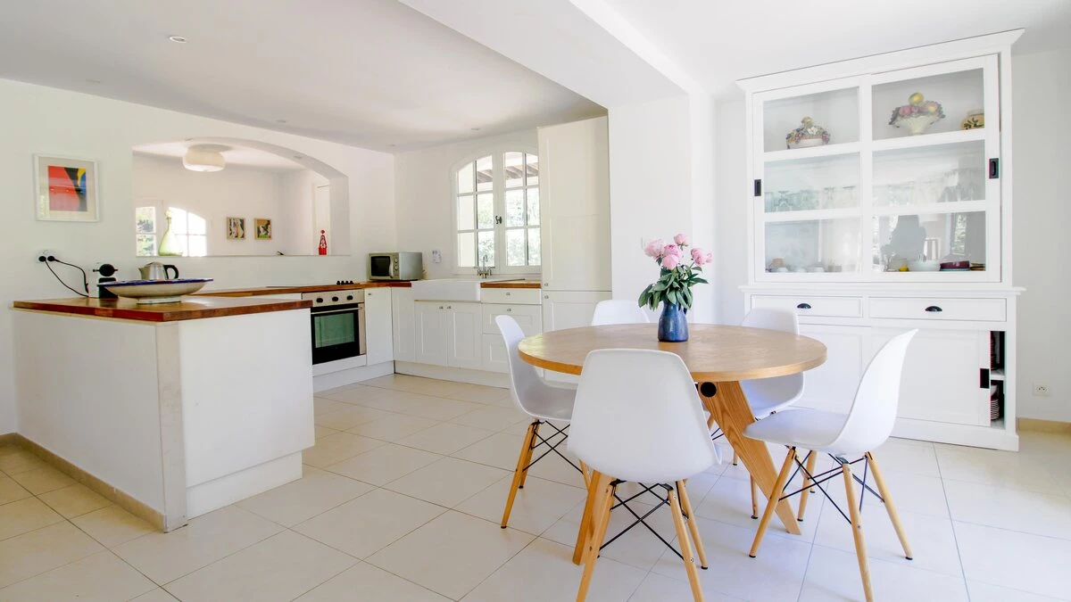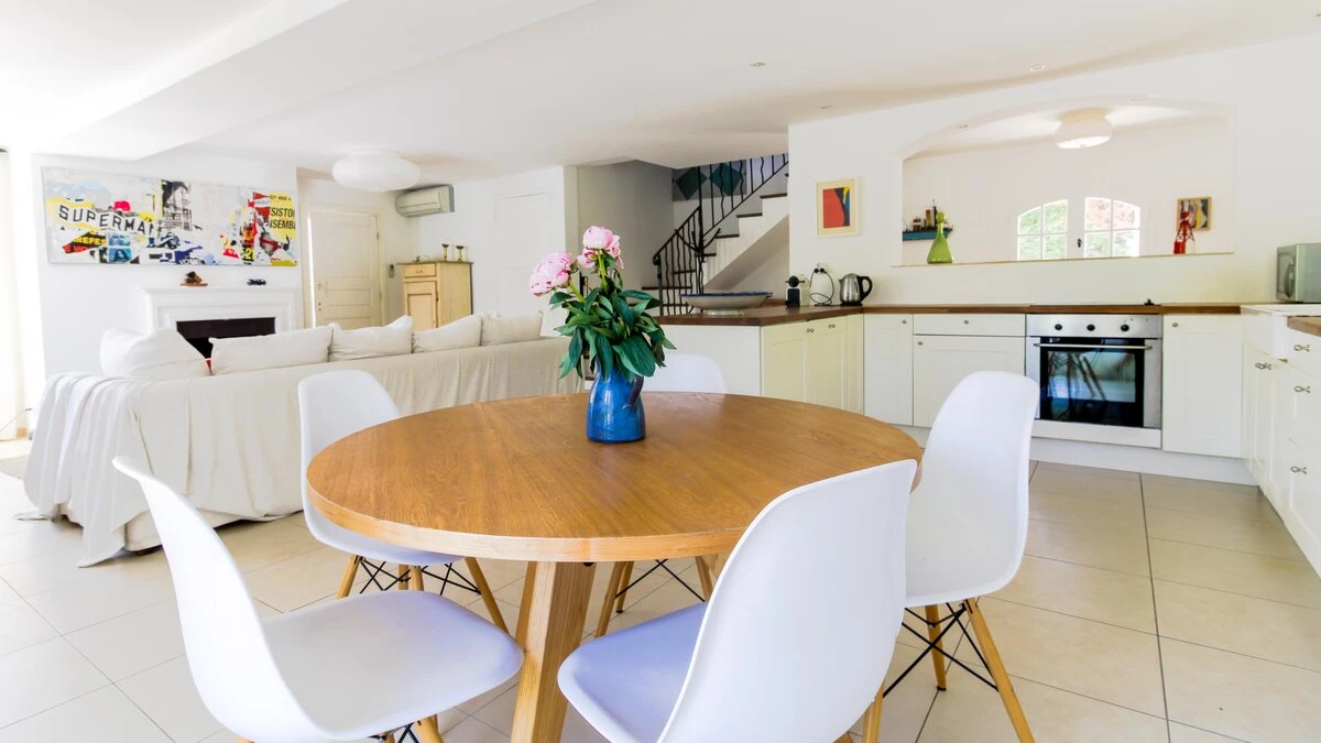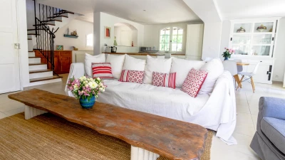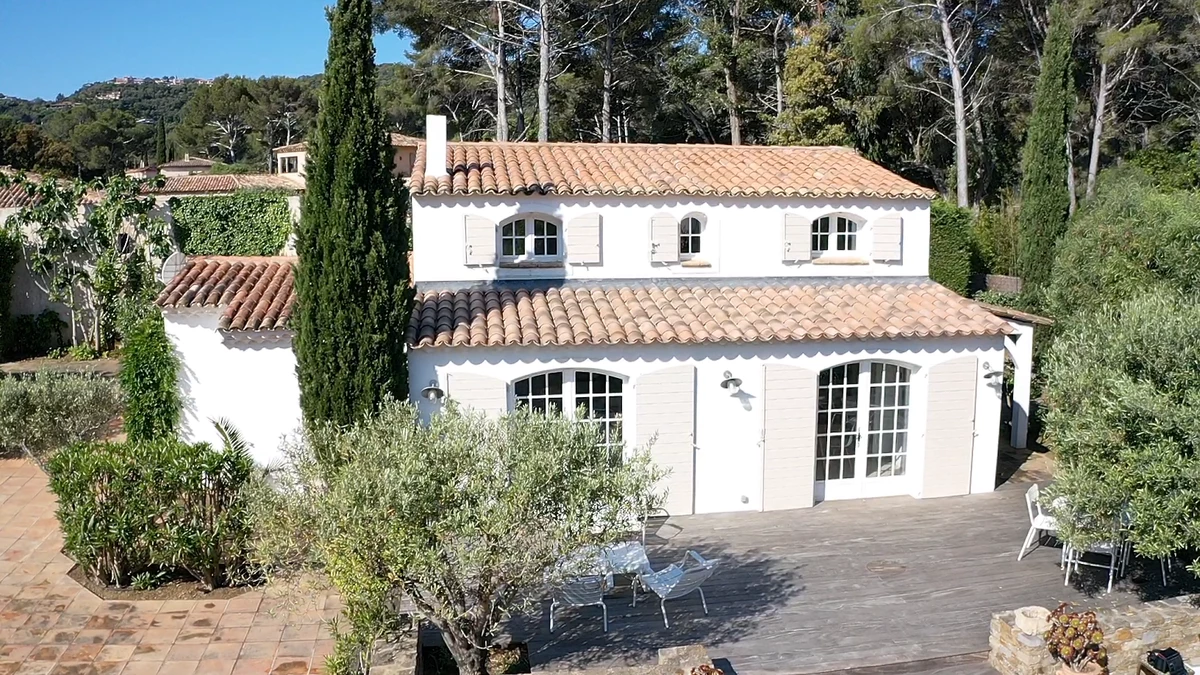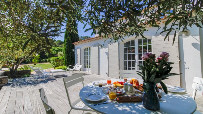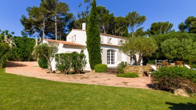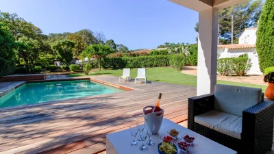 Situated on a private estate, on an exclusive peninsula cocooned in three hundred acres of pine forest, and footsteps away from the sea. La Pinede is a charming house whose white washed walls contrast with the verdant greens of its surrounding forest. The house features open-plan living, simply decorated in calming, neutral tones. The salon opens out through French doors on to a pretty terrace featuring olive trees and seating ideal for al fresco dining on balmy summer evenings. The garden opens out onto lawned areas featuring the private swimming pool, as well as shady spots courtesy of the surrounding forest.The estate also features tennis courts within the domaine, and a private beach a short walk from the property.