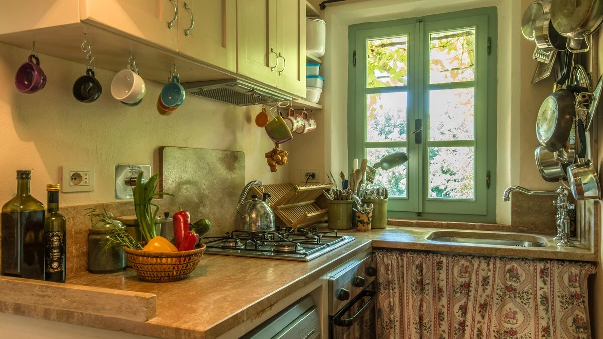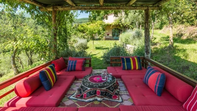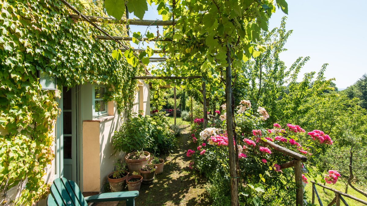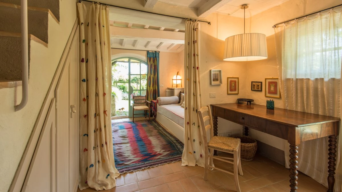 The setting is superb for this honeymoon hideaway. Nestled into grassy gardens in the gorgeous hills of southern Tuscany, the villa combines all the peace of the countryside with easy access to Cetona, its narrow streets and busy piazza about five hundred metres away. After imaginative restoration, inside and out, the villa has a rustic-chic feel, from its terracotta tiled floors to its cheerful rugs and fabrics and whitewashed beamed ceilings. With a double bedroom on the upper floor, the compact ground floor sitting room has double doors to a shaded al fresco dining terrace, the small kitchen opens out to a vegetable garden, and a study in the inner hallway leads into the dining area.