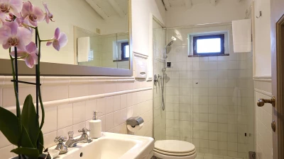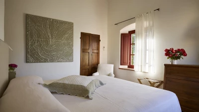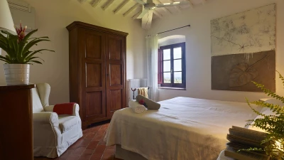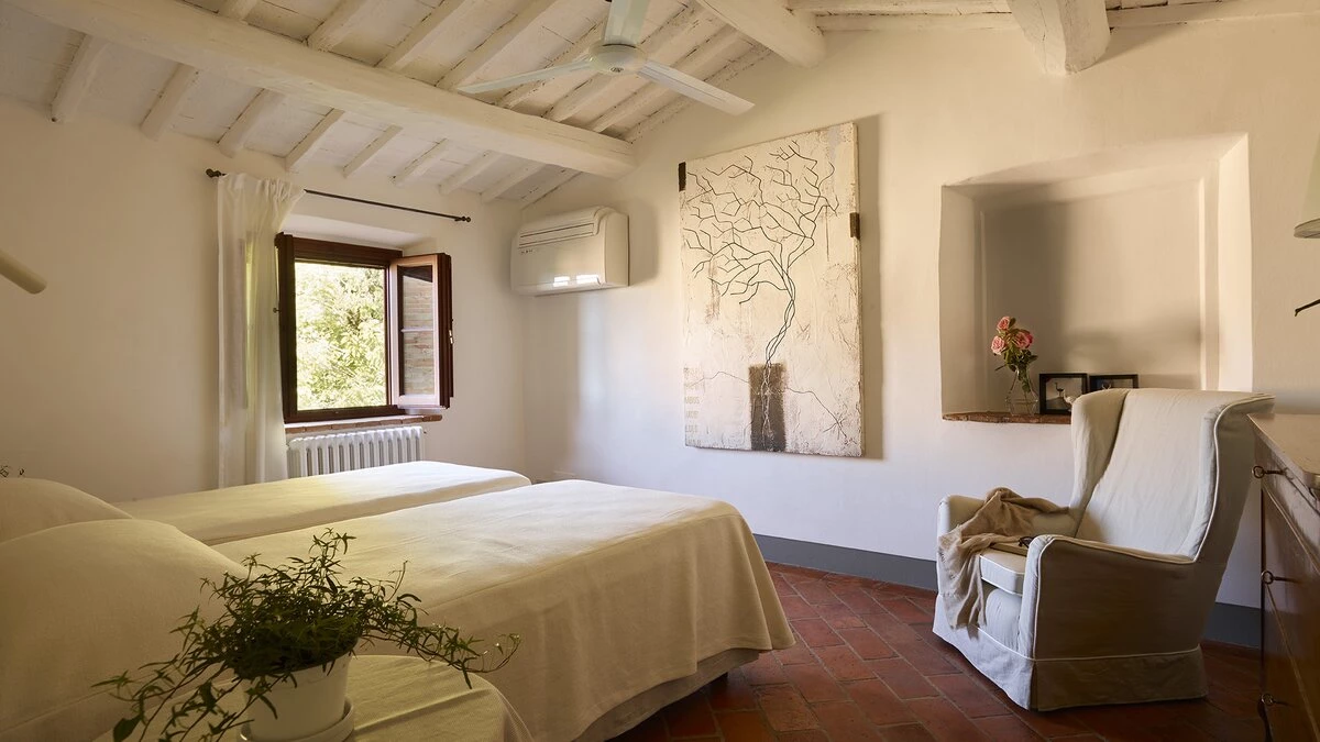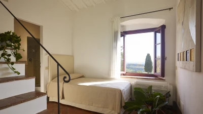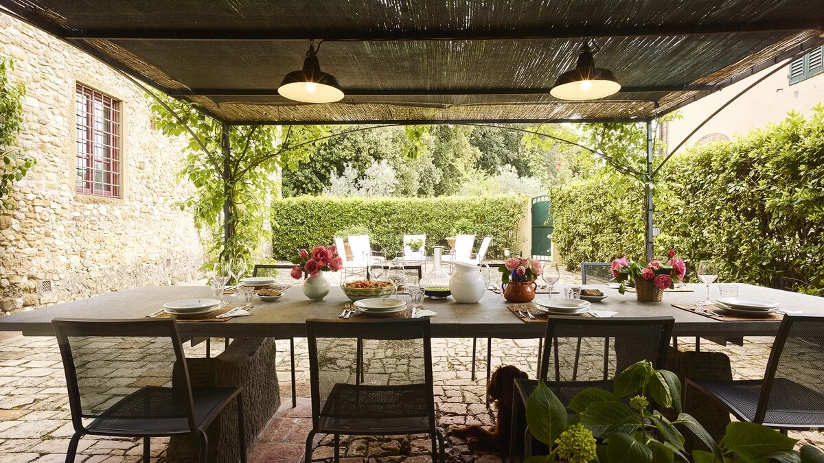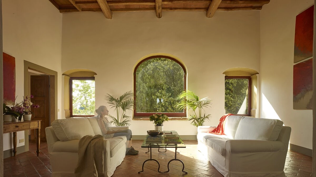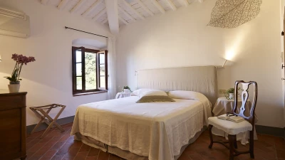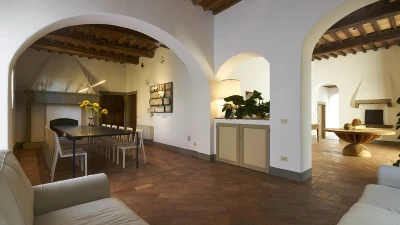 Nestled close to Florence in the Chianti area, Le Cascine is a wonderful historic country villa ideal for group getaways with family and friends. This property has been beautifully restored and furnished with a combination of contemporary and authentic decor, paired with charming beamed ceilings and modern artwork. On the ground floor, guests can head through the entrance hall to discover a lovely open plan living room with a dining area, as well as a fully-equipped kitchen opening to the shady dining terrace. Two double bedrooms can be accessed via a few steps, each kitted with an en suite. The first floor features two further spots to relax; a sitting area and hall with cosy armchairs. Four double bedrooms and a single can also be found here, each with a shower room en suite.
