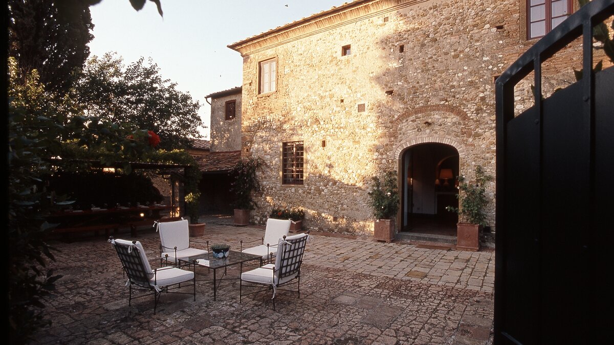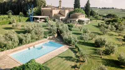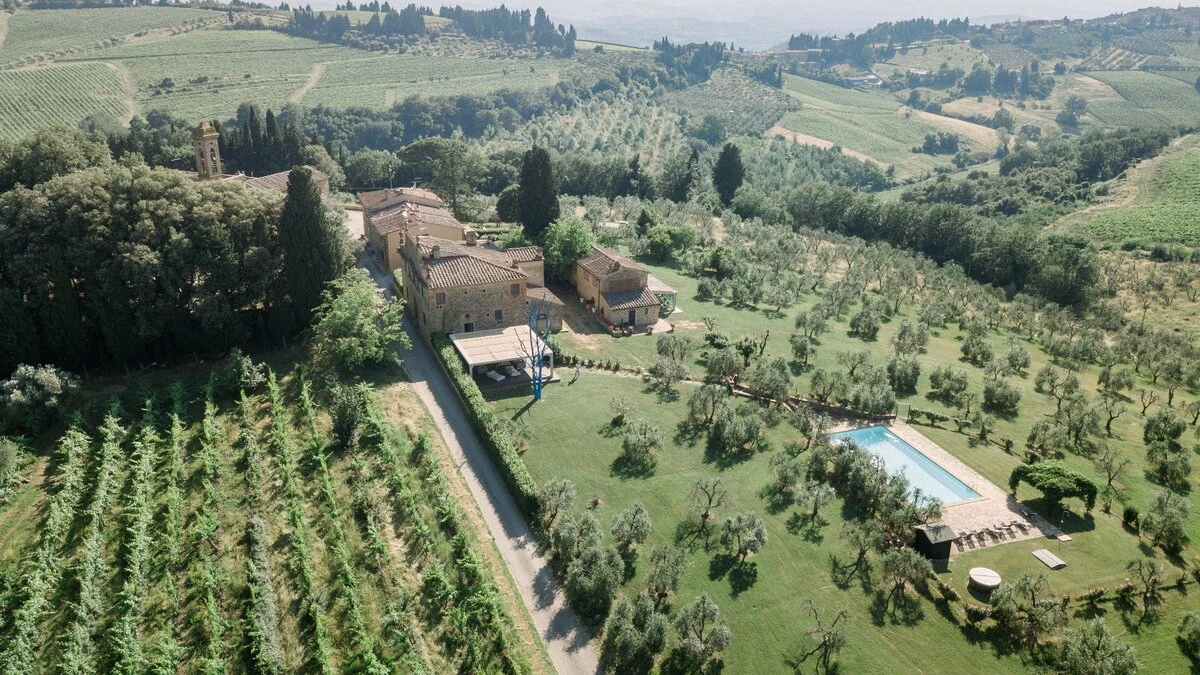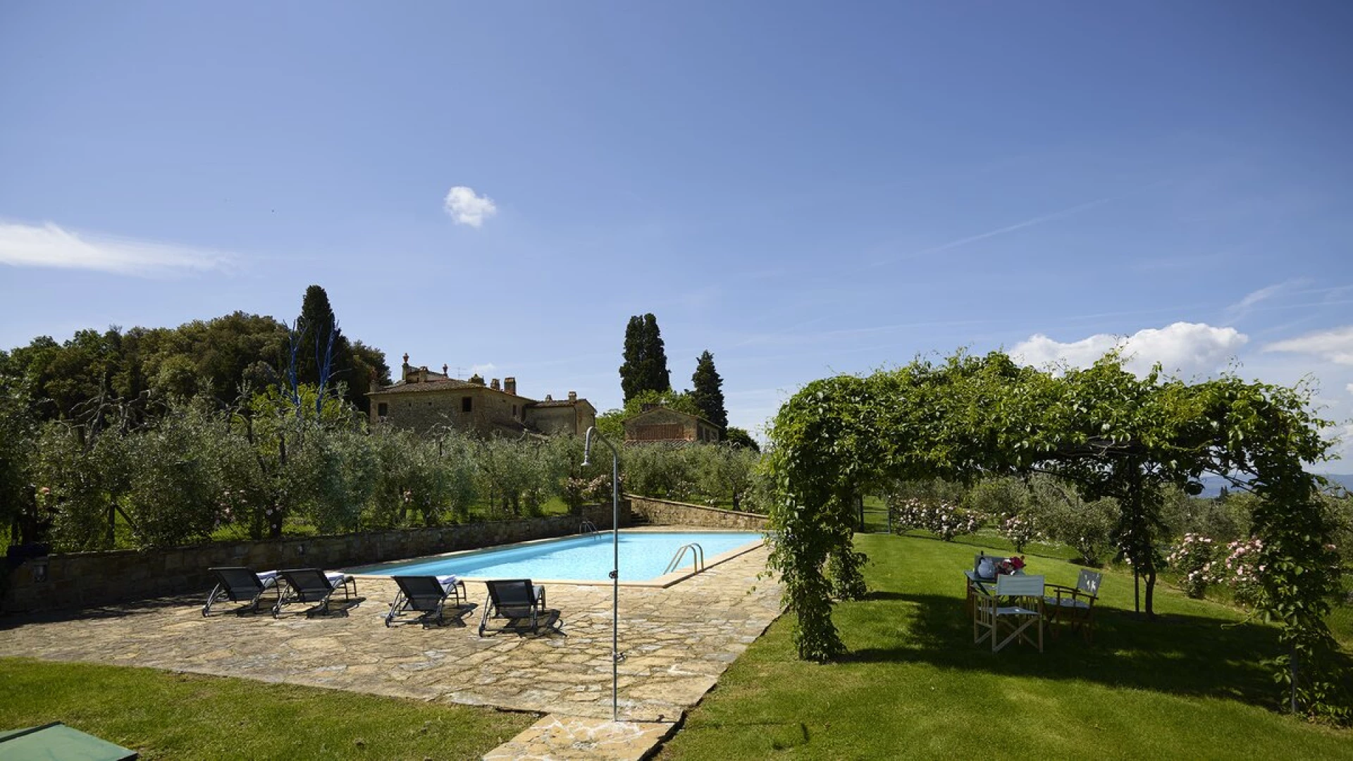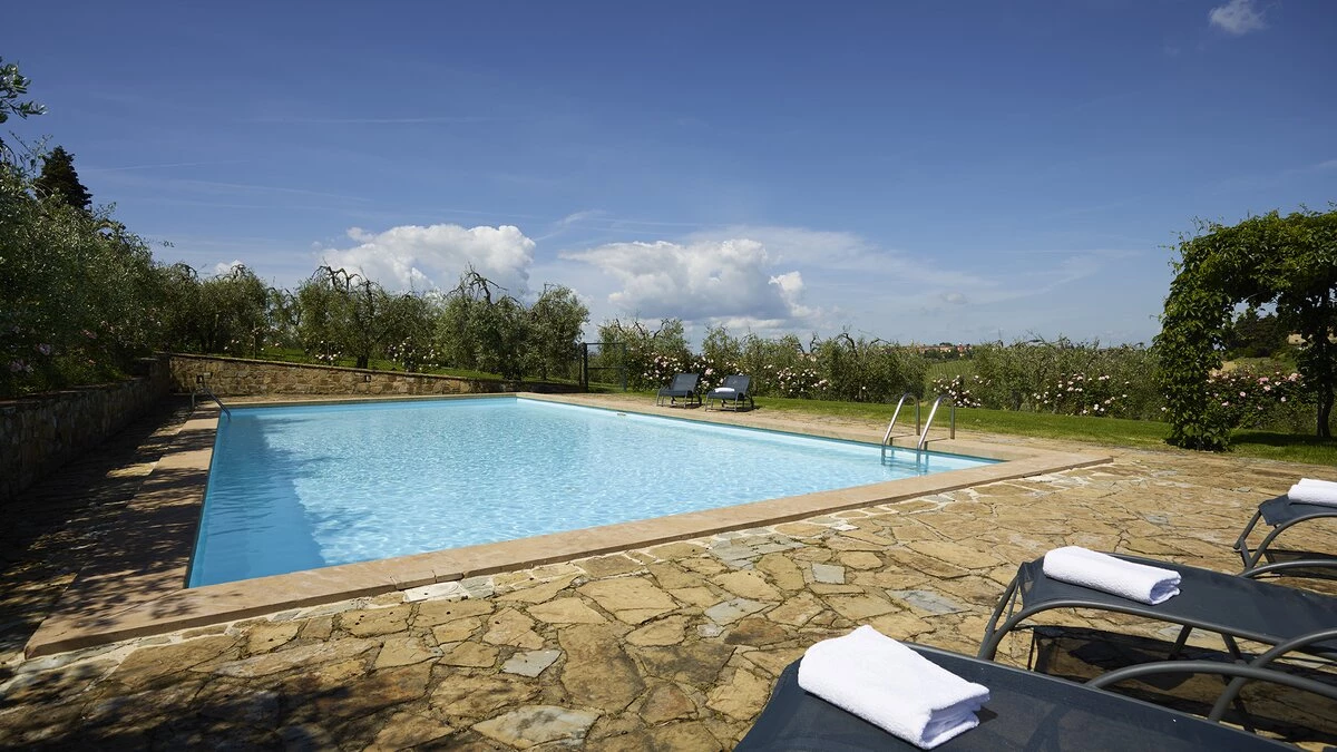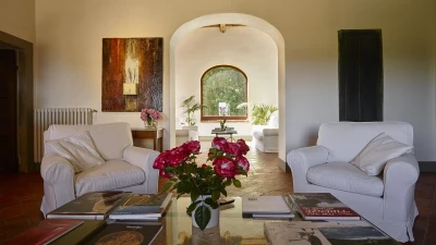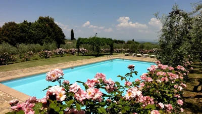 The villa is surrounded by large gardens, ideal for garden parties and special celebrations. The large, private pool is perfectly positioned among wide lawns, vineyards and olive groves. This property, set in the heart of Tuscany, is about 1.5km away from the quaint town of Tavarnelle Val di Pesa. It is the perfect base for sightseeing, and within driving distance of Florence, vineyards in Chianti and the towns of  Volterra, San Gimignano and Siena. The closest airport can be found in Florence, just 39km from the villa.