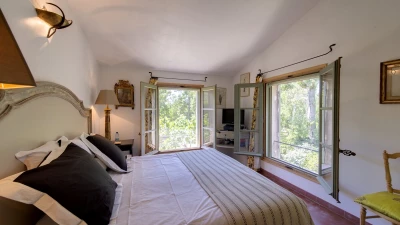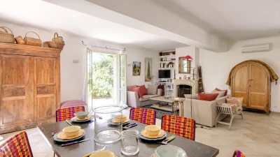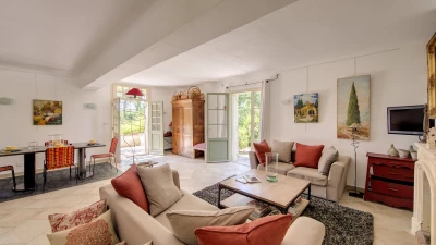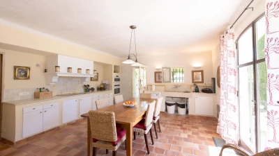 A splendid driveway lined with palms is the introduction to this sensitively restored Provencal ‘mas’. With its soft green window shutters, leafy pergola-shaded terrace, and long lawns punctuated with terracotta planters and tightly trimmed trees, the villa is a blissful blend of past and present comfort. Tastefully furnished interiors include a large and well-equipped kitchen with doors leading out to the dining terrace; a comfortable and quietly stylish living room, focused on an open fireplace; and three lovely bedrooms, each flooded with light from big windows, and fitted with an air conditioning / heating system.
