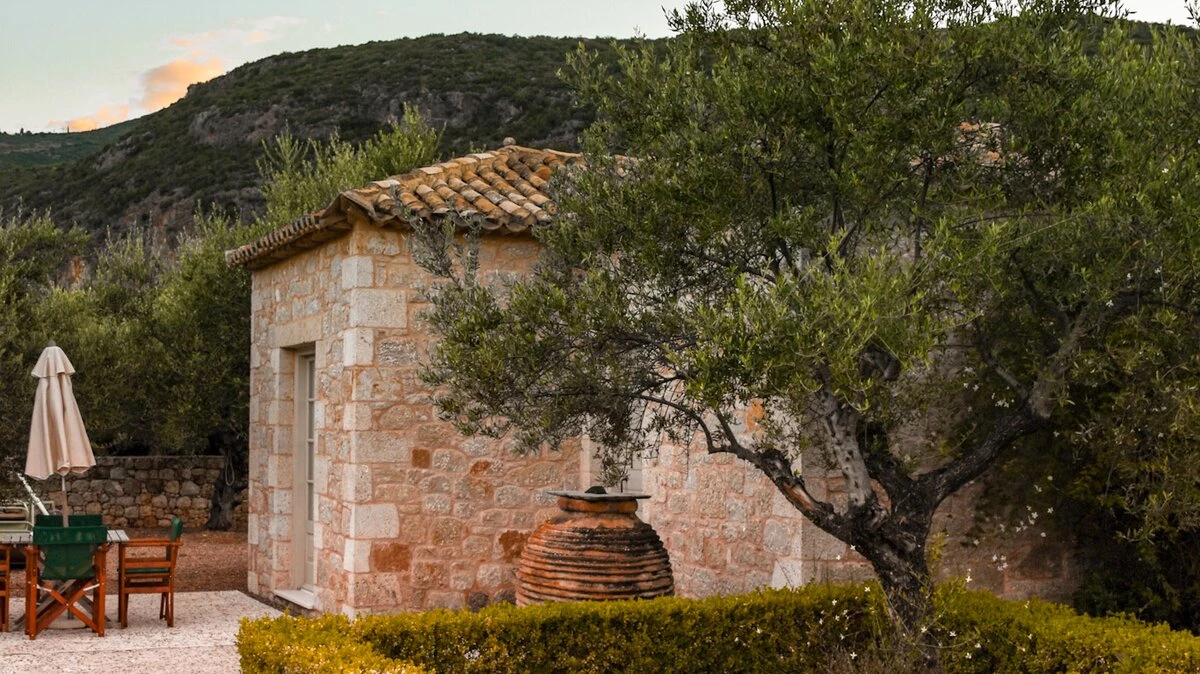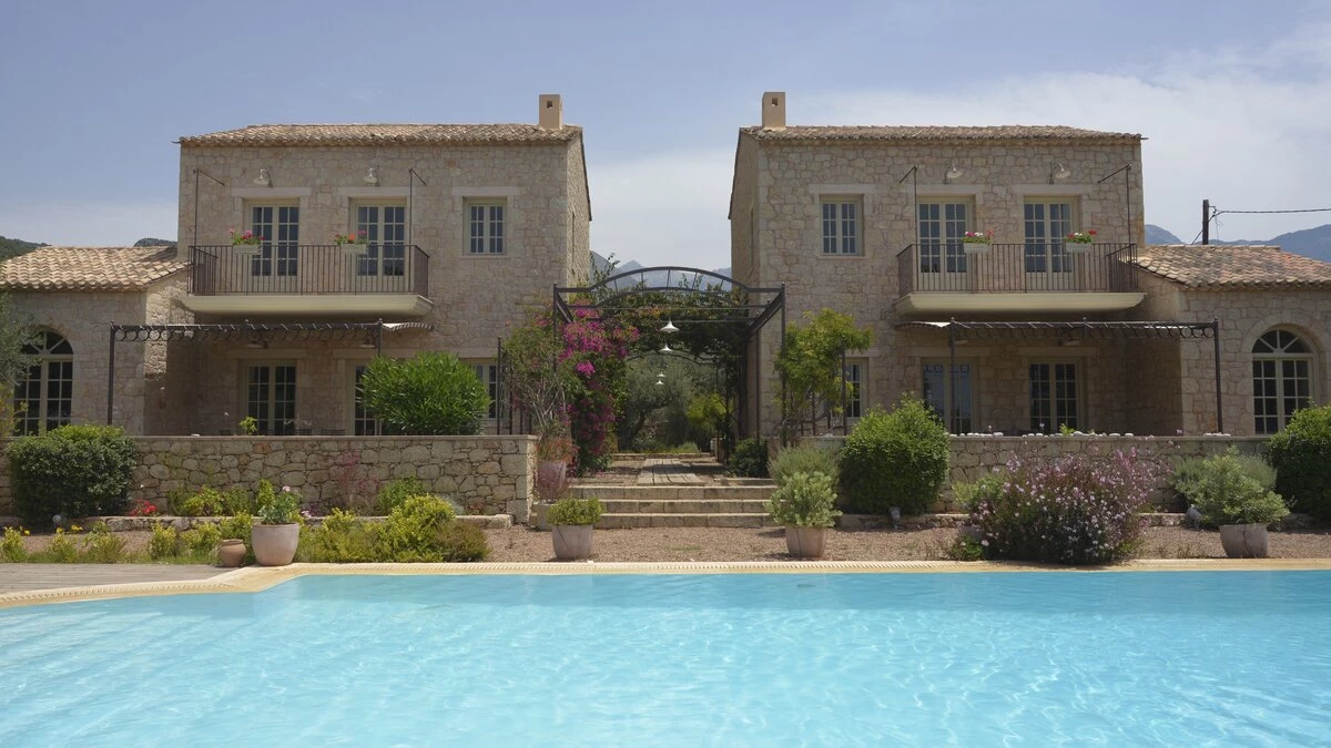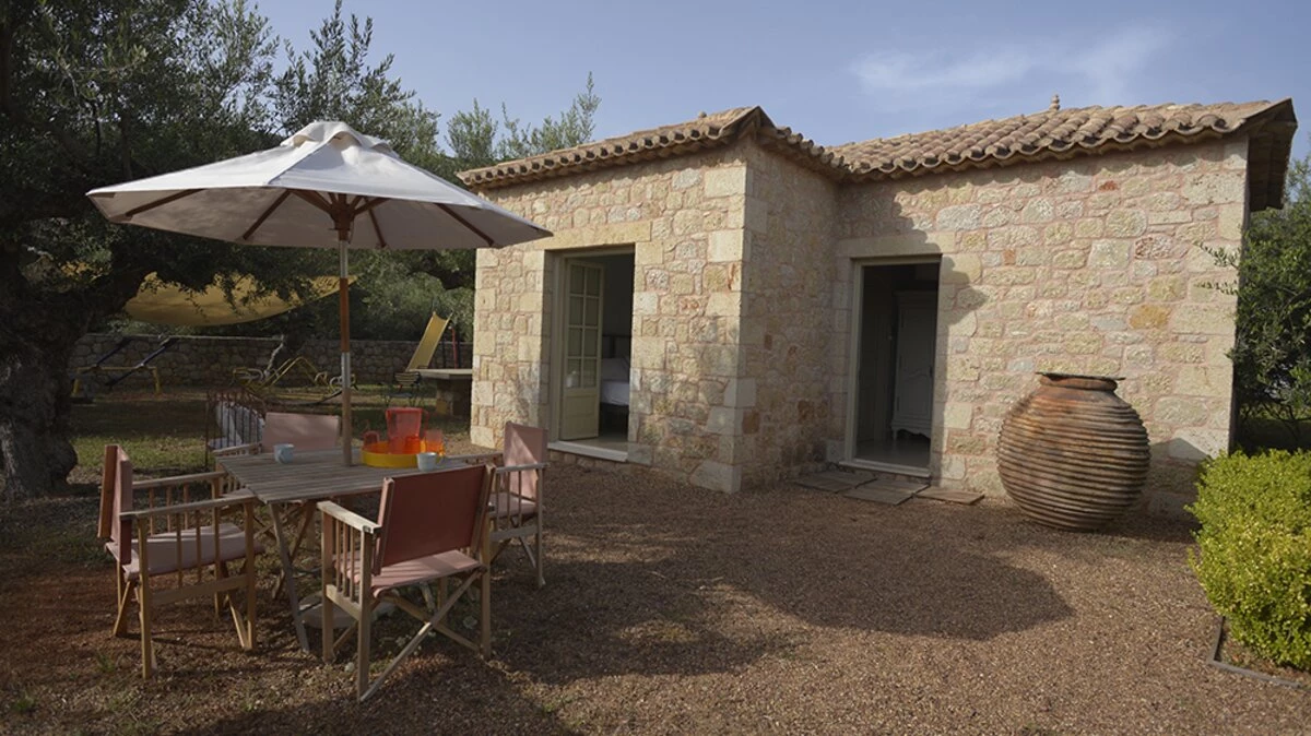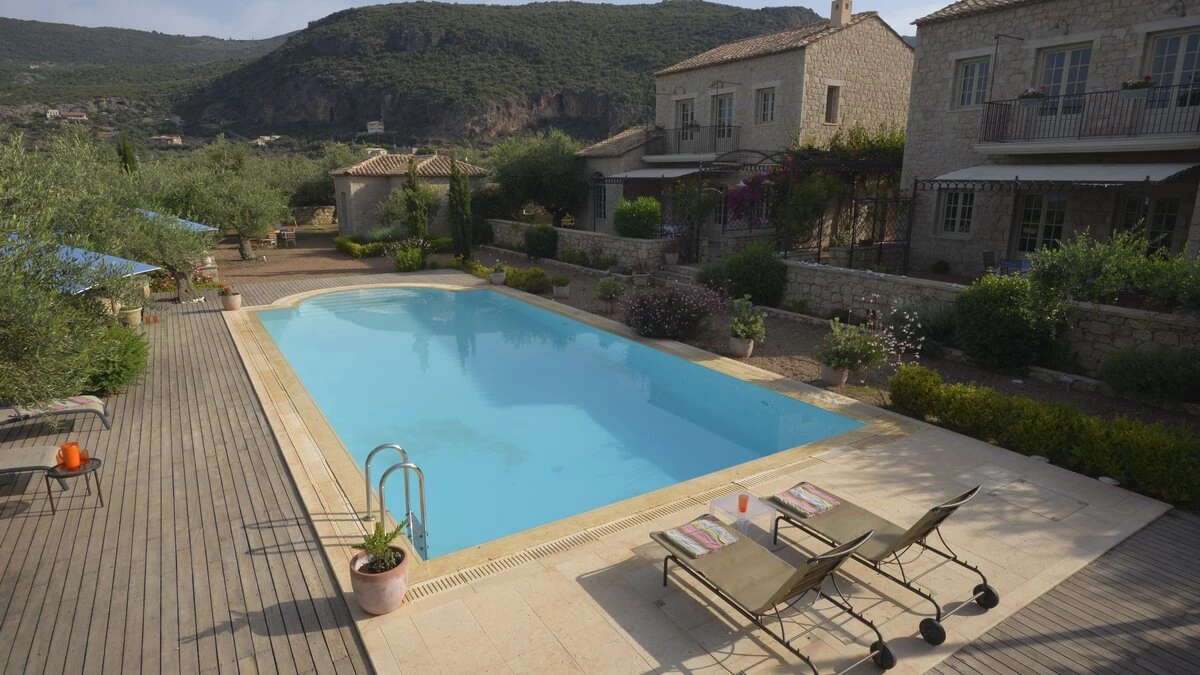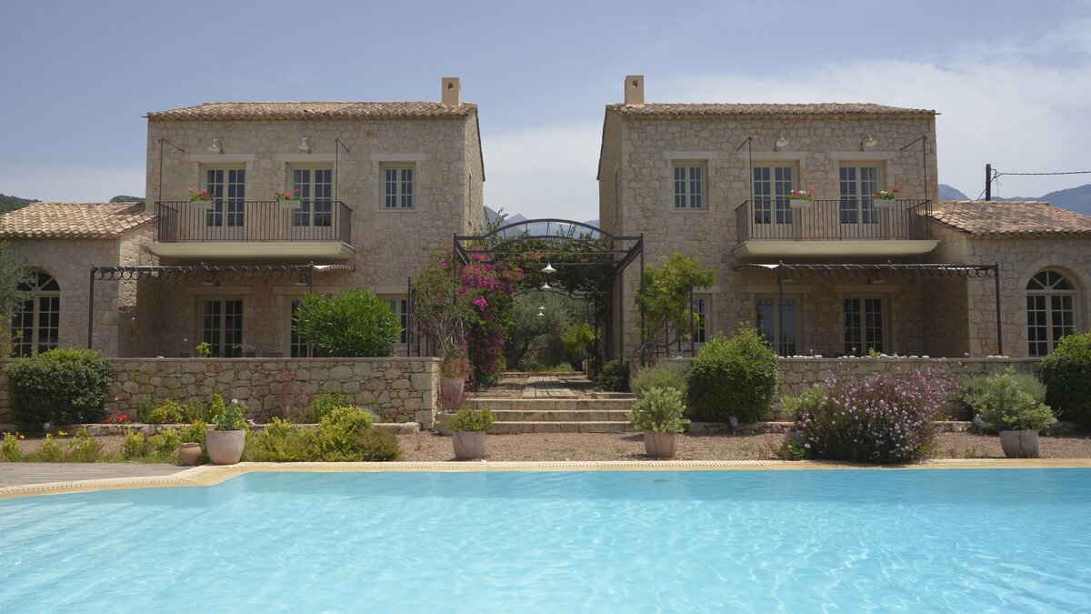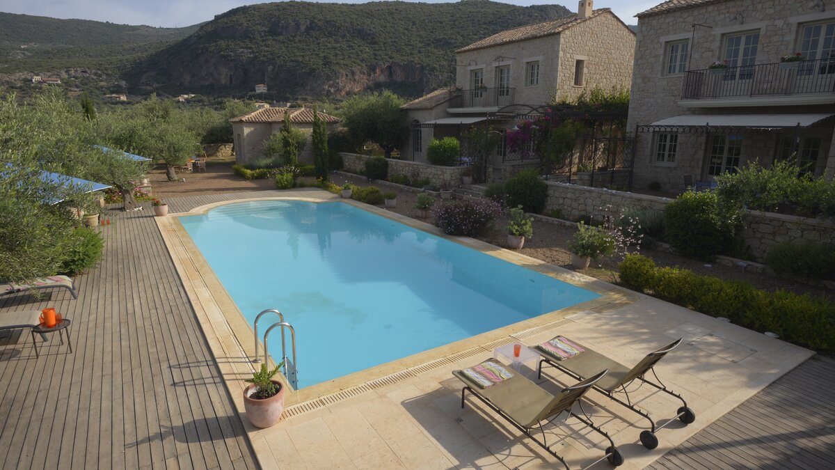 With its history dating back to Homeric times, its setting between the sea and the Taygetos slopes perfect for coast and country exploration, and its traditional tavernas sprinkled at the water’s edge, Kardamyli is an idyll for the Grecophile. A ten minute walk from the village centre and just a stroll through the grounds from Ritsa beach, Liodentra encapsulates the timeless charm of the area, while incorporating very contemporary comforts. The matching main villas, Ena and Thio (‘One’ and ‘Two’), are furnished individually, elegantly blending comfortable sofas and cool-toned décor with character and colour in Persian rugs and Swedish dowry chests.Each has a kitchen, living room and double bedroom on the ground floor, a sitting area and twin bedroom above, and a timber decked al fresco dining terrace overlooking the twelve metre swimming pool. The adjacent annexe offers privacy for the fifth en suite bedroom, and all are air-conditioned. Perfect for two families or a group of friends, excellent service is a hallmark here.