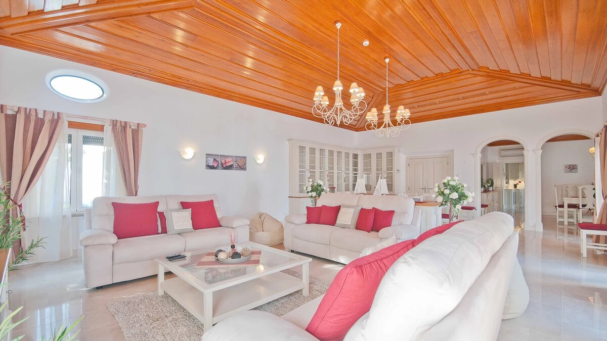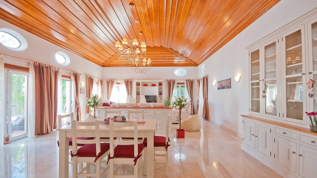 Topped by multi-level rooves, smartly painted in bold blue and white, and encompassing generous terraces framed by broad arches, Magnolia presents an imposing exterior, and the villa’s interiors are no less impressive. Polished floors and decorative timber ceilings frame brilliant white décor, highlighted with bright red fabrics, in a series of spacious and airy rooms, all well equipped for comfort. With air conditioning throughout, there are two bedrooms on the upper floor and three at ground level, each with en suite bath or shower room; while free-flowing social space includes an attractive breakfast kitchen, leading through archways to the large and lovely living/dining room, which has double doors to a part-shaded terrace, furnished with sofas and a dining suite.