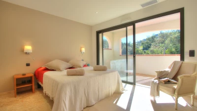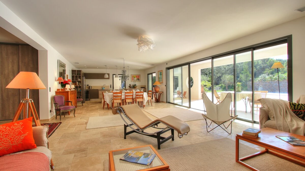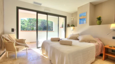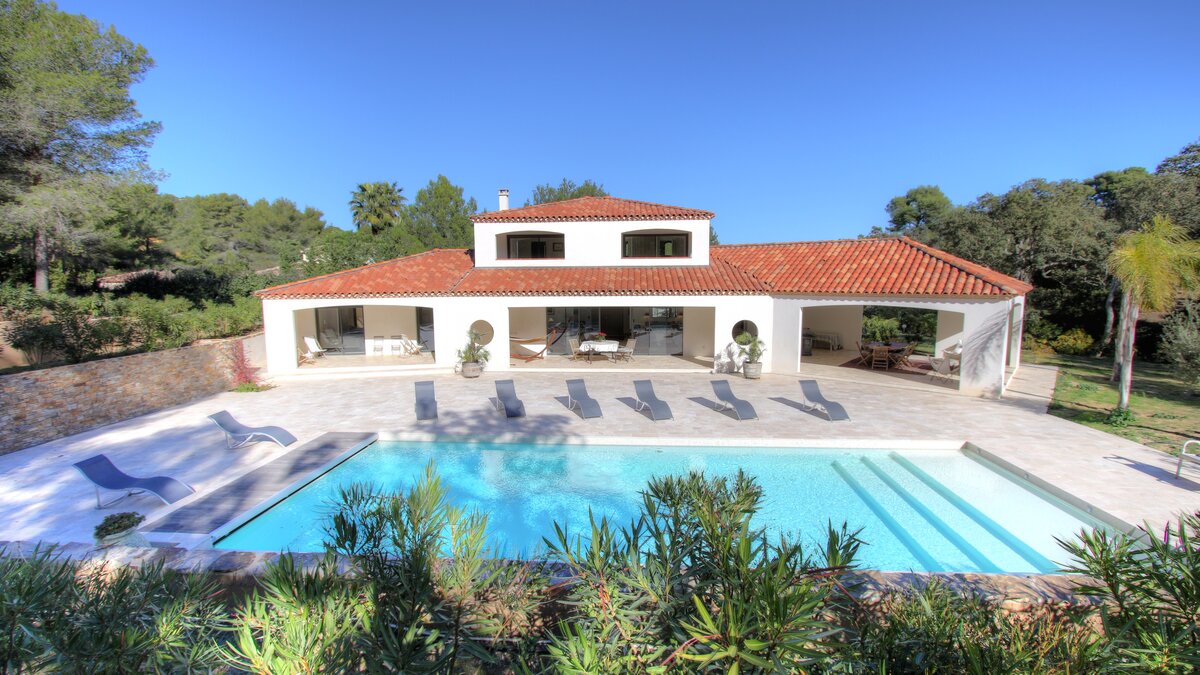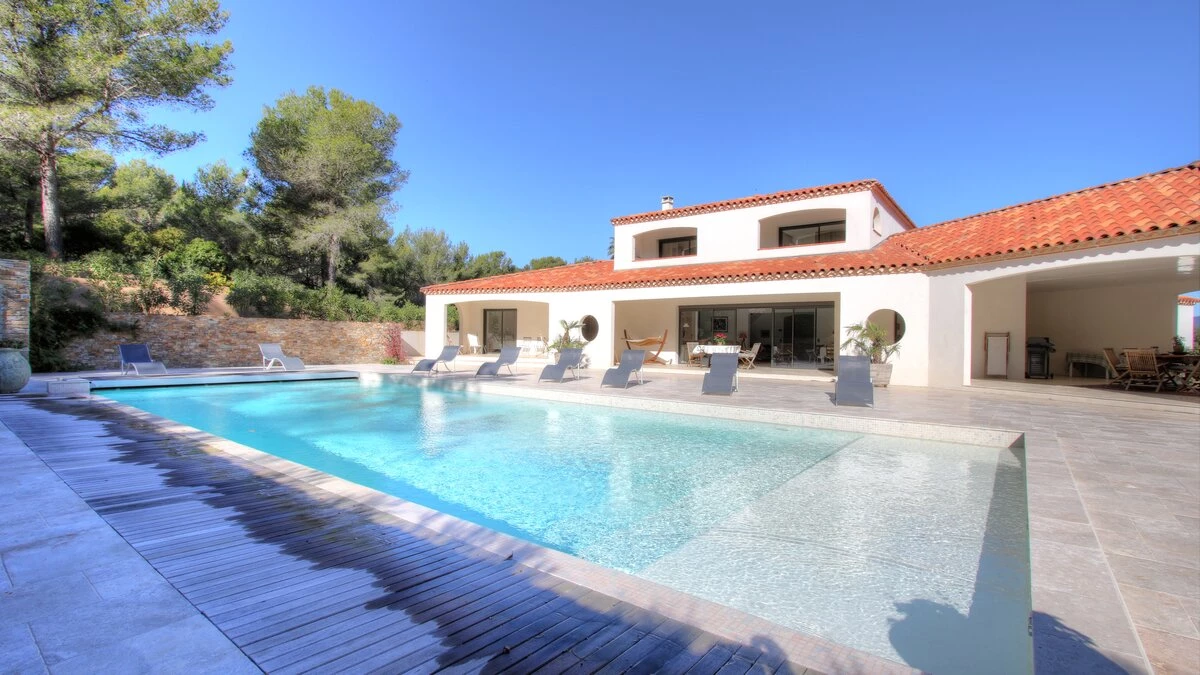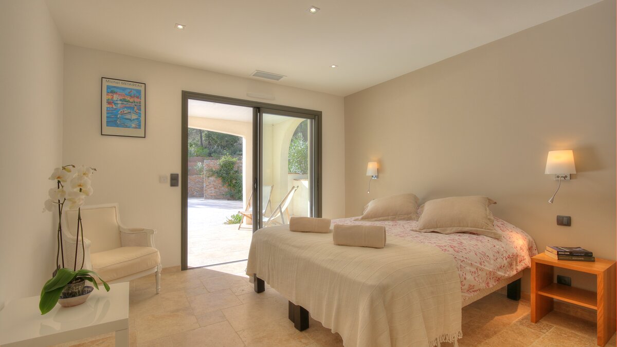Located in a renowned private estate surrounded by pine forests on the Cap Benat, this modern newly built villa is nestled amongst a Mediterranean garden complete with boules pitch. An inviting entrance hall leads into the main open plan living area with a sleek, modern kitchen and a dining and sitting area complete with fireplace for colder evenings. The property has been beautifully decorated, with neutral contemporary interiors combined with carefully selected pieces of furniture, and quirky touches throughout the living space. Glass sliding doors blur the distinction between outside and inside areas, and allow access to the spacious covered terrace complete with gas barbeque, dining table and a choice of seating area, all overlooking the large swimming pool. On the same floor there are three light and airy twin bedrooms, two with en suite bathrooms, and a children’s room with bunk beds. All twin bedrooms can be made up as double bedrooms on request. On the first floor there are two double or twin bedrooms with en suites and sliding glass doors out onto the balcony. The estate boasts shared tennis courts and a private beach only 750m from the property. The shops and restaurants of charming Bormes-les-Mimosas are just 8km away, and glitzy St. Tropez is within 45km of the estate, with its exclusive shops, restaurants, night life and famous harbour.