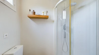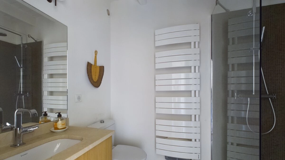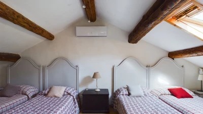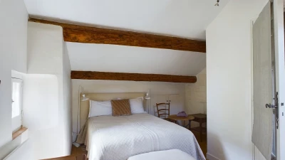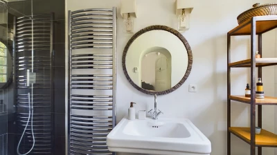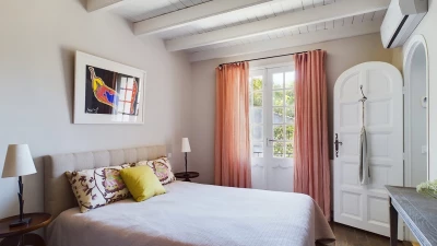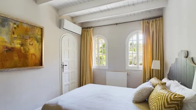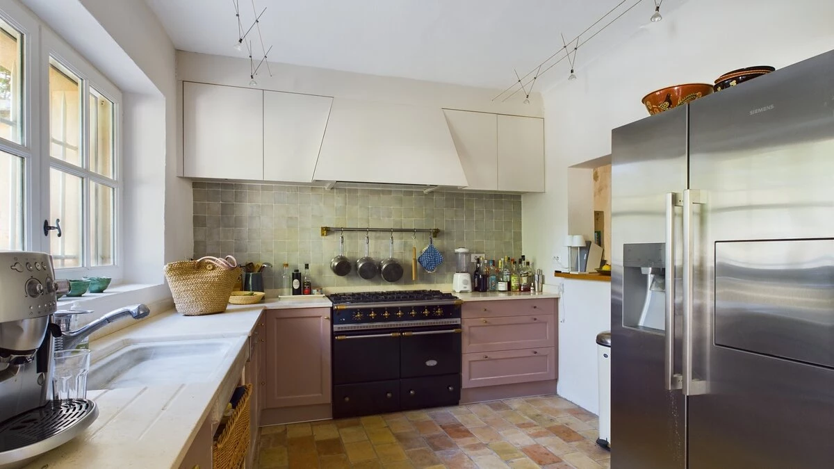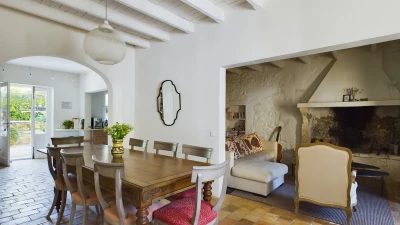 The downstairs area of this villa is designed for comfort and conviviality. As you step inside, you are welcomed by a cosy living room adorned with comfortable seating and rustic décor that reflects the Provençal style. A charming fireplace serves as the focal point, making it a perfect spot to relax once the nights draw in. The fully equipped kitchen features modern appliances and plenty of counter space, ideal for preparing delicious meals. Whilst the dining area, with its large table and elegant settings, offers a delightful space for family gatherings and shared meals. Doors open directly to the outdoor terrace, allowing for easy indoor-outdoor living.