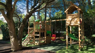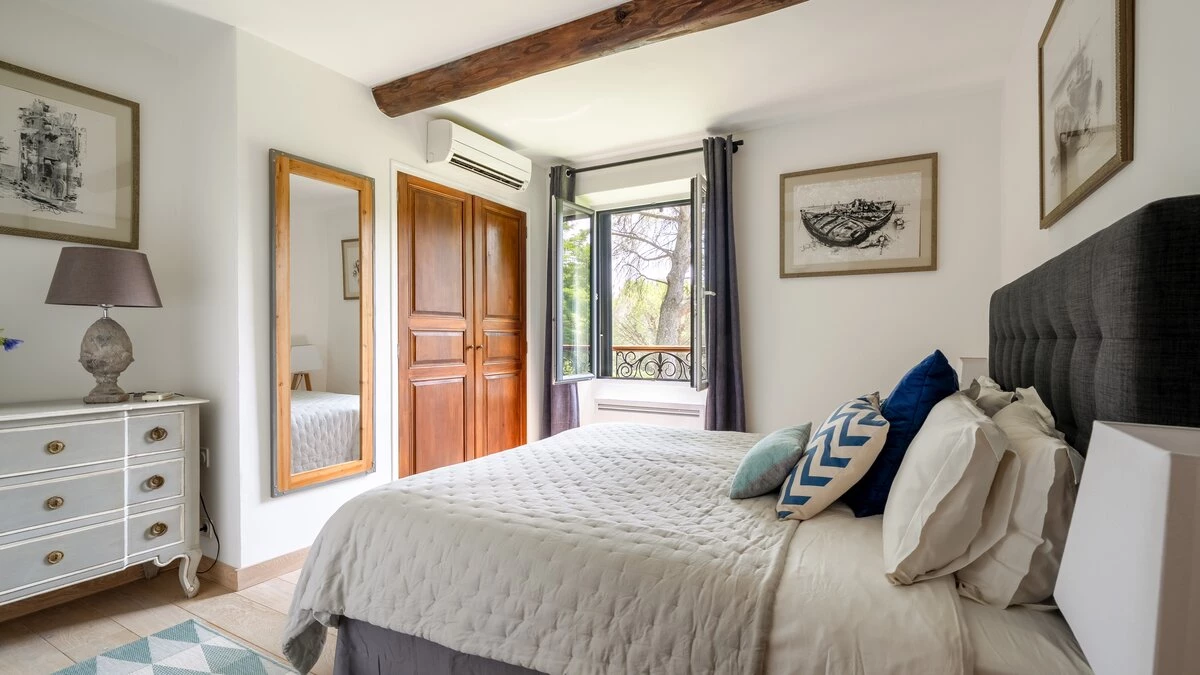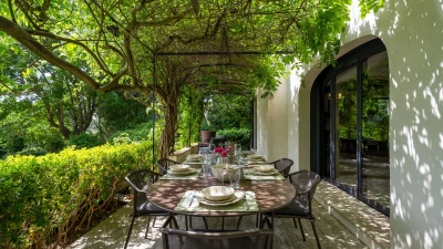 Outside, the villa truly comes into its own. A swimming pool is framed by a paved sun terrace and shaded seating areas, offering space to lounge, read or simply soak in the scenery. A wisteria covered pergola creates a picturesque setting for long, lazy lunches and candlelit dinners. Younger guests are well catered for too, with a hidden playground and ping-pong table tucked into the landscaped gardens.