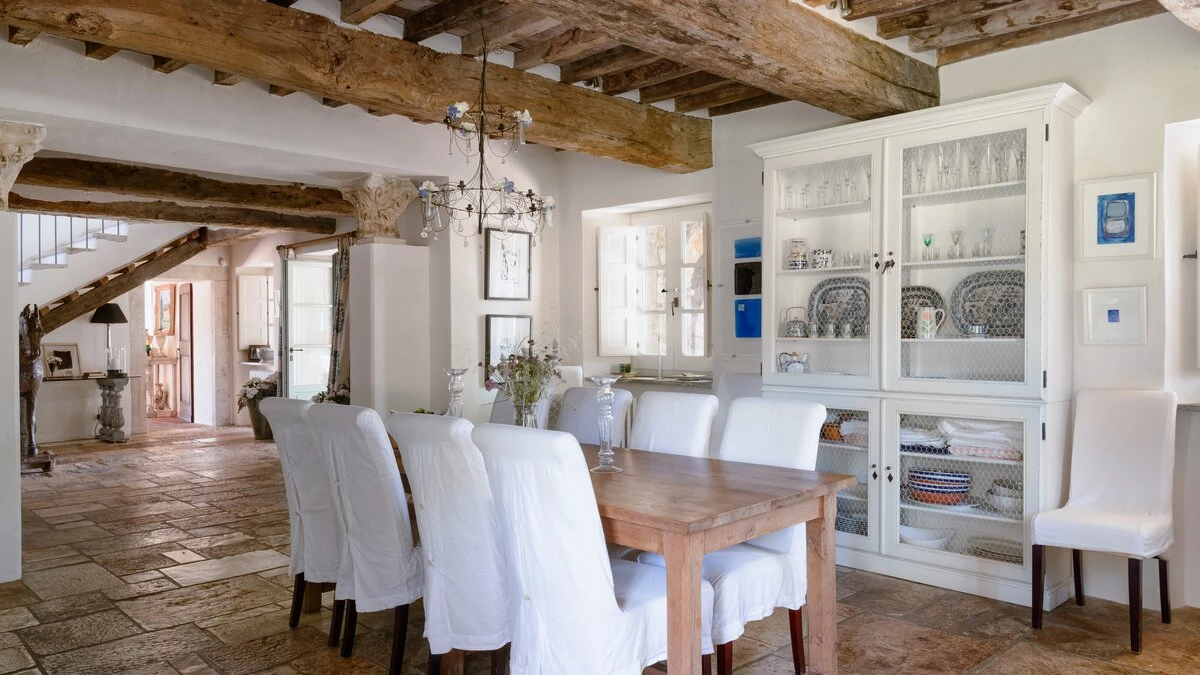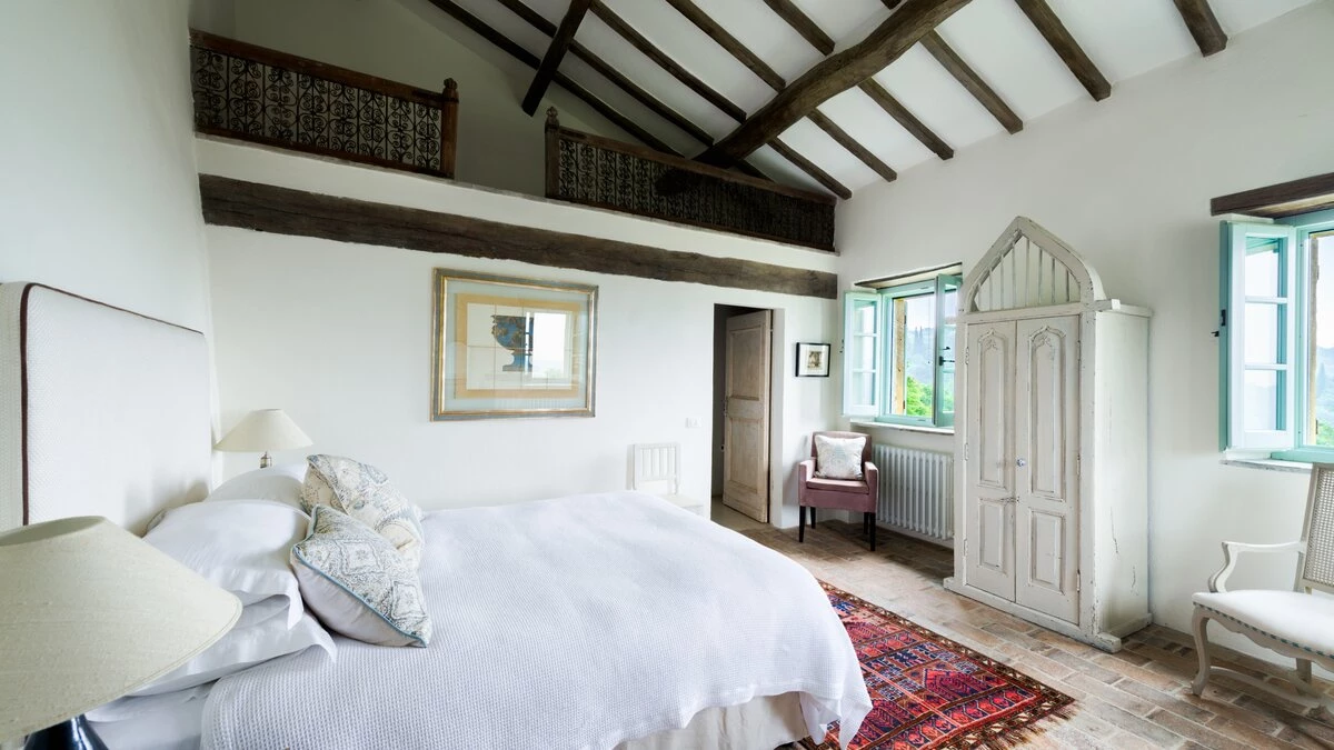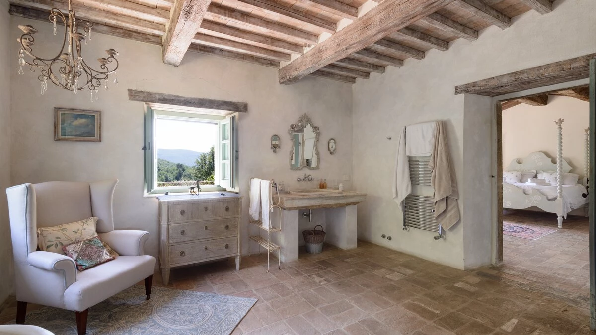 A superb family villa, set in the hills between Cortona and Mercatale, this imposing old manor house is quietly secluded, yet well placed for exploration of both Tuscan and Umbrian towns. Beautifully restored to retain its character features, the villa’s rough-hewn rafters, oak ceilings and stone lintels are now juxtaposed with modern appliances, contemporary comforts and intriguing artefacts, in rooms designed with understated elegance. At the heart of the house a charming drawing room is furnished in fresh blue and white, complemented by a cosy tv room, first floor study and galleried sitting room. With interiors sporting Chelsea Textiles, Percheron and Claremonte fabrics, alongside furniture from all around the world, Maniero di Sorbello is rich in cultural décor, featuring Italian elements, an 18th century Gustavian bookcase, and Roman antiquities.