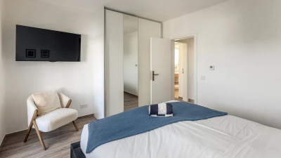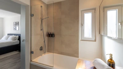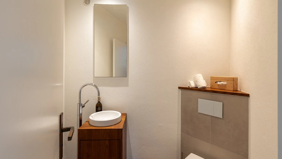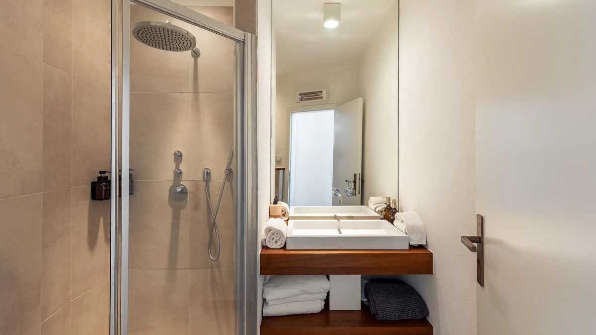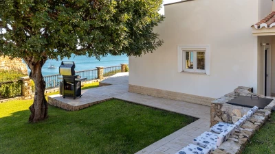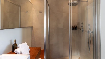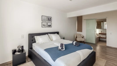 The ground floor welcomes guests with an airy open plan living and dining space, where large glass doors frame the ocean beyond. Contemporary furnishings and neutral tones create a calm and sophisticated feel, while the fully equipped kitchen makes home cooking a pleasure. This level also features a comfortable bedroom with direct access to the terrace, and a modern shower room en suite for added convenience.