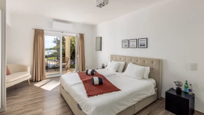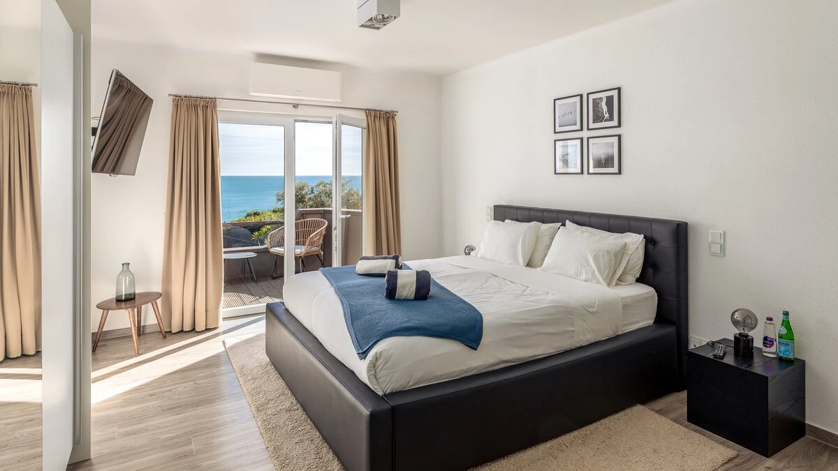 Upstairs, three elegant bedrooms each enjoy panoramic views of the Atlantic. The master suite is particularly special, complete with a private balcony perfect for quiet morning coffees or sunset contemplation. Each bedroom is designed with comfort in mind, featuring soft linens and stylish décor, whilst two bedrooms are complete with en suite bathrooms, finished to the highest standard.