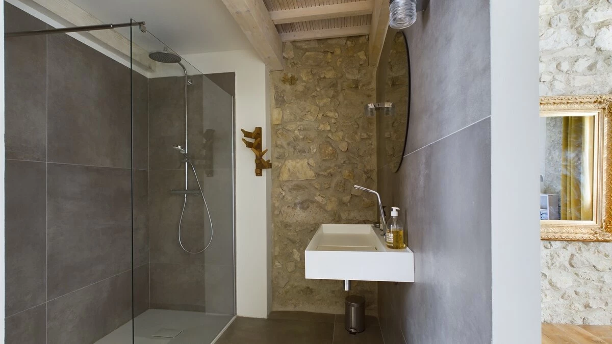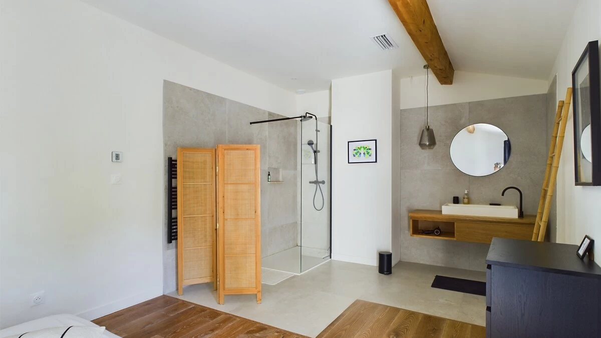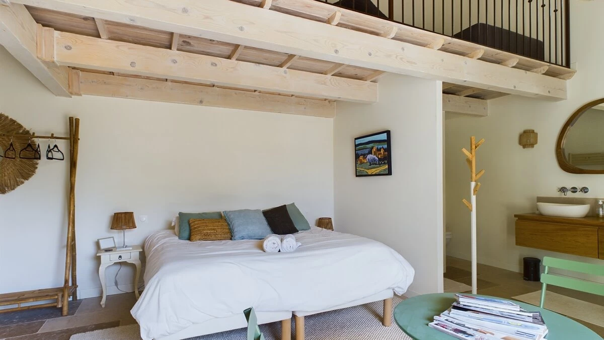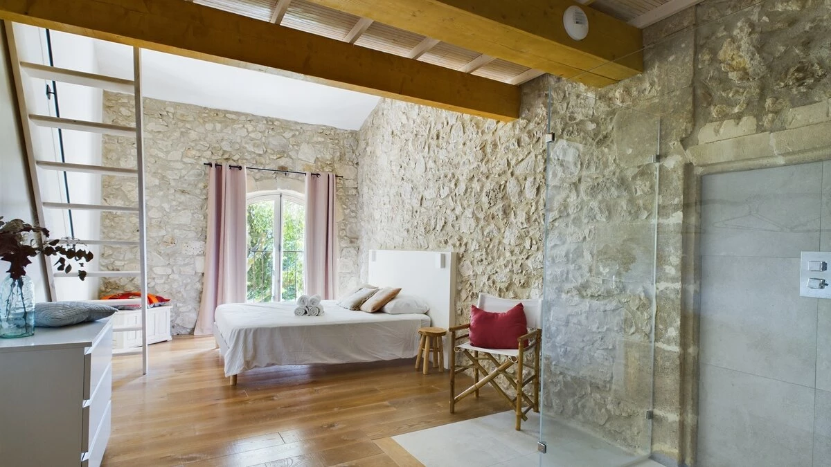 Accommodation is generous and well laid out for larger groups or multi-generational families. Four elegant double bedrooms in the main house each benefit from their own en suite shower room, while a separate annex provides an additional double bedroom with dressing area and bathroom, offering extra privacy and direct access to the pool area.