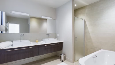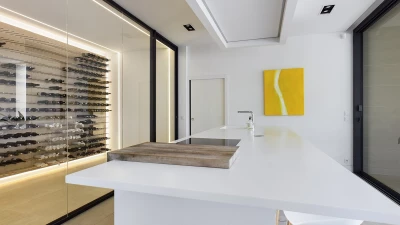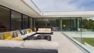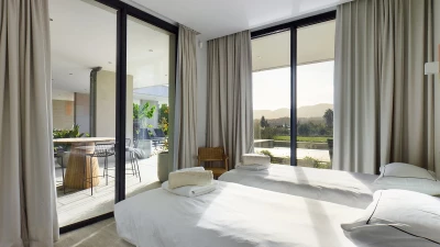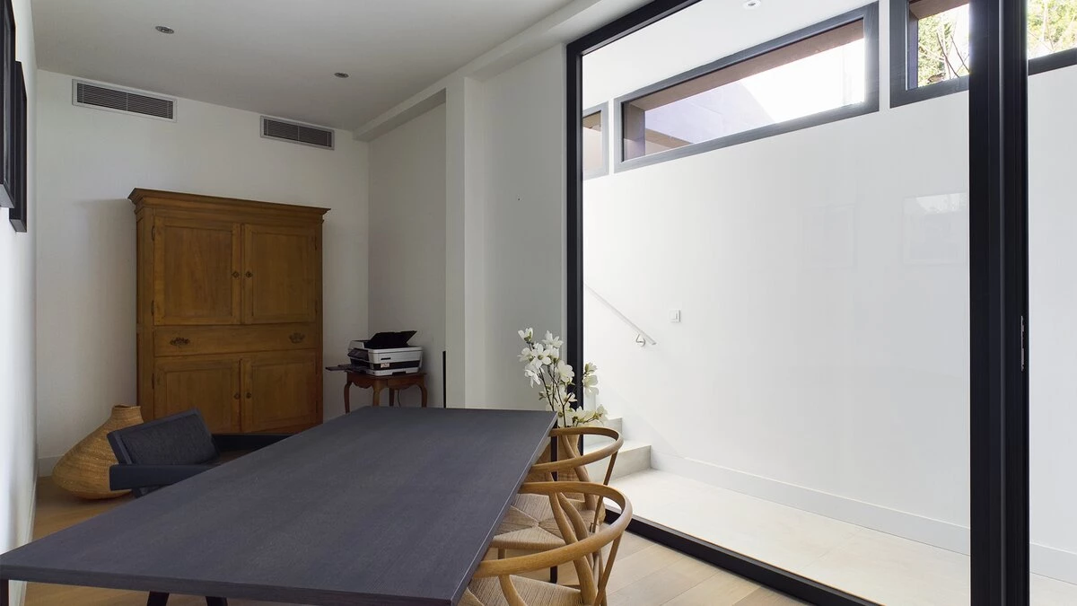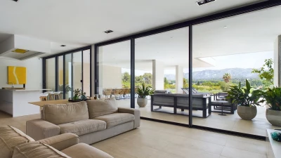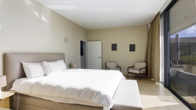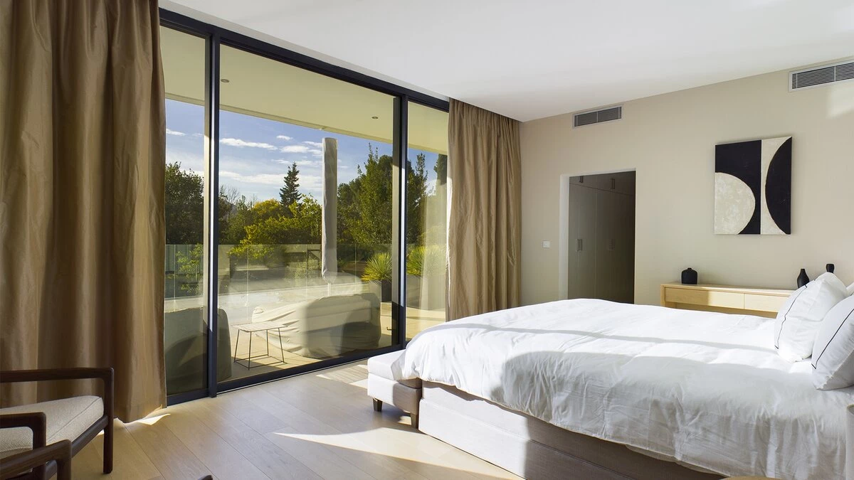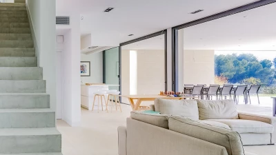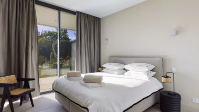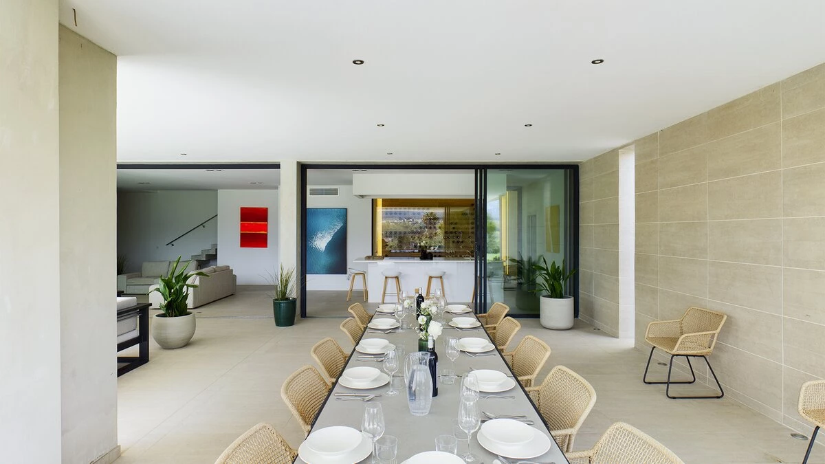 On the ground floor, there is an open plan living, dining and kitchen area, all fully equipped with modern appliances. This space is bright and airy with incredible bifold doors that spread across the whole back walls of the villa, opening up to a terrace area. All rooms are furnished with soft and neutral interiors creating a calm minimalist feel. A master bedroom with bathroom en suite with separate shower is also located on this floor and offers a workspace opening up to the terrace.
