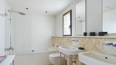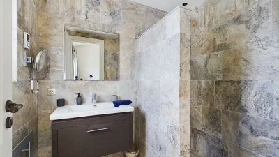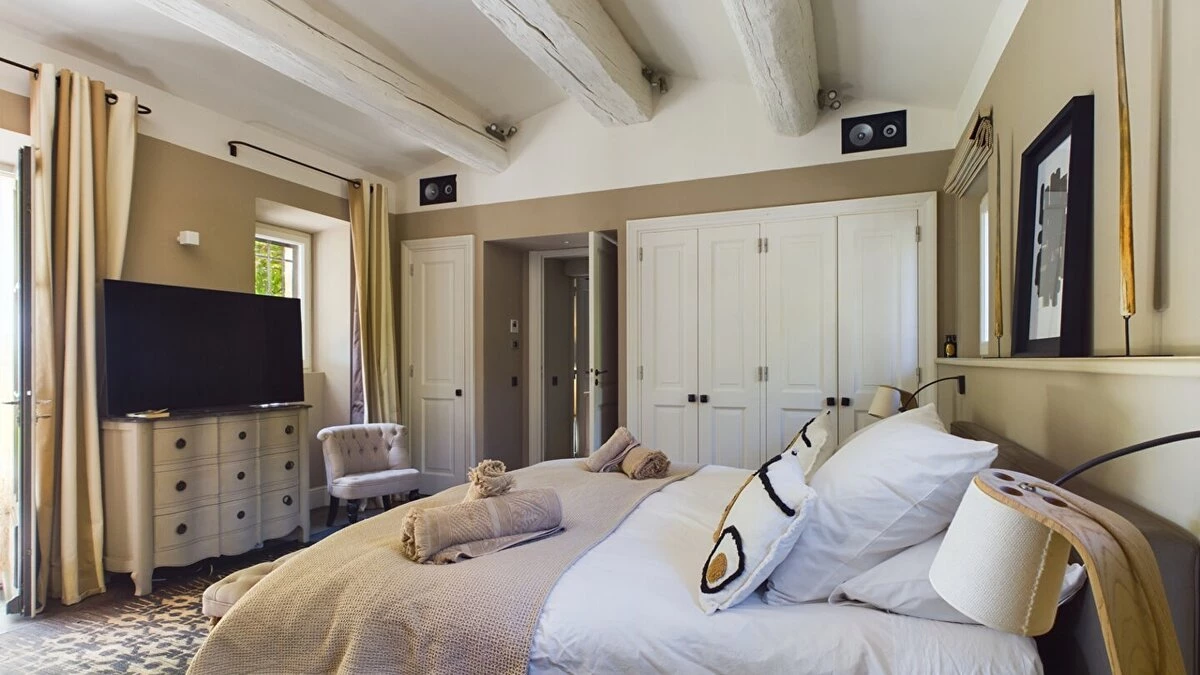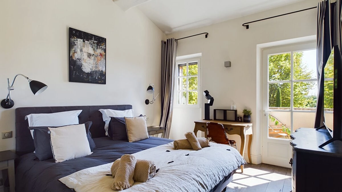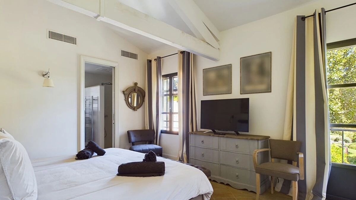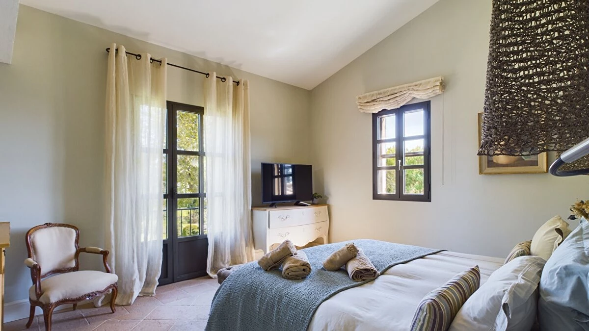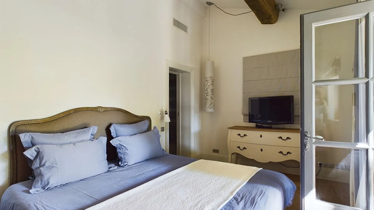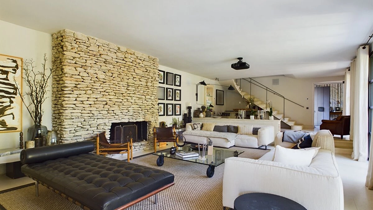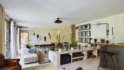 Seven stylish bedrooms accommodate up to 14 guests, each thoughtfully designed to combine Provençal charm with contemporary touches. Two welcoming living areas provide space to unwind, one with a large-screen TV for quiet evenings, the other centred around a striking stone fireplace, perfect for convivial gatherings. The fully equipped kitchen opens onto a sunlit terrace, ideal for preparing meals and dining al fresco in the warmth of the Mediterranean.