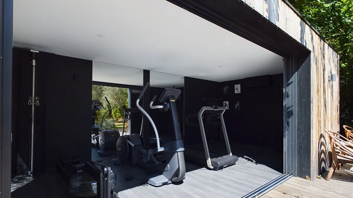 Outside, the 18-metre heated pool is seamlessly integrated into the landscaped grounds, surrounded by loungers for moments of relaxation. A well-equipped fitness area allows guests to stay active, while a secure outdoor play space gives children freedom to explore safely.