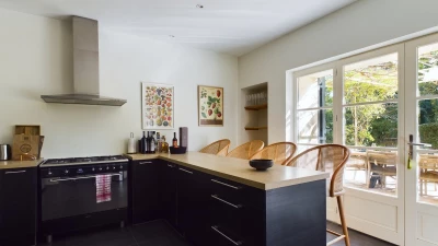 Inside, the ground floor unfolds into a welcoming open-plan living area, where a cosy sitting room with a warming fireplace provides the perfect retreat on cooler evenings, while a generously sized dining space encourages convivial gatherings with family and friends. The stylish, fully equipped kitchen offers modern convenience and direct access to the sun-drenched terrace and outdoor dining area. For added flexibility, a double bedroom with an en suite shower room is conveniently located on this level — ideal for multi-generational families or guests seeking easy access.